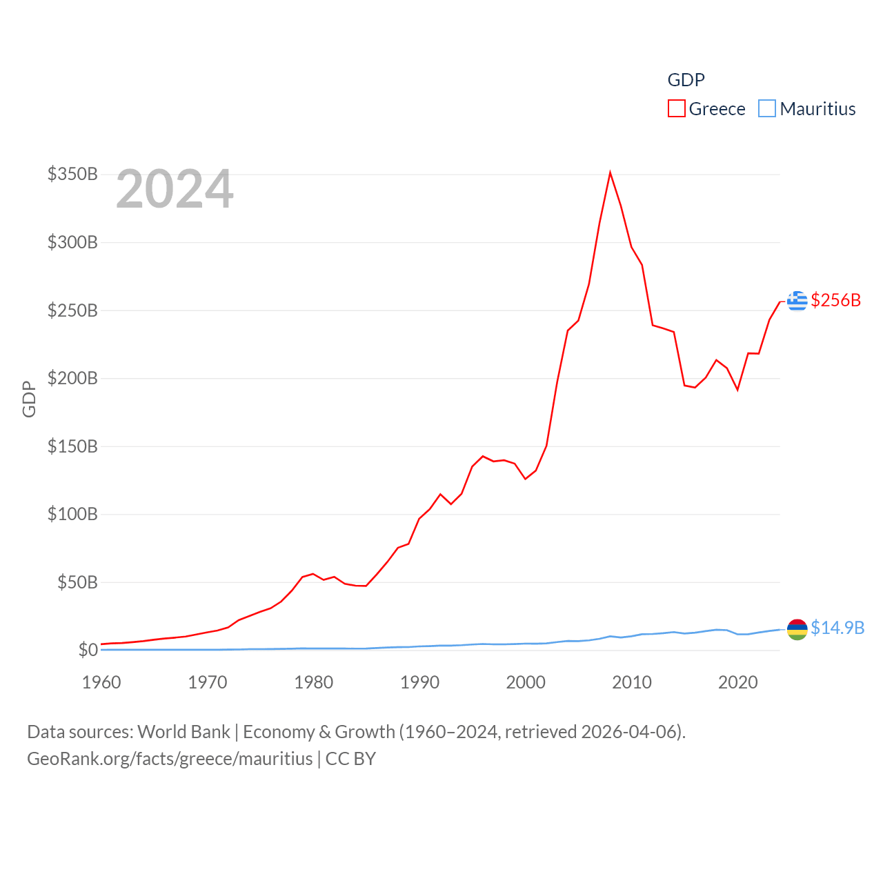 By GDP, Greece ranks 53/197 ($256B) and Mauritius ranks 143/197 ($14.9B). By GDP per capita, Greece ranks 49/197 ($24,626), while Mauritius ranks 78/197 ($11,991).