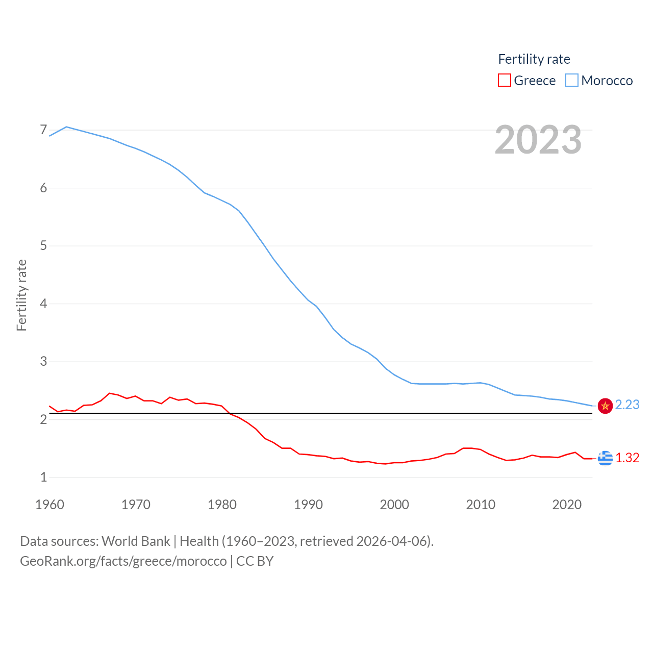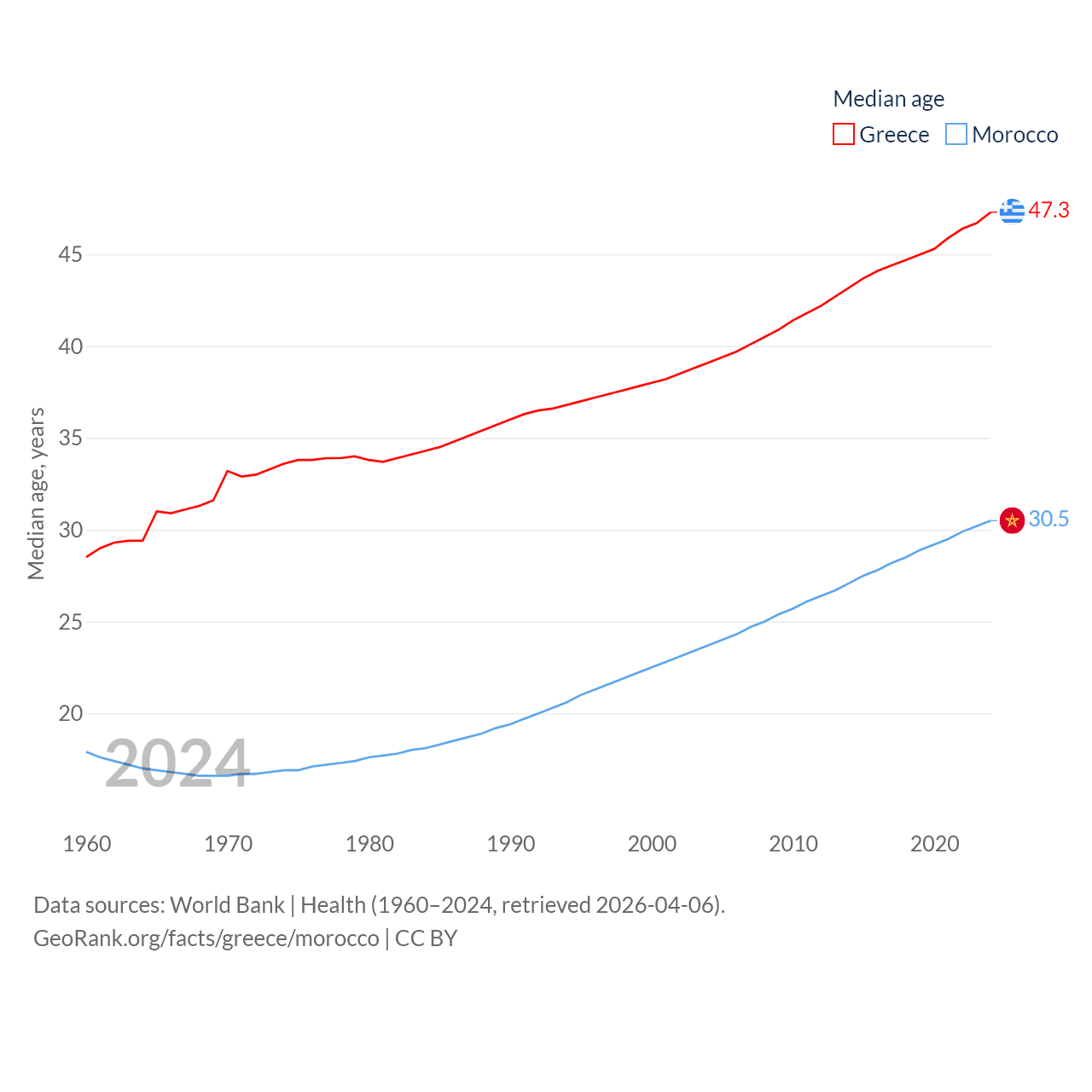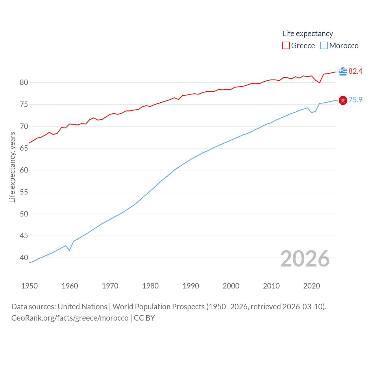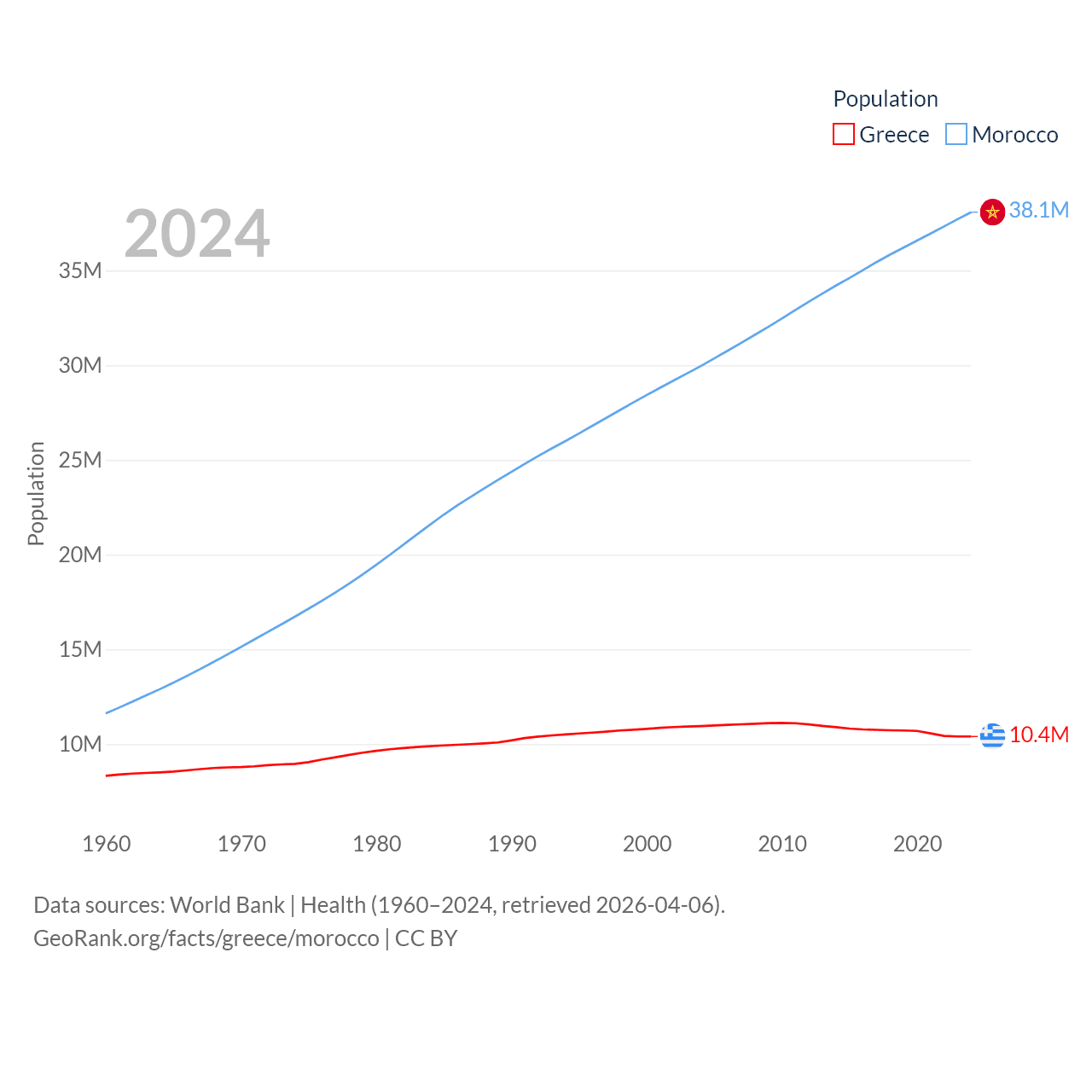 Greece has a population of 10.4M (ranked 94/197), compared with 38.1M in Morocco (ranked 39/197). Greece's land area is 49,769 sq mi versus 172,317 sq mi for Morocco (ranked 95th vs. 55th).