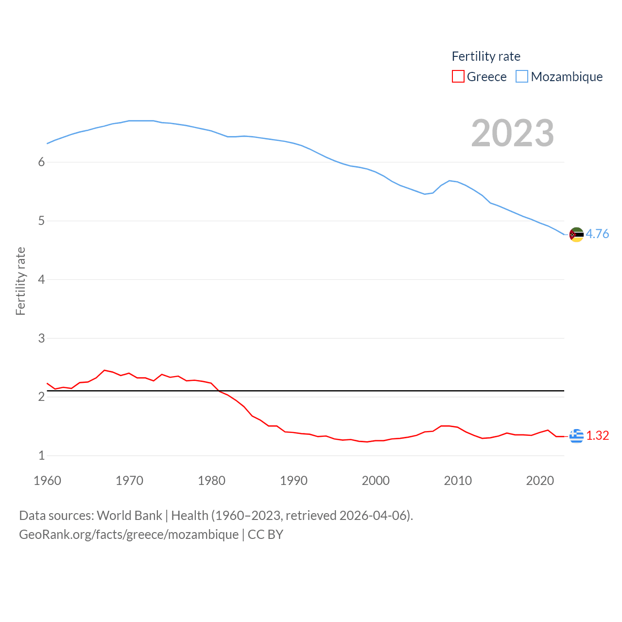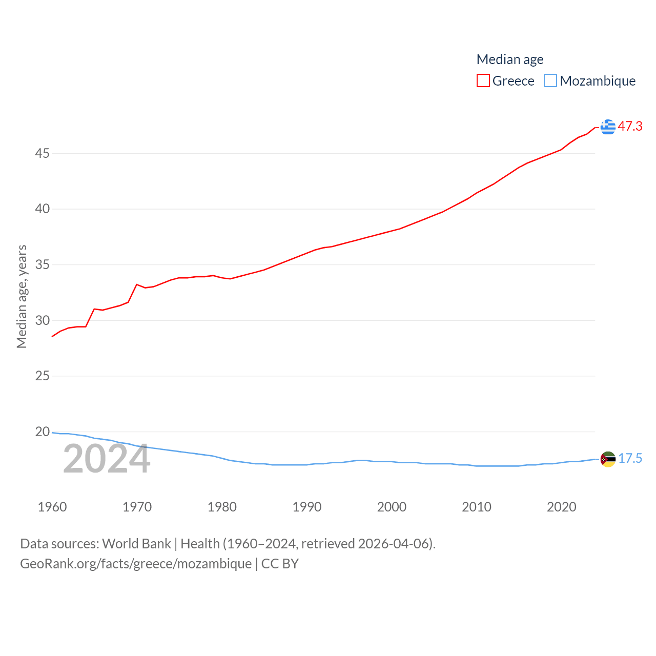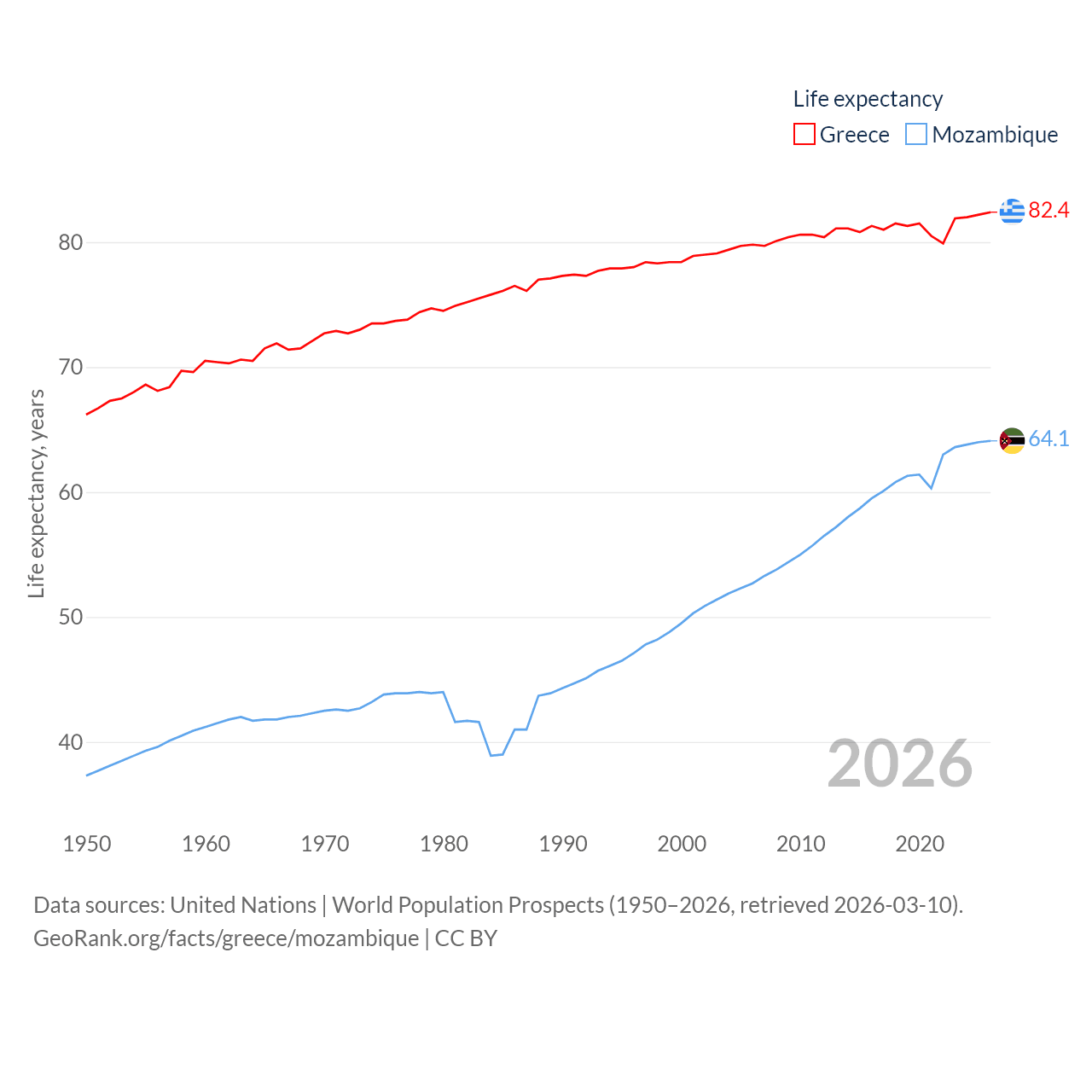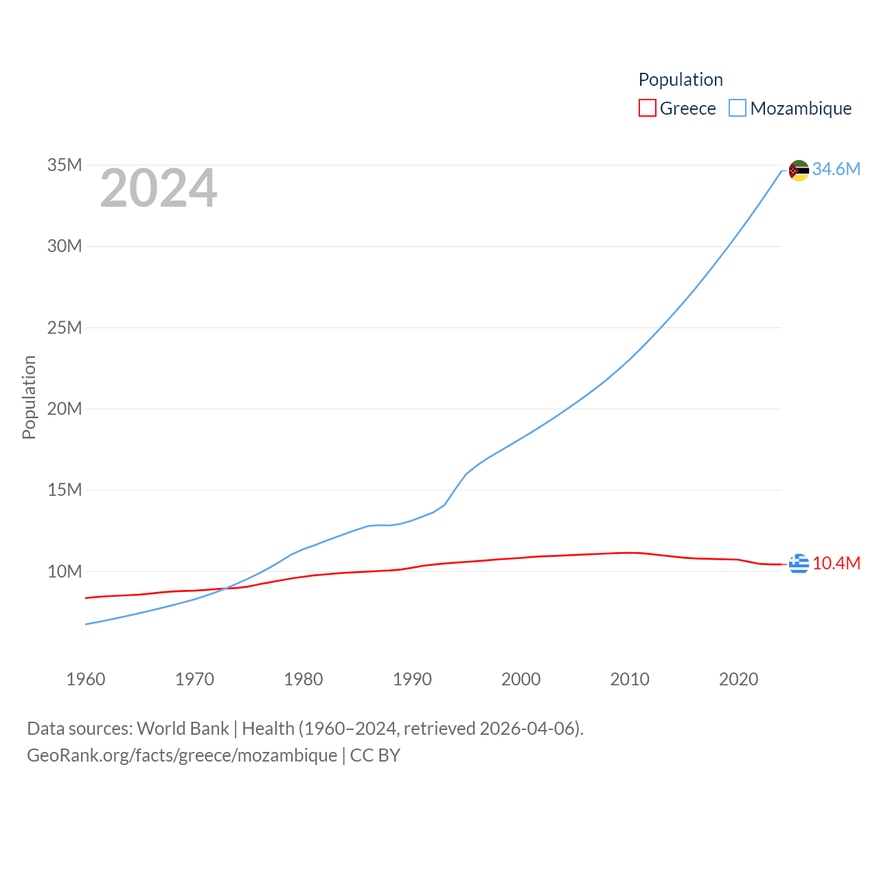 Greece has a population of 10.4M (ranked 94/197), compared with 34.6M in Mozambique (ranked 46/197). Greece's land area is 49,769 sq mi versus 303,623 sq mi for Mozambique (ranked 95th vs. 34th).