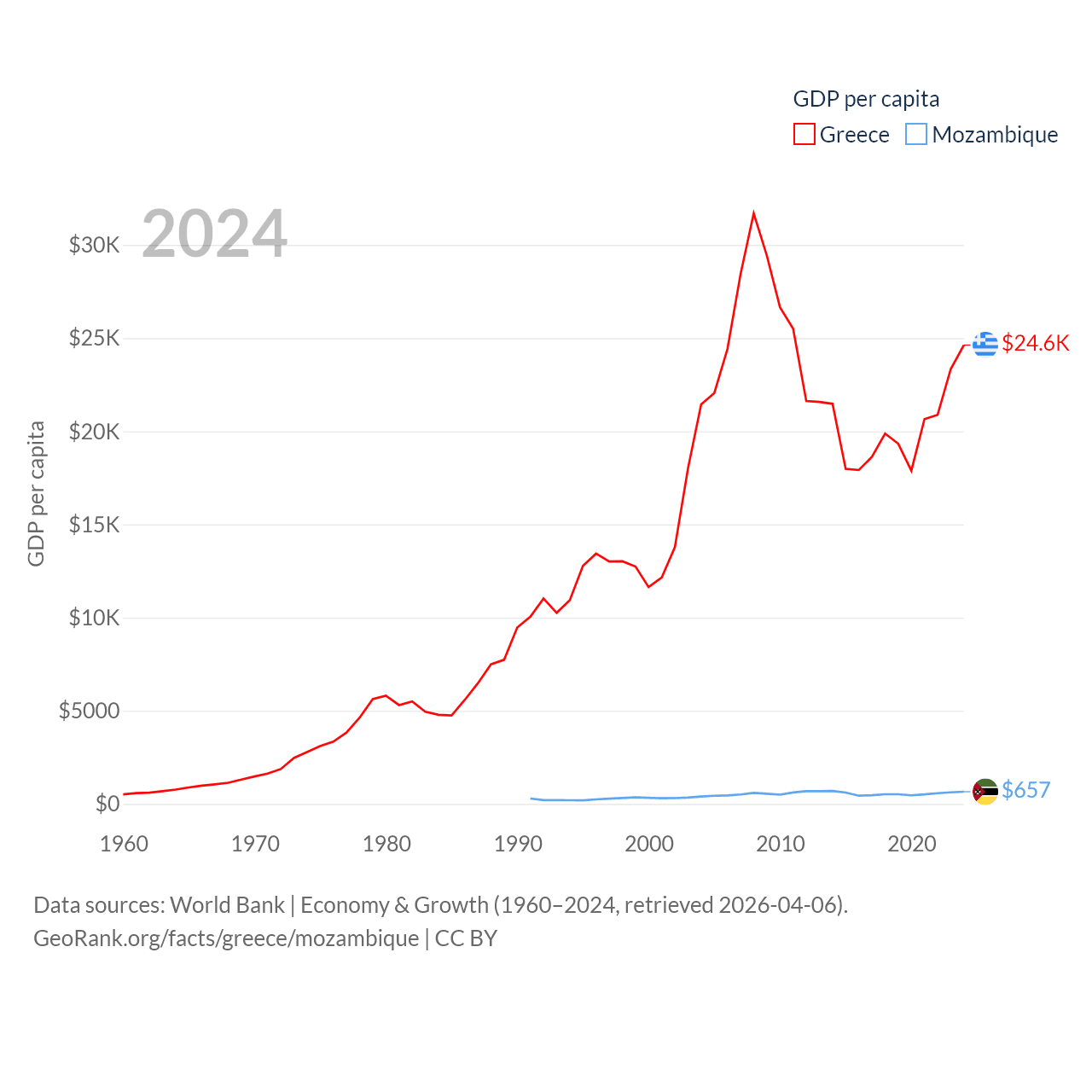 By GDP, Greece ranks 53/197 ($256B) and Mozambique ranks 123/197 ($22.7B). By GDP per capita, Greece ranks 49/197 ($24,626), while Mozambique ranks 189/197 ($657).