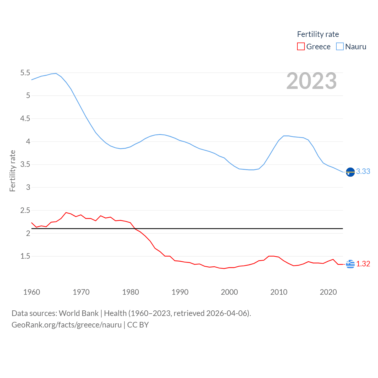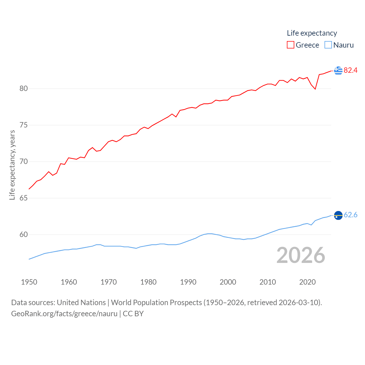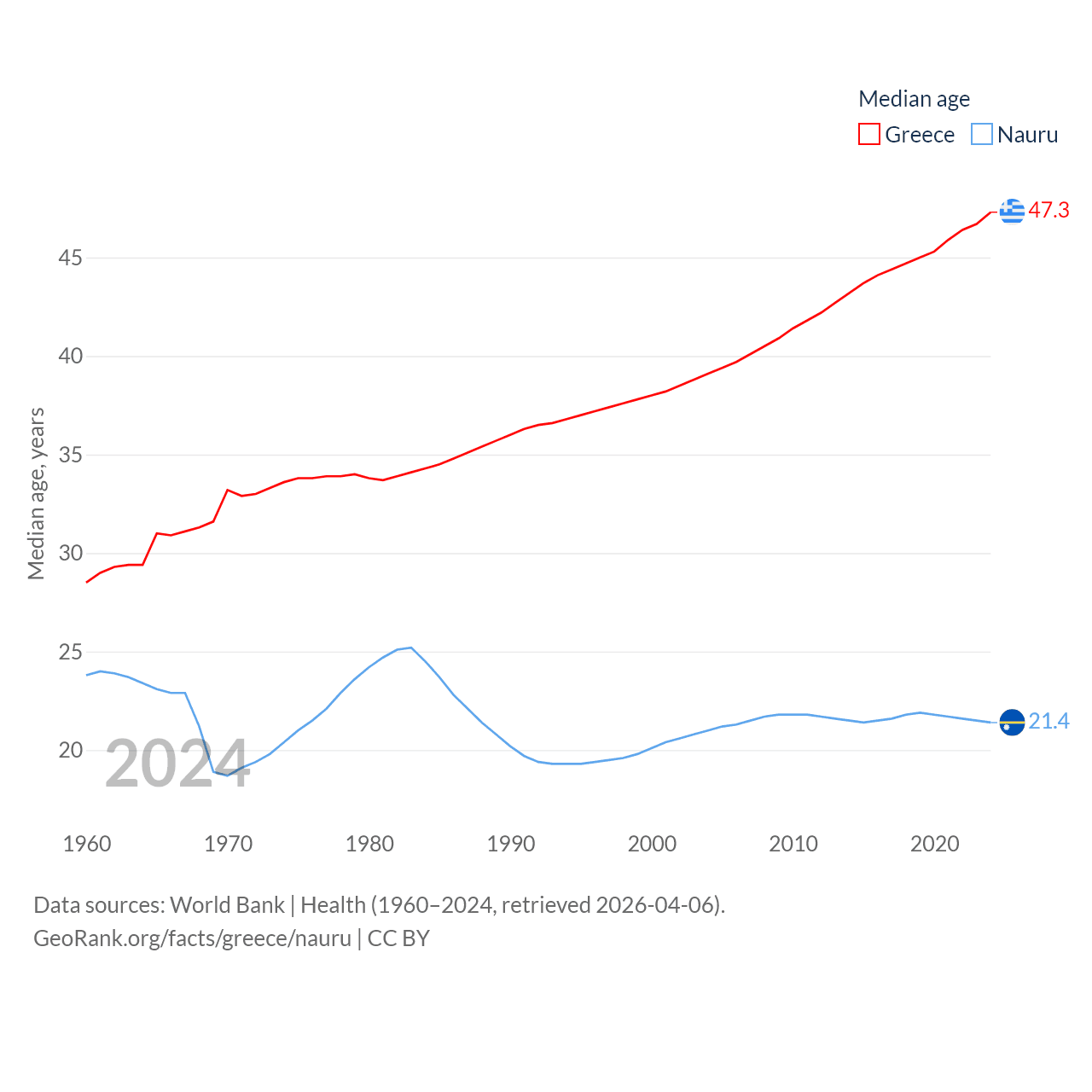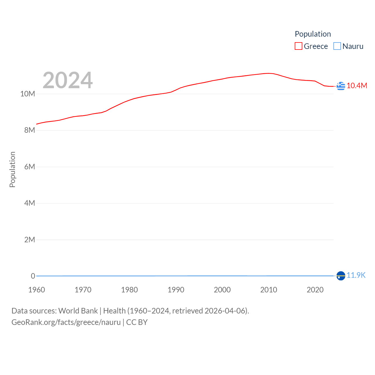 Greece has a population of 10.4M (ranked 94/197), compared with 11.9K in Nauru (ranked 195/197). Greece's land area is 49,769 sq mi versus 7.72 sq mi for Nauru (ranked 95th vs. 195th).