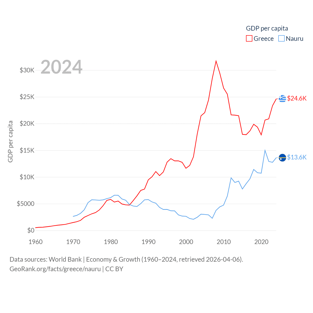 By GDP, Greece ranks 53/197 ($256B) and Nauru ranks 195/197 ($163M). By GDP per capita, Greece ranks 49/197 ($24,626), while Nauru ranks 74/197 ($13,609).