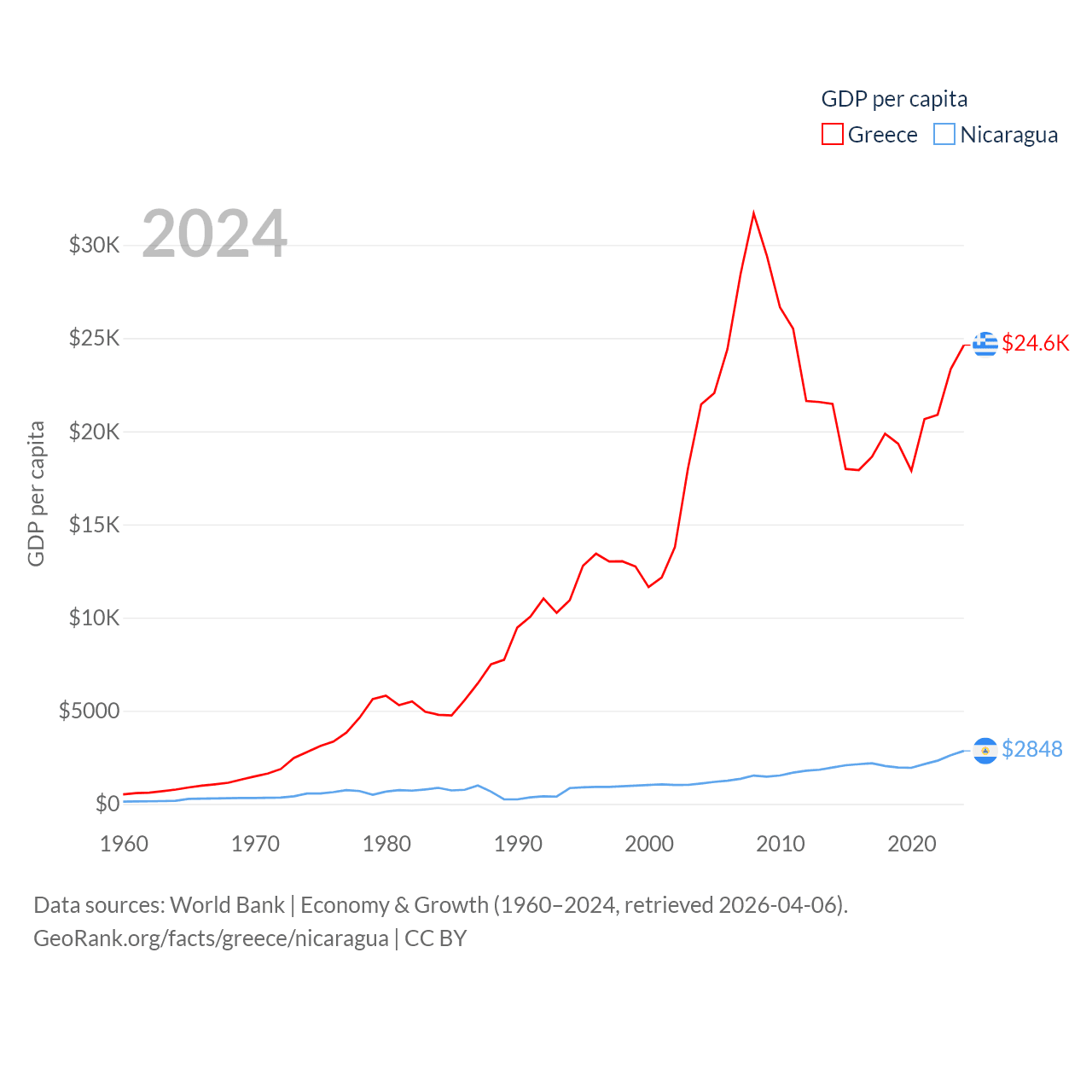 By GDP, Greece ranks 53/197 ($256B) and Nicaragua ranks 131/197 ($19.7B). By GDP per capita, Greece ranks 49/197 ($24,626), while Nicaragua ranks 141/197 ($2,848).