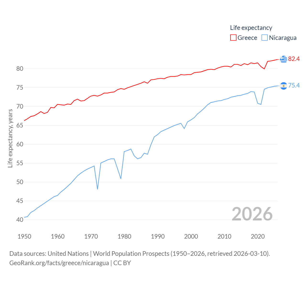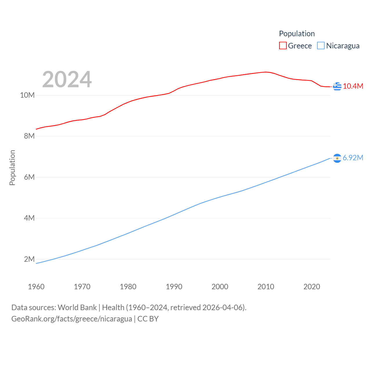 Greece has a population of 10.4M (ranked 94/197), compared with 6.92M in Nicaragua (ranked 108/197). Greece's land area is 49,769 sq mi versus 46,464 sq mi for Nicaragua (ranked 95th vs. 98th).