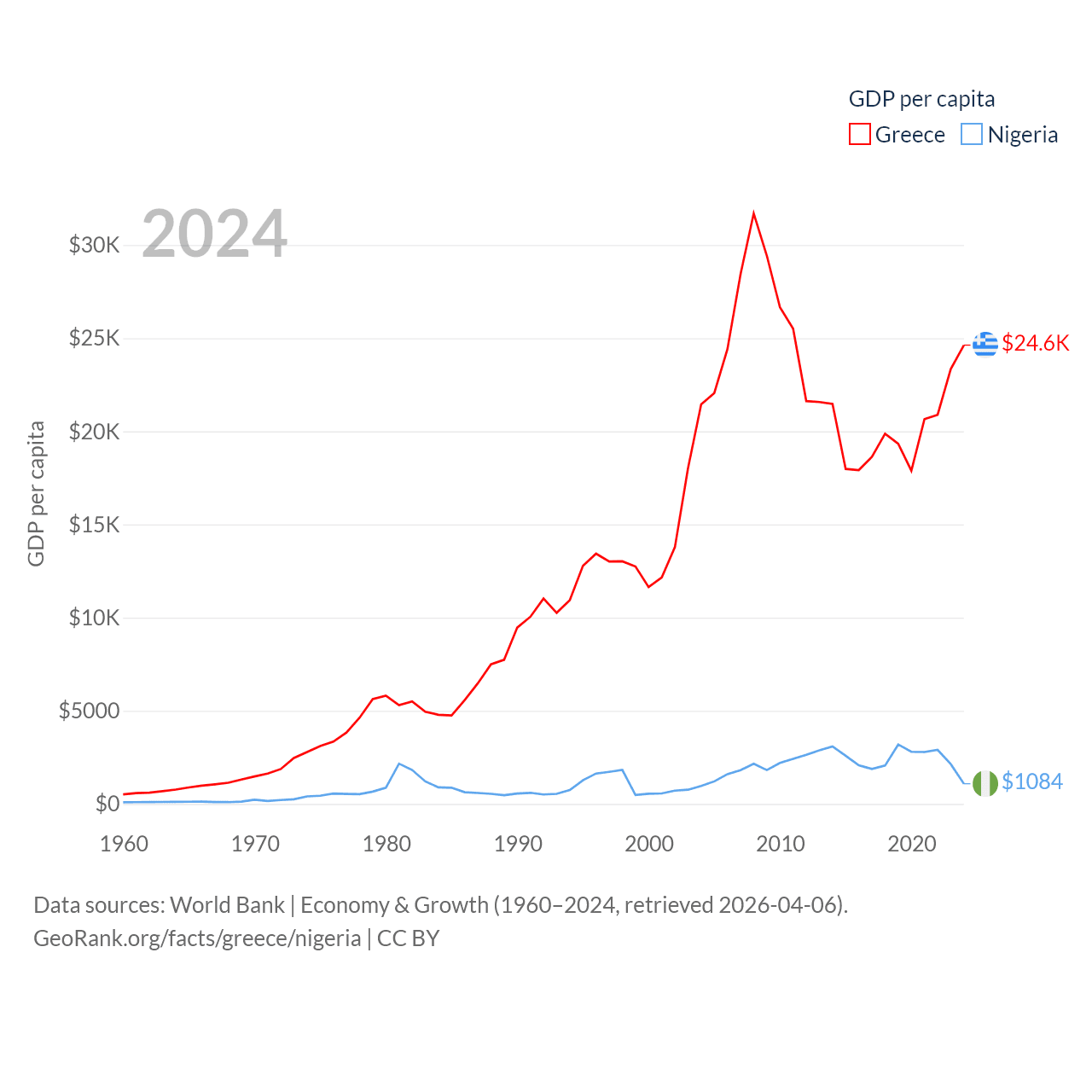 By GDP, Greece ranks 53/197 ($256B) and Nigeria ranks 54/197 ($252B). By GDP per capita, Greece ranks 49/197 ($24,626), while Nigeria ranks 174/197 ($1,084).