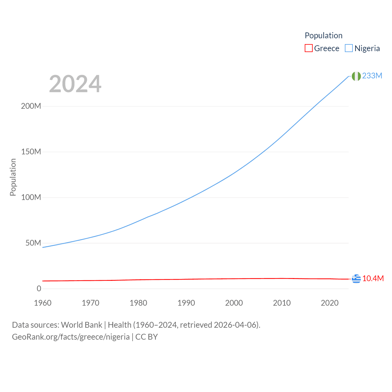 Greece has a population of 10.4M (ranked 94/197), compared with 233M in Nigeria (ranked 6/197). Greece's land area is 49,769 sq mi versus 351,650 sq mi for Nigeria (ranked 95th vs. 30th).