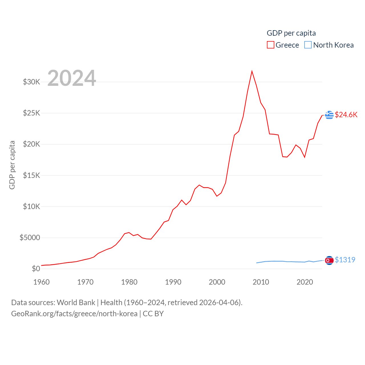 By GDP, Greece ranks 53/197 ($256B) and North Korea ranks 106/197 ($34.9B). By GDP per capita, Greece ranks 49/197 ($24,626), while North Korea ranks 168/197 ($1,319).
