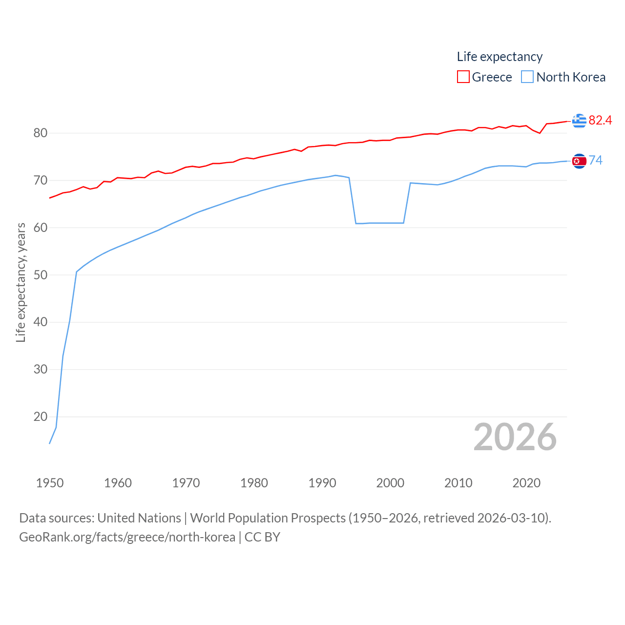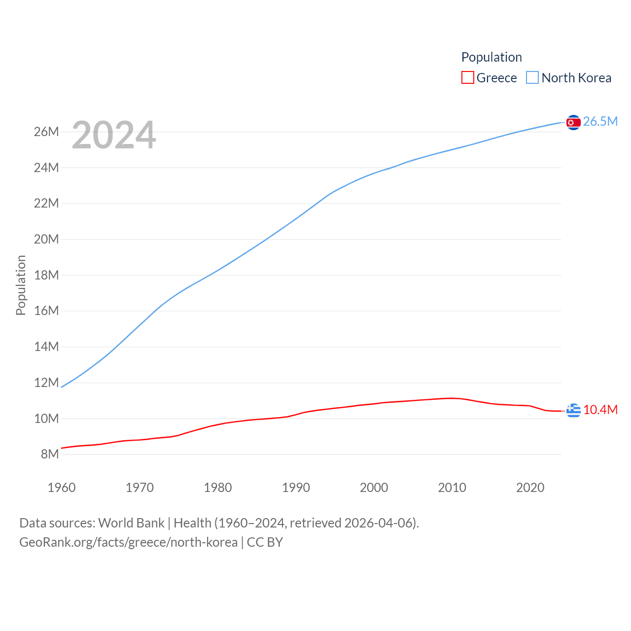 Greece has a population of 10.4M (ranked 94/197), compared with 26.5M in North Korea (ranked 56/197). Greece's land area is 49,769 sq mi versus 46,491 sq mi for North Korea (ranked 95th vs. 97th).
