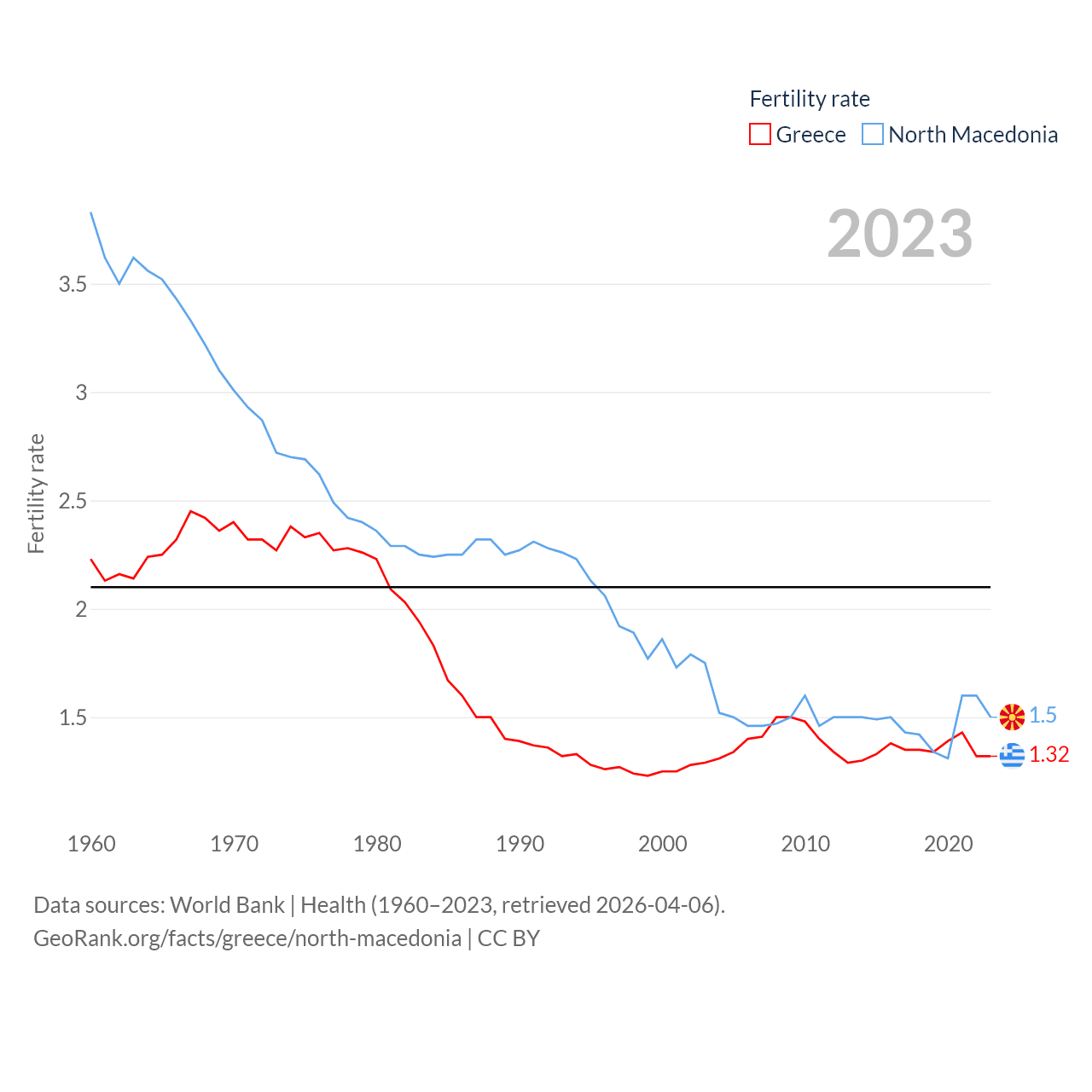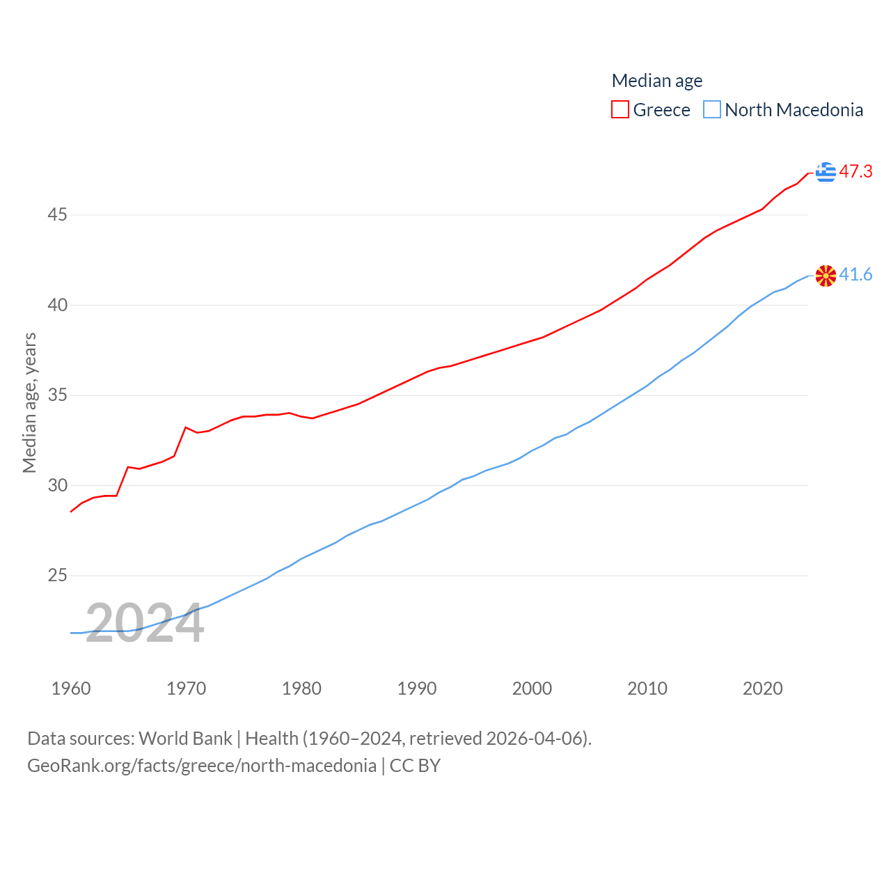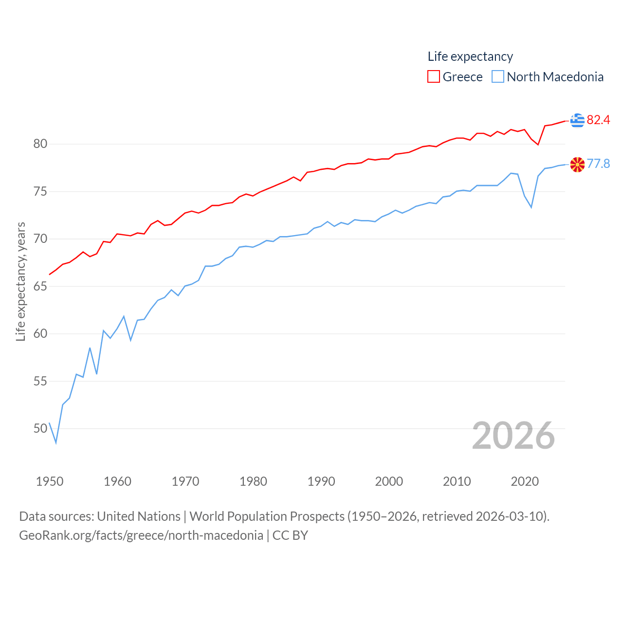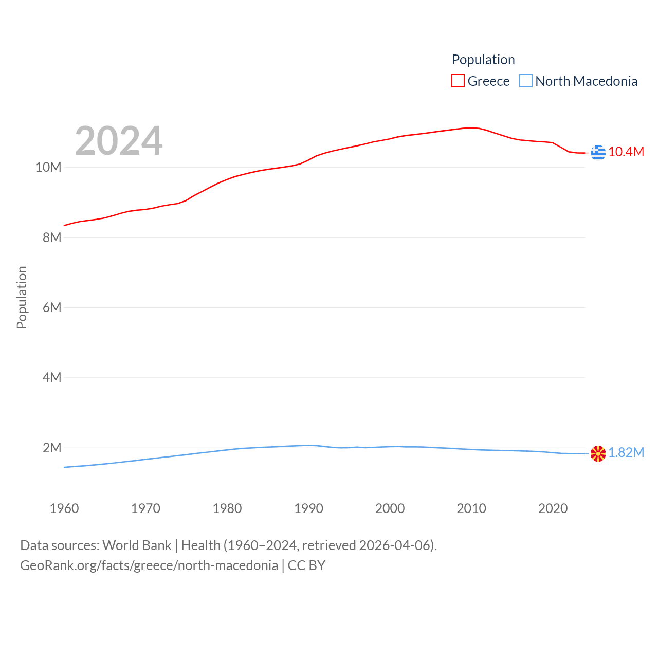 Greece has a population of 10.4M (ranked 94/197), compared with 1.82M in North Macedonia (ranked 150/197). Greece's land area is 49,769 sq mi versus 9,737 sq mi for North Macedonia (ranked 95th vs. 145th).