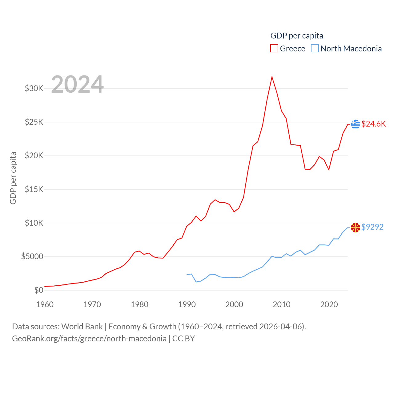 By GDP, Greece ranks 53/197 ($256B) and North Macedonia ranks 138/197 ($17B). By GDP per capita, Greece ranks 49/197 ($24,626), while North Macedonia ranks 88/197 ($9,292).