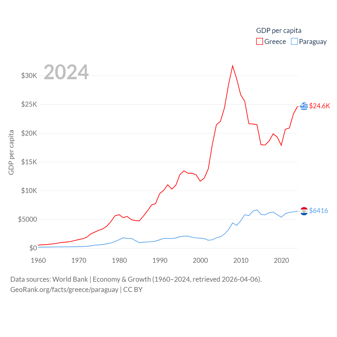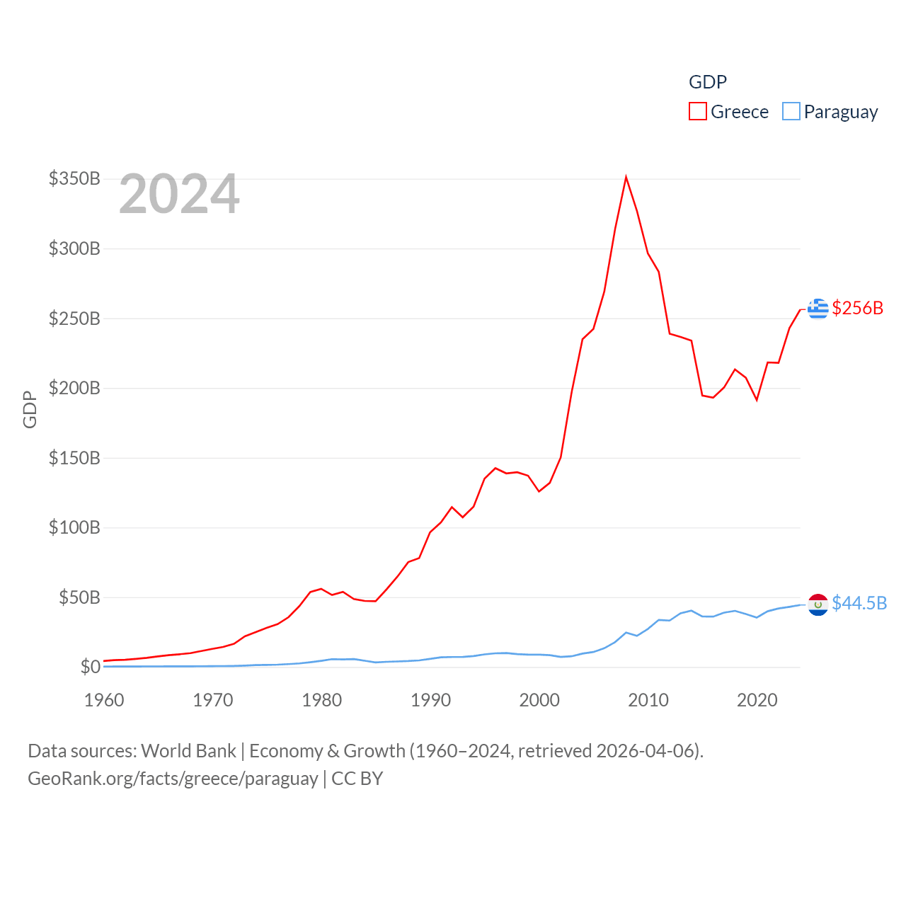 By GDP, Greece ranks 53/197 ($256B) and Paraguay ranks 98/197 ($44.5B). By GDP per capita, Greece ranks 49/197 ($24,626), while Paraguay ranks 109/197 ($6,416).