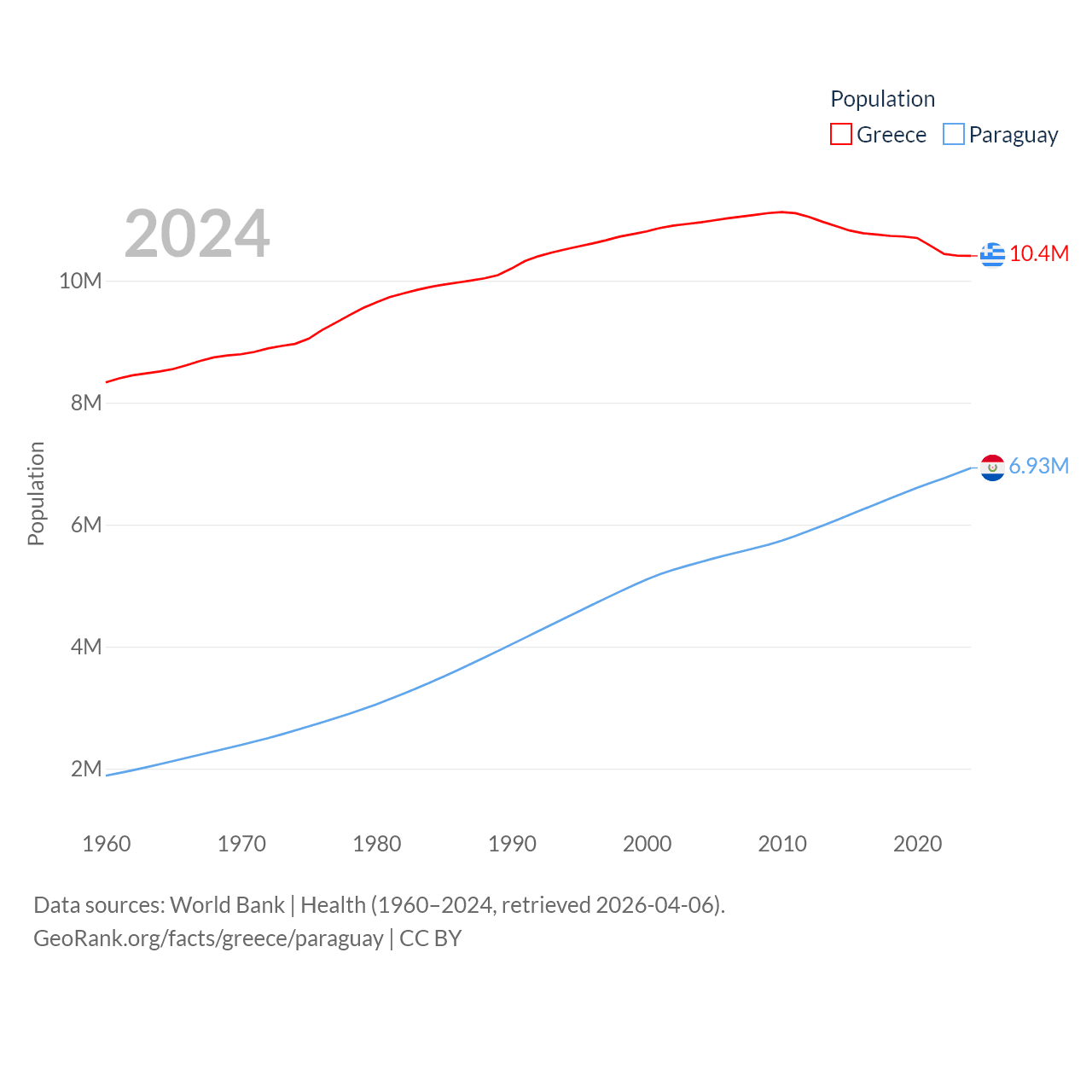 Greece has a population of 10.4M (ranked 94/197), compared with 6.93M in Paraguay (ranked 107/197). Greece's land area is 49,769 sq mi versus 152,901 sq mi for Paraguay (ranked 95th vs. 59th).