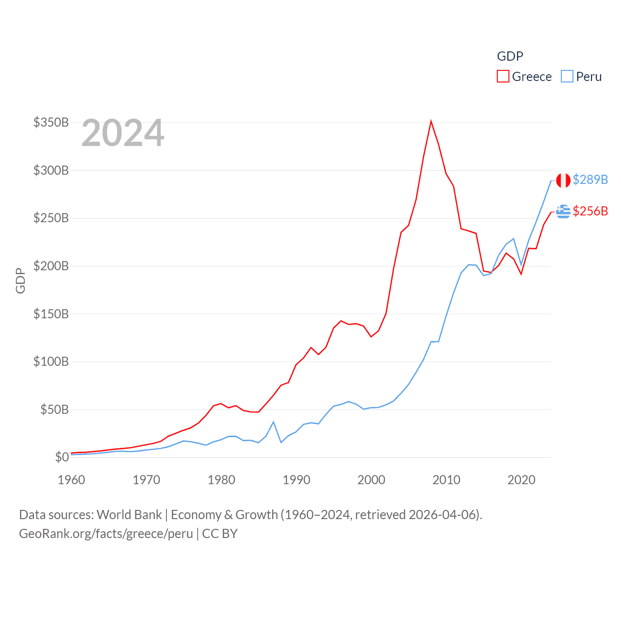 By GDP, Greece ranks 53/197 ($256B) and Peru ranks 49/197 ($289B). By GDP per capita, Greece ranks 49/197 ($24,626), while Peru ranks 91/197 ($8,452).