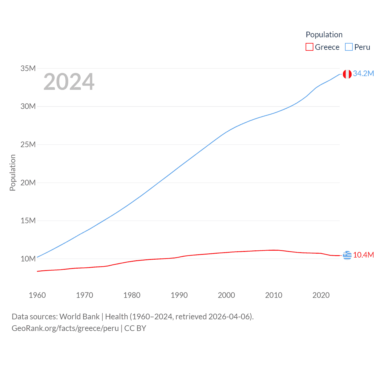 Greece has a population of 10.4M (ranked 94/197), compared with 34.2M in Peru (ranked 48/197). Greece's land area is 49,769 sq mi versus 494,211 sq mi for Peru (ranked 95th vs. 19th).