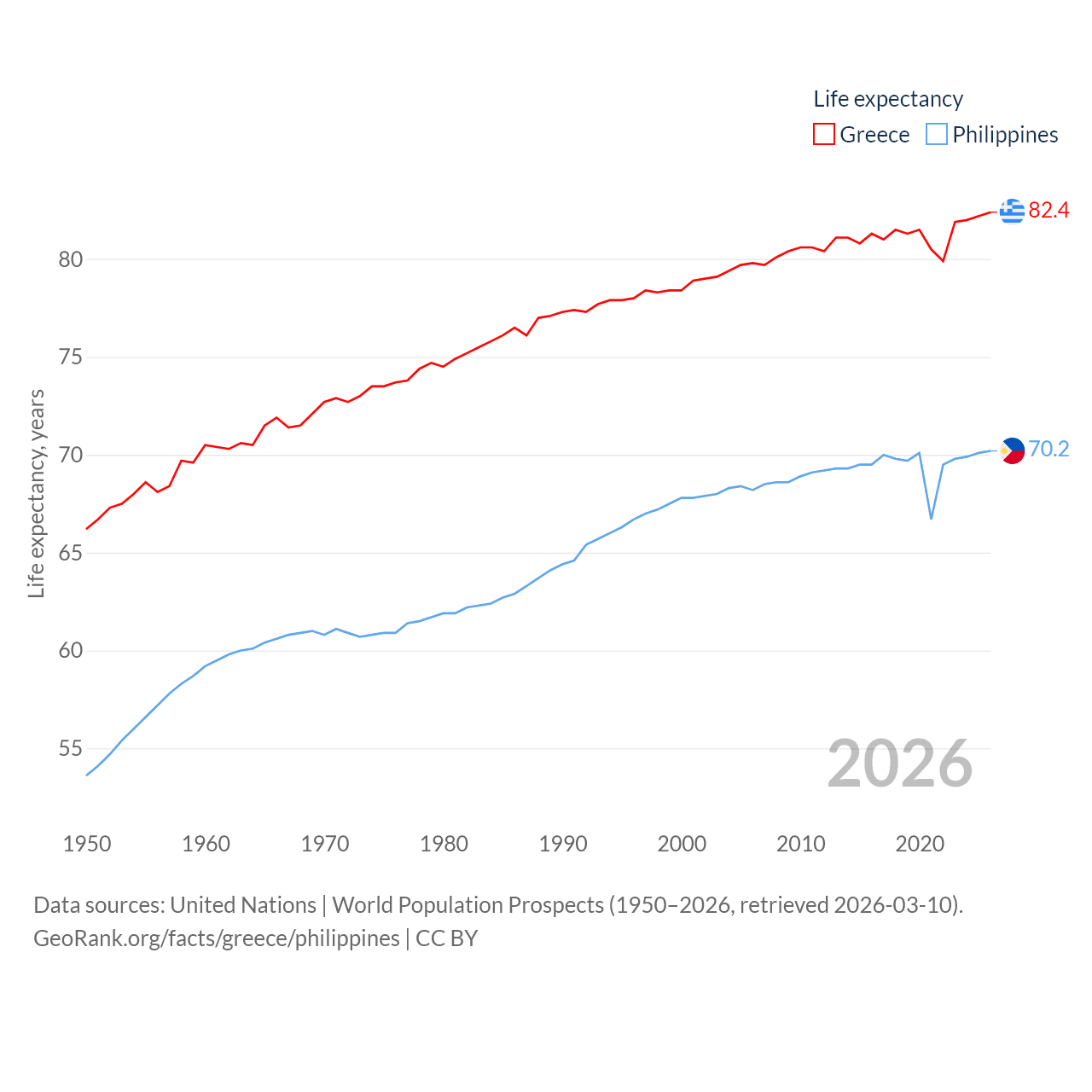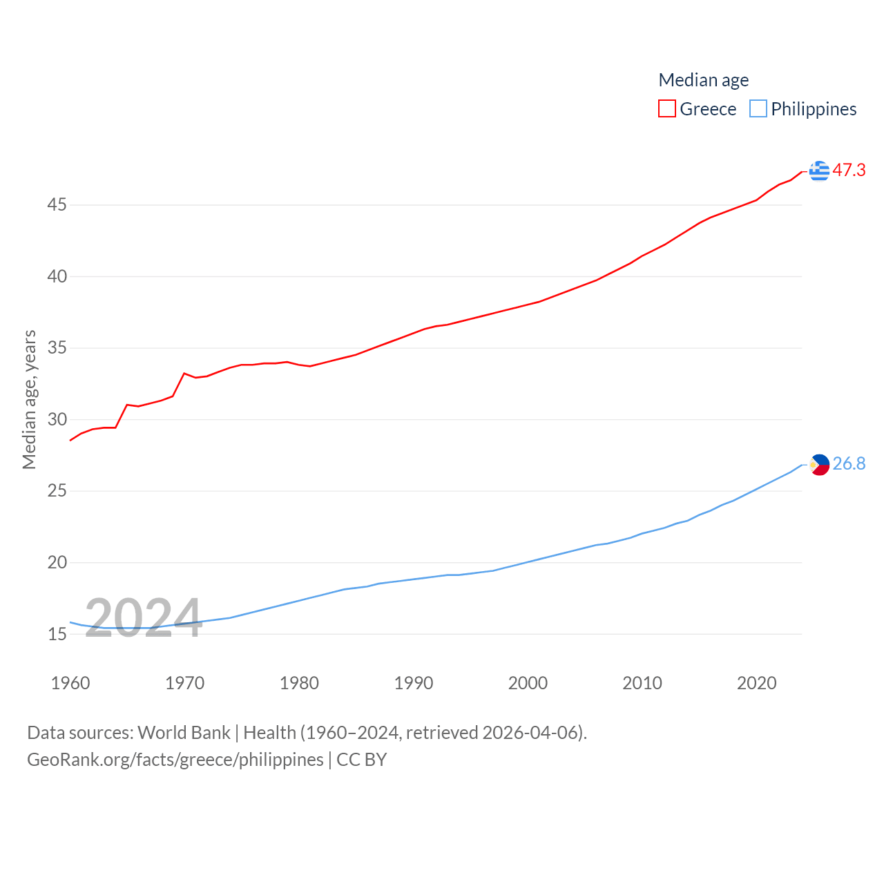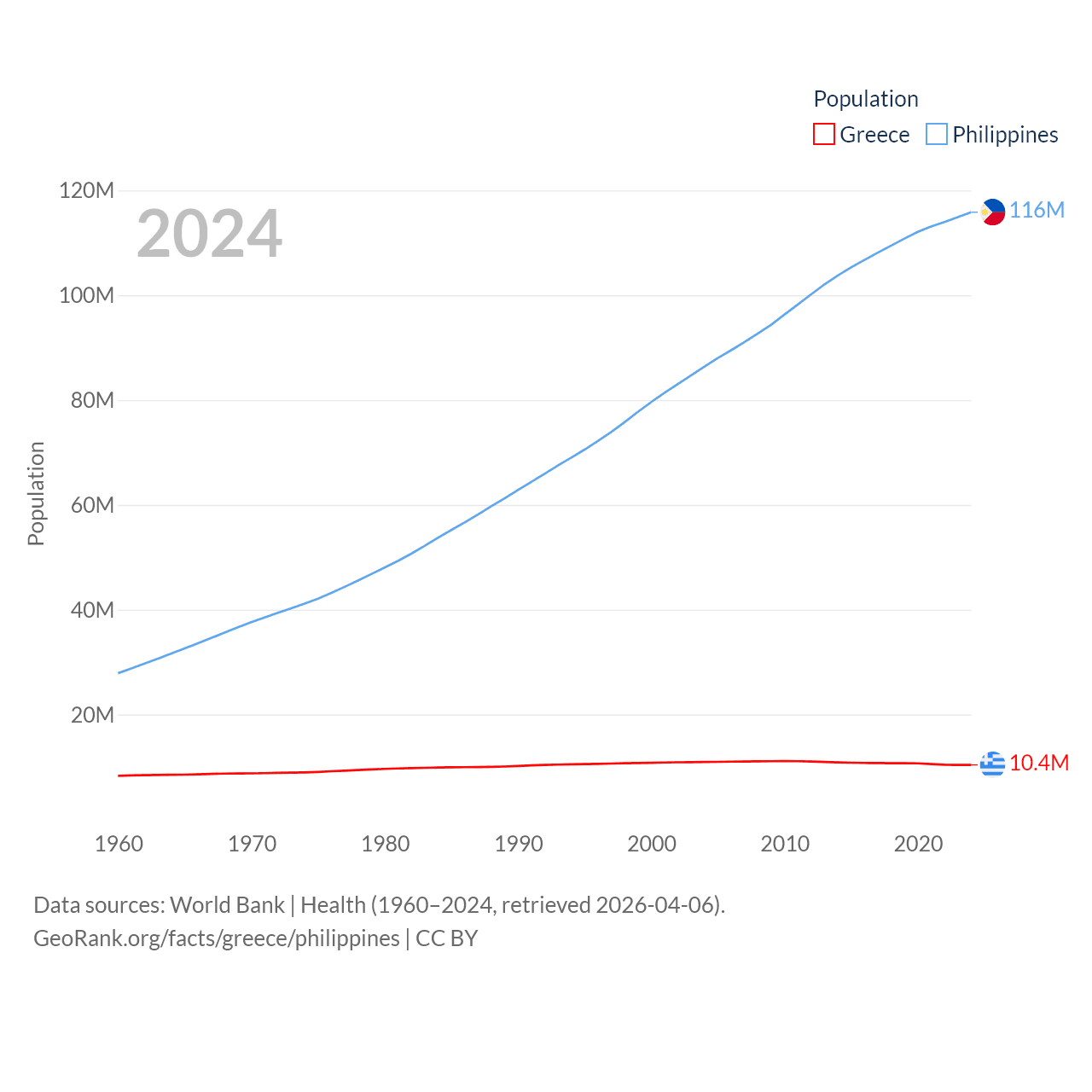 Greece has a population of 10.4M (ranked 94/197), compared with 116M in The Philippines (ranked 14/197). Greece's land area is 49,769 sq mi versus 115,124 sq mi for The Philippines (ranked 95th vs. 71st).