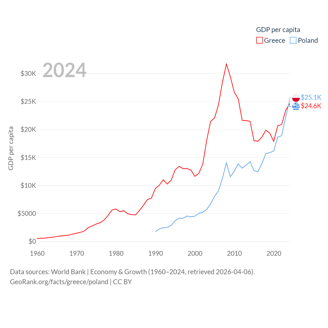 By GDP, Greece ranks 53/197 ($256B) and Poland ranks 21/197 ($918B). By GDP per capita, Greece ranks 49/197 ($24,626), while Poland ranks 48/197 ($25,104).