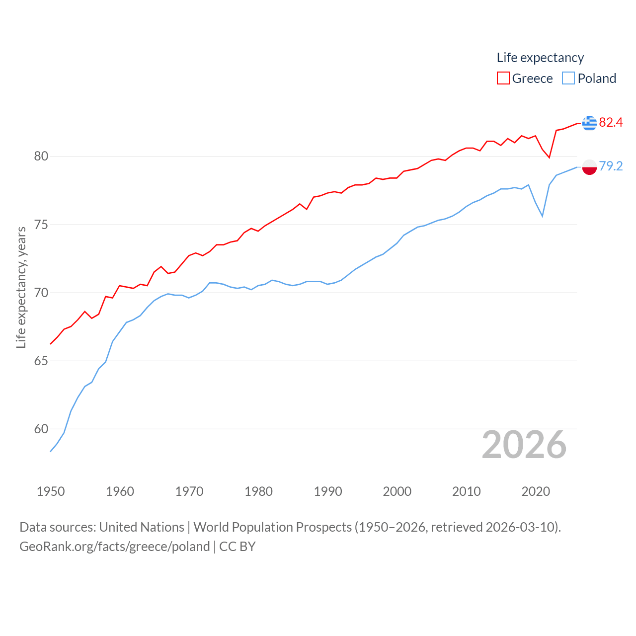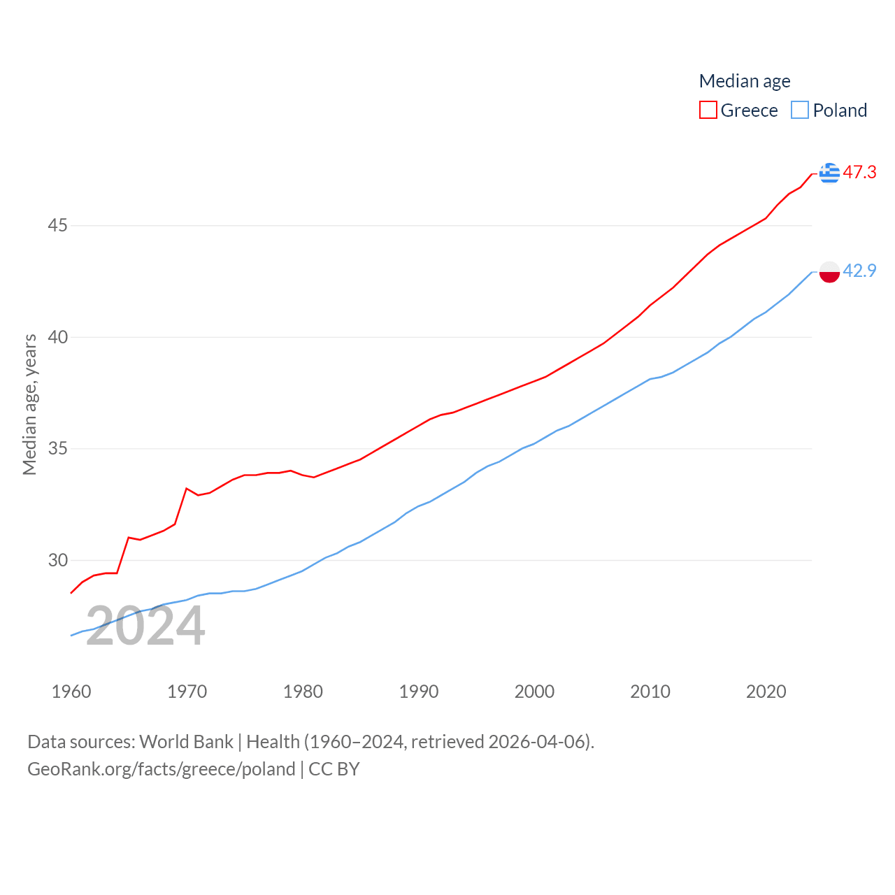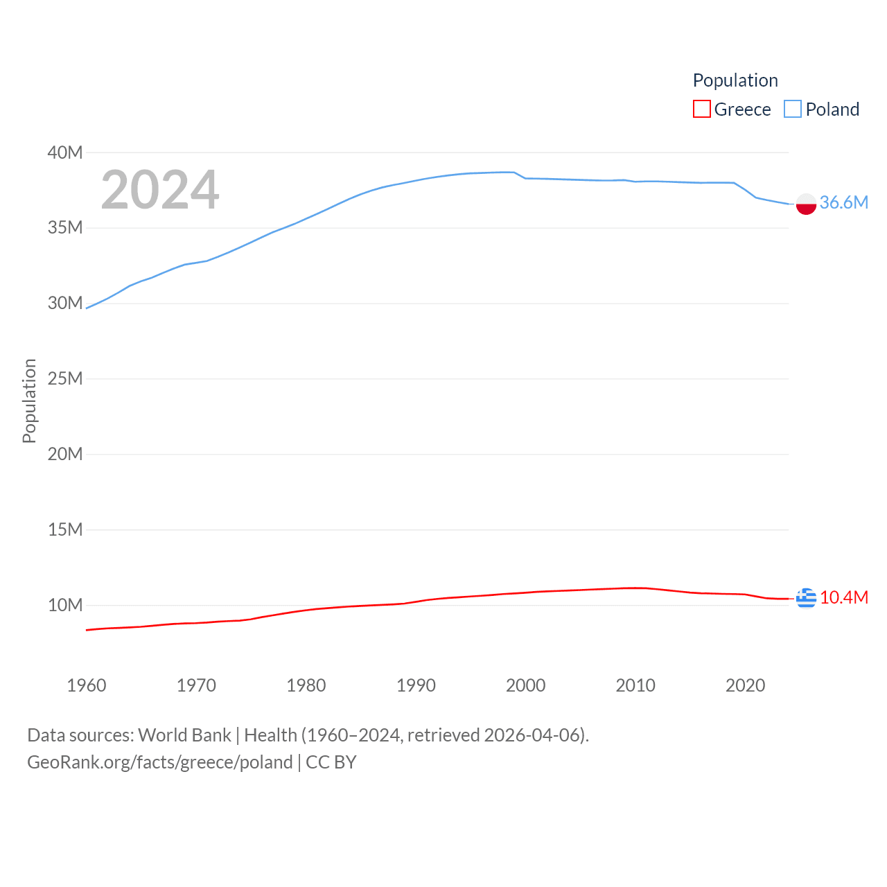 Greece has a population of 10.4M (ranked 94/197), compared with 36.6M in Poland (ranked 42/197). Greece's land area is 49,769 sq mi versus 118,252 sq mi for Poland (ranked 95th vs. 69th).
