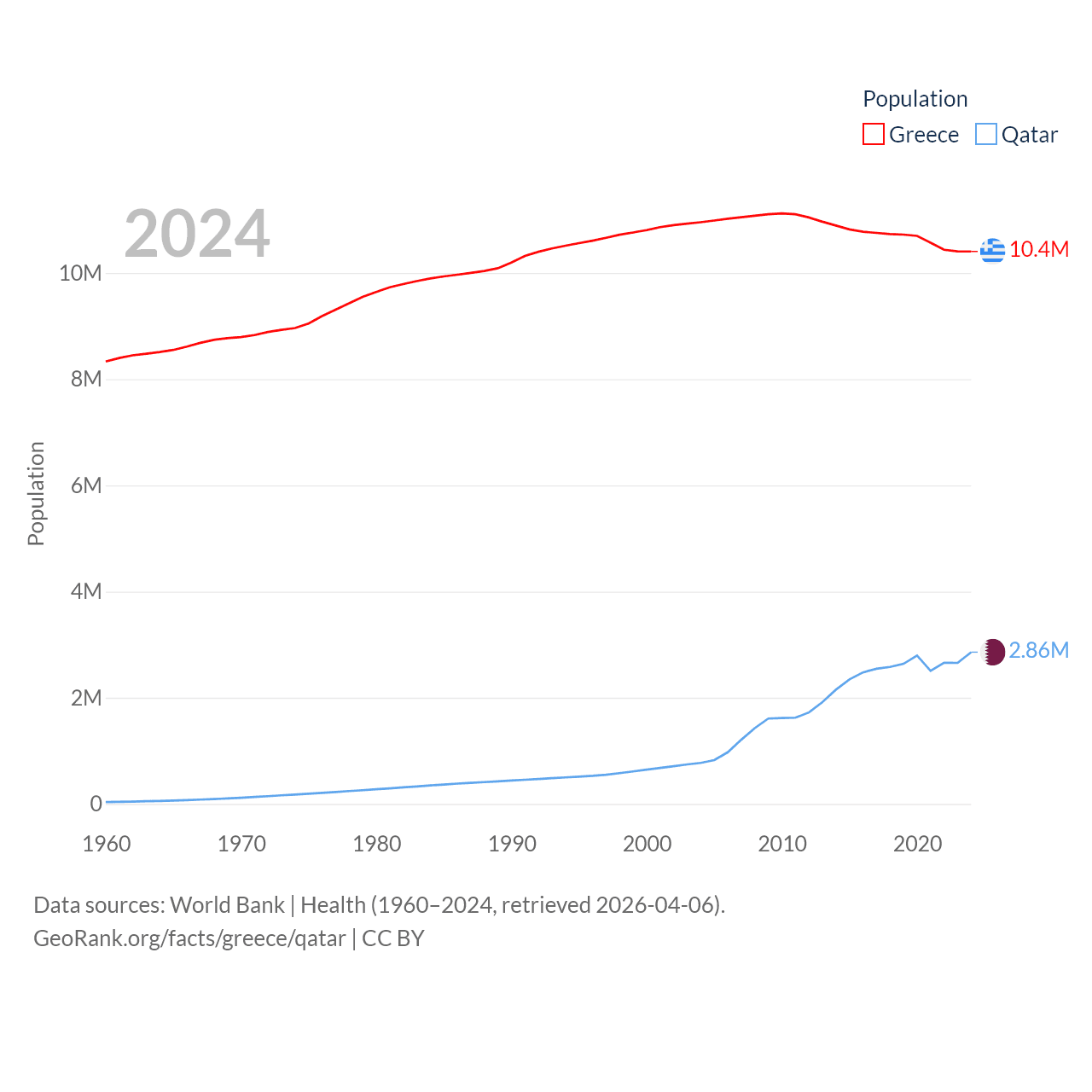 Greece has a population of 10.4M (ranked 94/197), compared with 2.86M in Qatar (ranked 138/197). Greece's land area is 49,769 sq mi versus 4,436 sq mi for Qatar (ranked 95th vs. 158th).