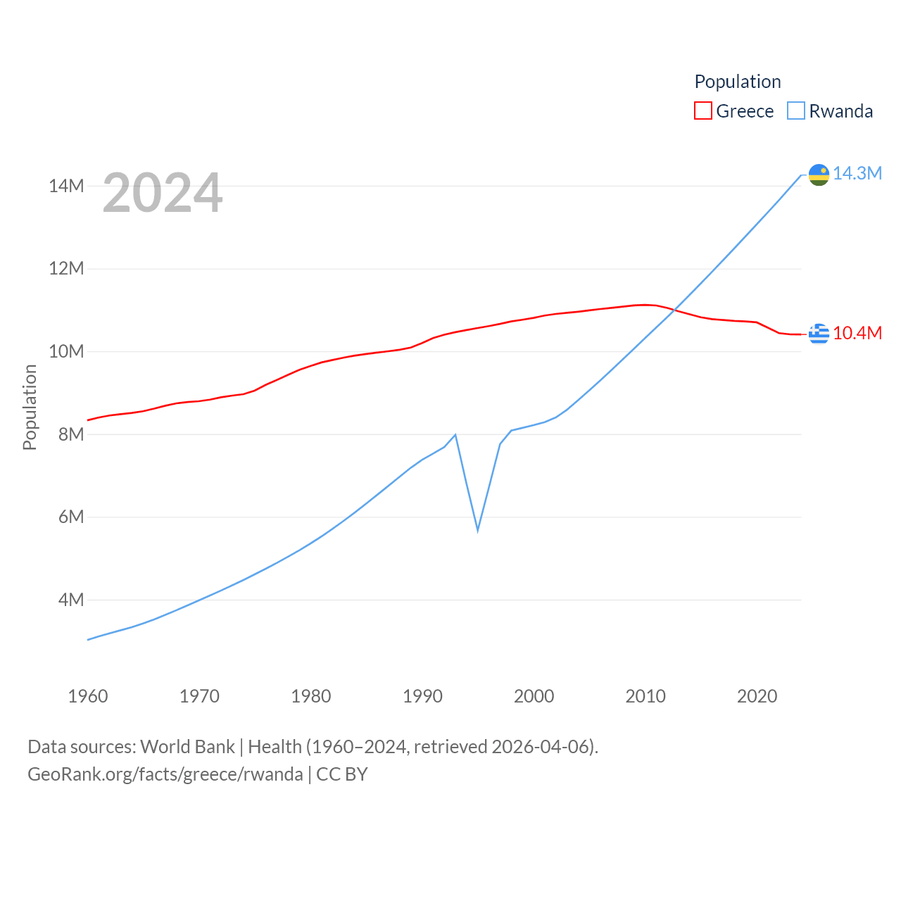 Greece has a population of 10.4M (ranked 94/197), compared with 14.3M in Rwanda (ranked 77/197). Greece's land area is 49,769 sq mi versus 9,525 sq mi for Rwanda (ranked 95th vs. 146th).
