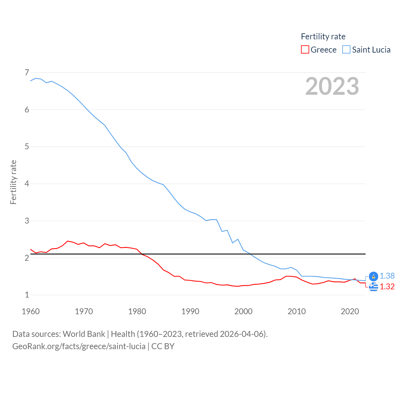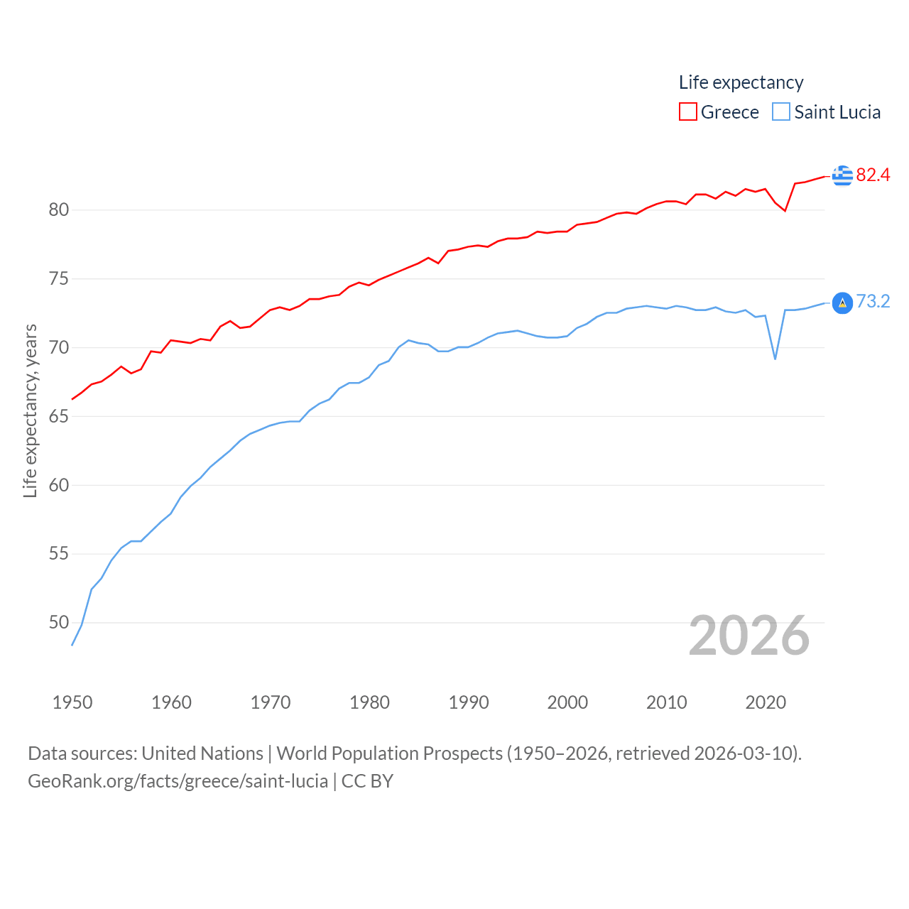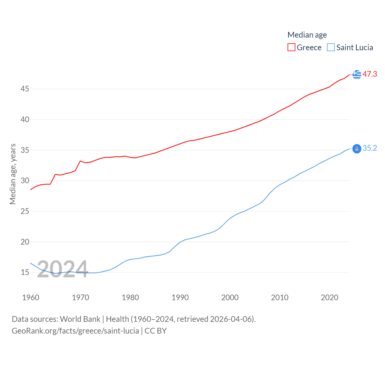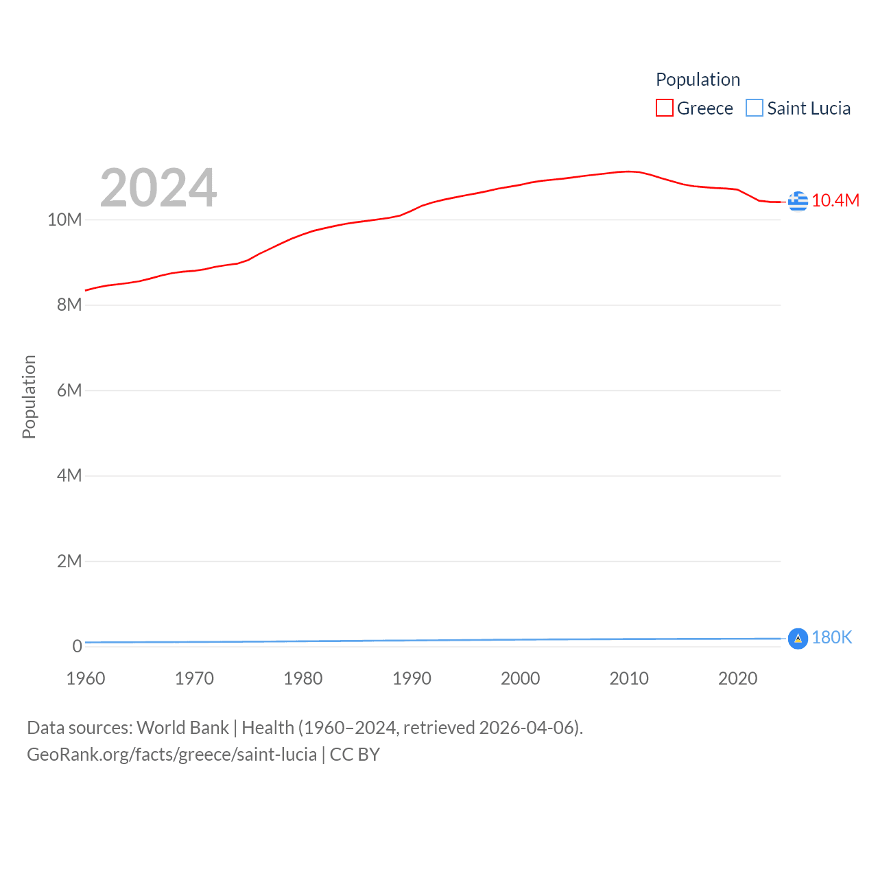 Greece has a population of 10.4M (ranked 94/197), compared with 180K in Saint Lucia (ranked 178/197). Greece's land area is 49,769 sq mi versus 235.5 sq mi for Saint Lucia (ranked 95th vs. 178th).