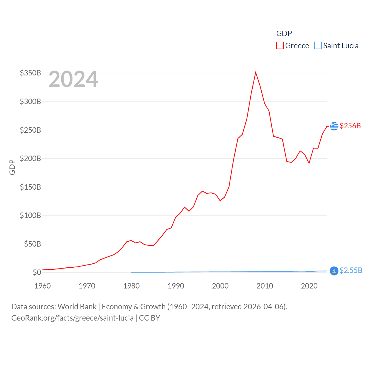 By GDP, Greece ranks 53/197 ($256B) and Saint Lucia ranks 173/197 ($2.55B). By GDP per capita, Greece ranks 49/197 ($24,626), while Saint Lucia ranks 70/197 ($14,182).