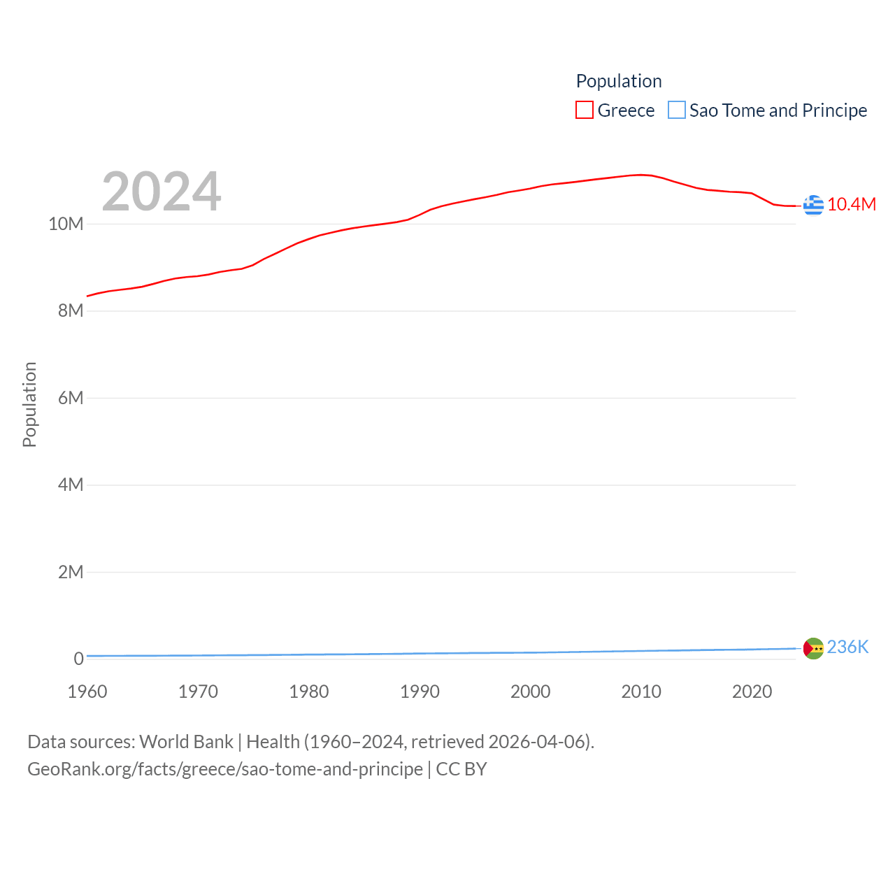 Greece has a population of 10.4M (ranked 94/197), compared with 236K in Sao Tome and Principe (ranked 176/197). Greece's land area is 49,769 sq mi versus 371 sq mi for Sao Tome and Principe (ranked 95th vs. 172nd).