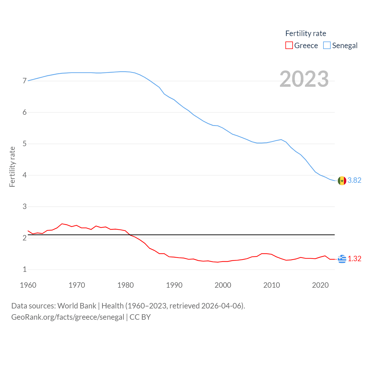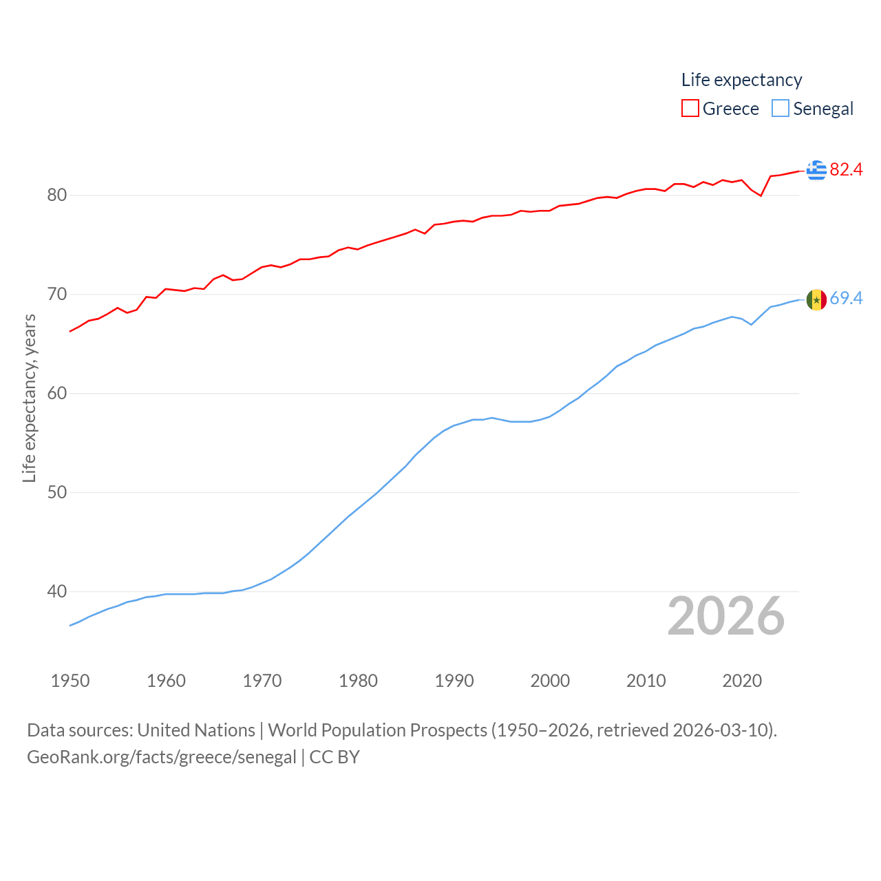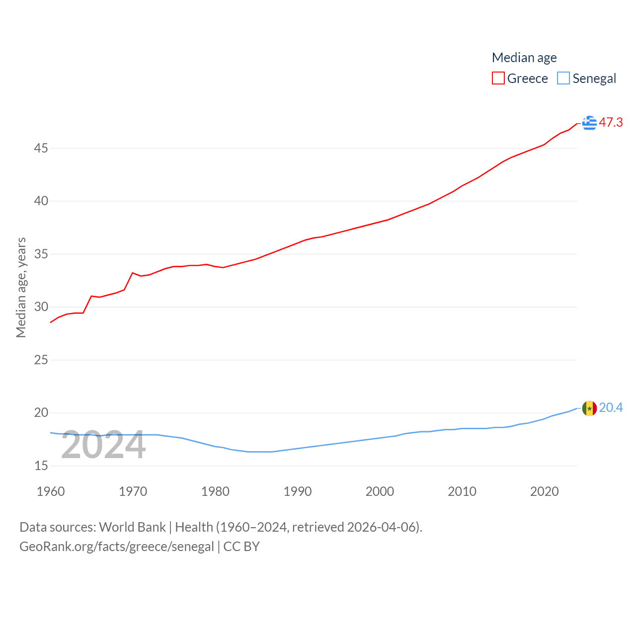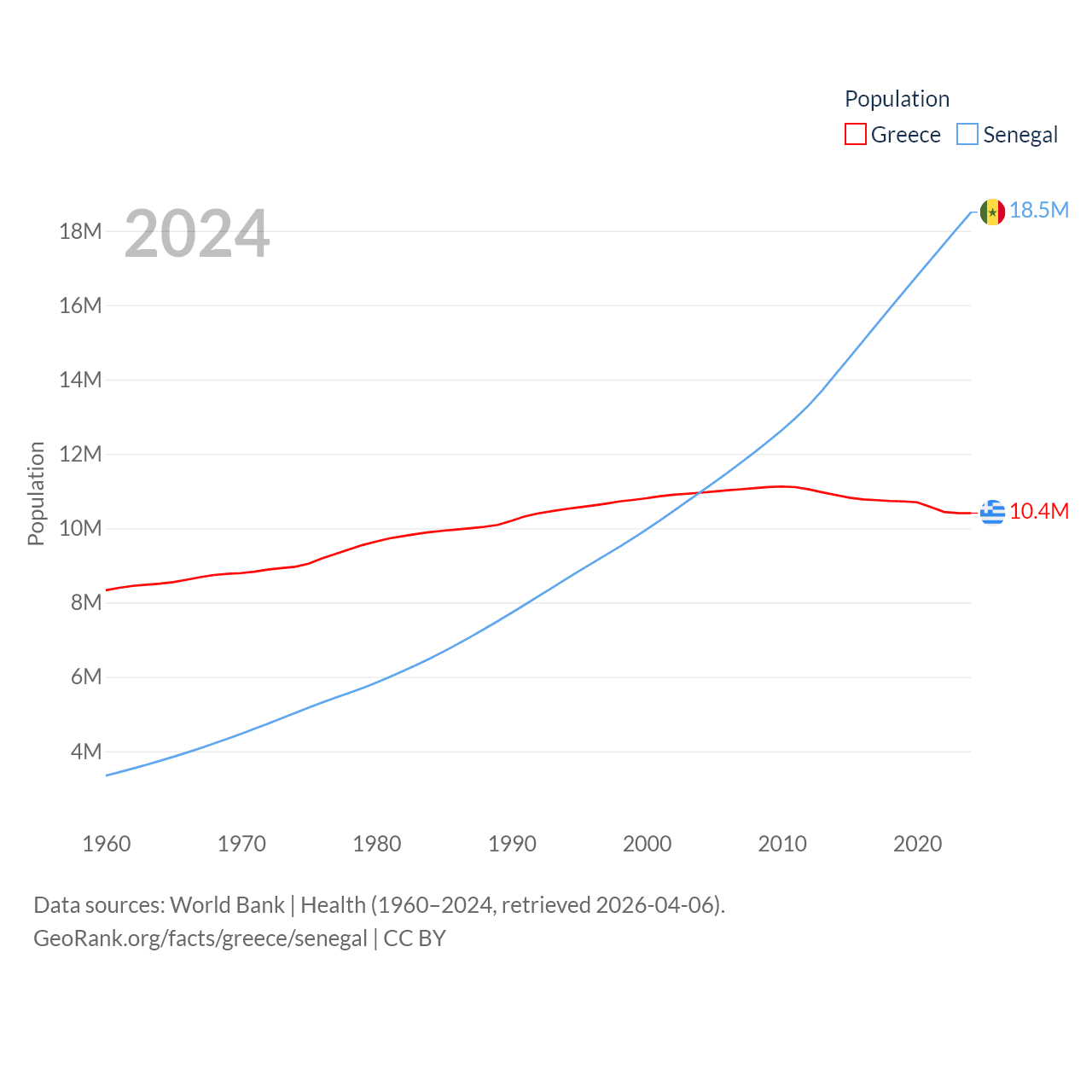Greece has a population of 10.4M (ranked 94/197), compared with 18.5M in Senegal (ranked 69/197). Greece's land area is 49,769 sq mi versus 74,336 sq mi for Senegal (ranked 95th vs. 85th).