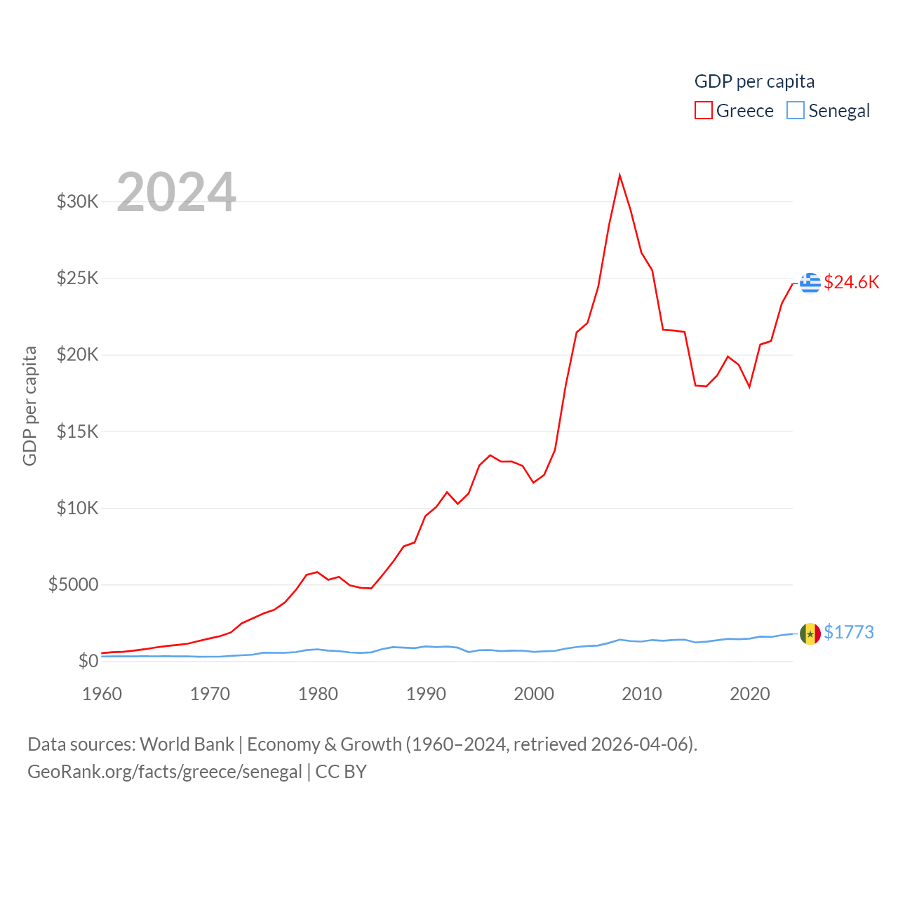 By GDP, Greece ranks 53/197 ($256B) and Senegal ranks 109/197 ($32.8B). By GDP per capita, Greece ranks 49/197 ($24,626), while Senegal ranks 159/197 ($1,773).