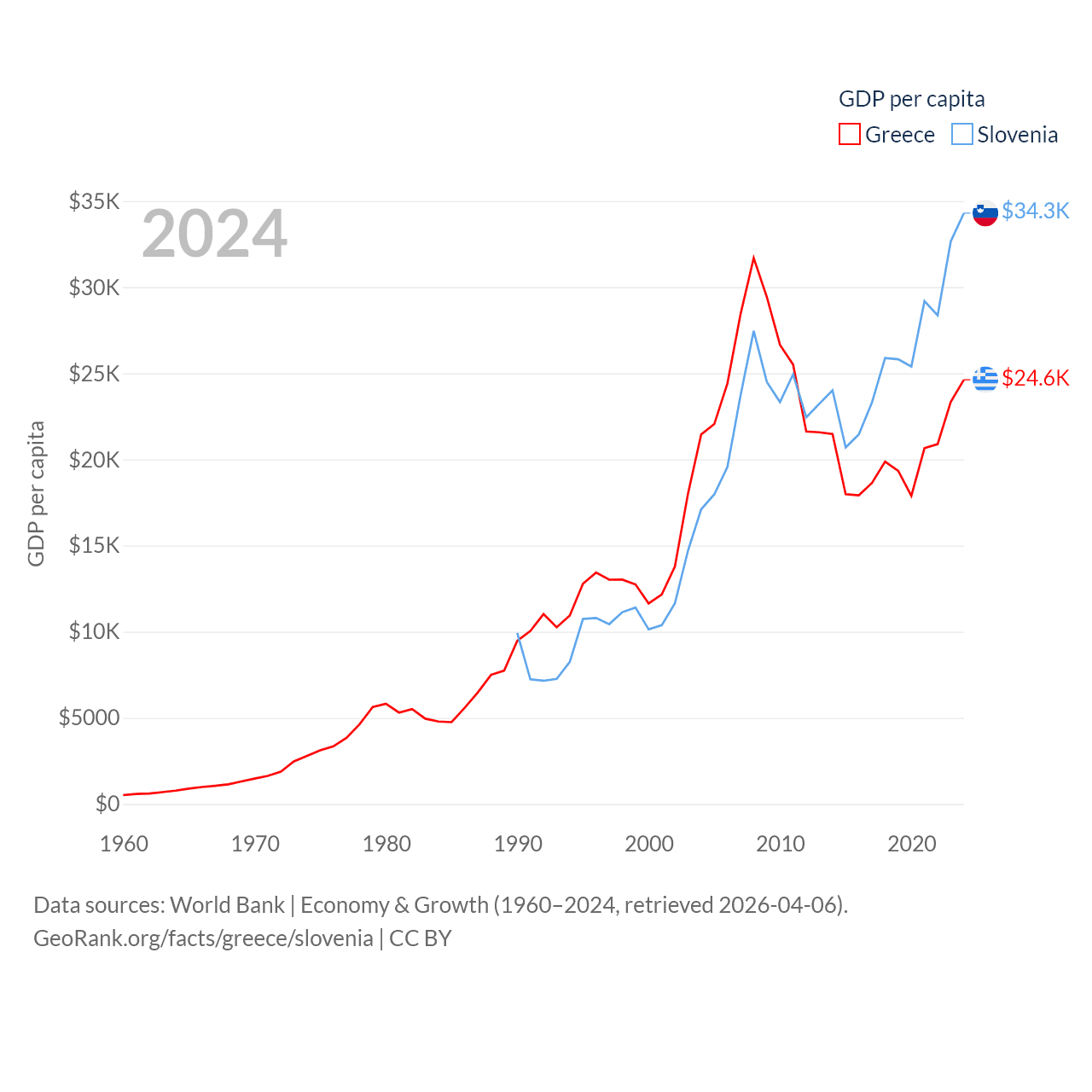 By GDP, Greece ranks 53/197 ($256B) and Slovenia ranks 86/197 ($73B). By GDP per capita, Greece ranks 49/197 ($24,626), while Slovenia ranks 34/197 ($34,301).