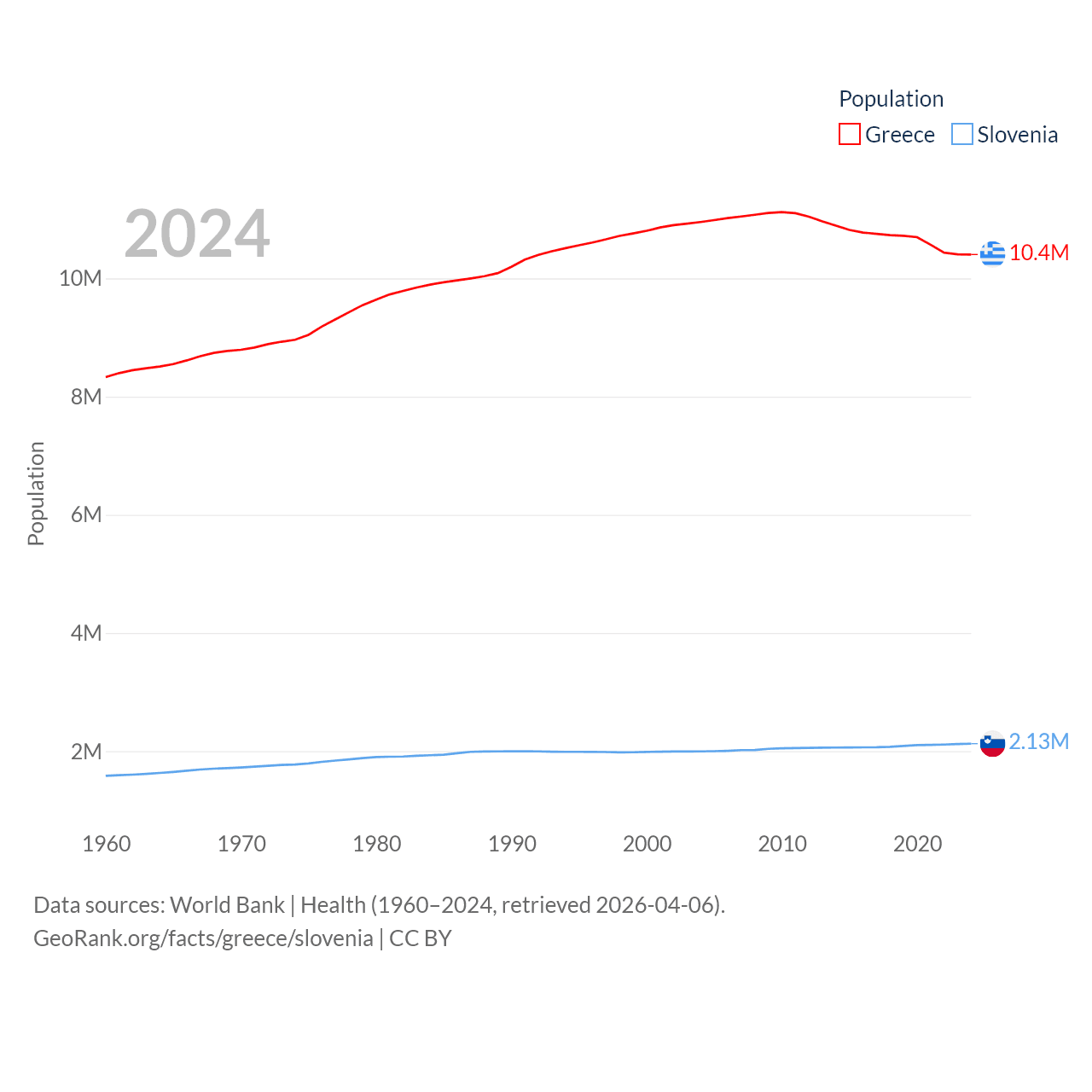 Greece has a population of 10.4M (ranked 94/197), compared with 2.13M in Slovenia (ranked 147/197). Greece's land area is 49,769 sq mi versus 7,774 sq mi for Slovenia (ranked 95th vs. 151st).