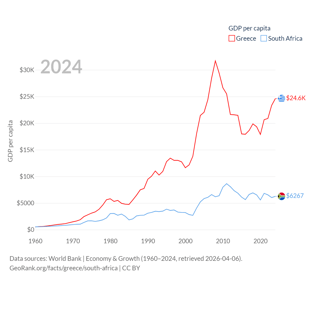 By GDP, Greece ranks 53/197 ($256B) and South Africa ranks 40/197 ($401B). By GDP per capita, Greece ranks 49/197 ($24,626), while South Africa ranks 111/197 ($6,267).