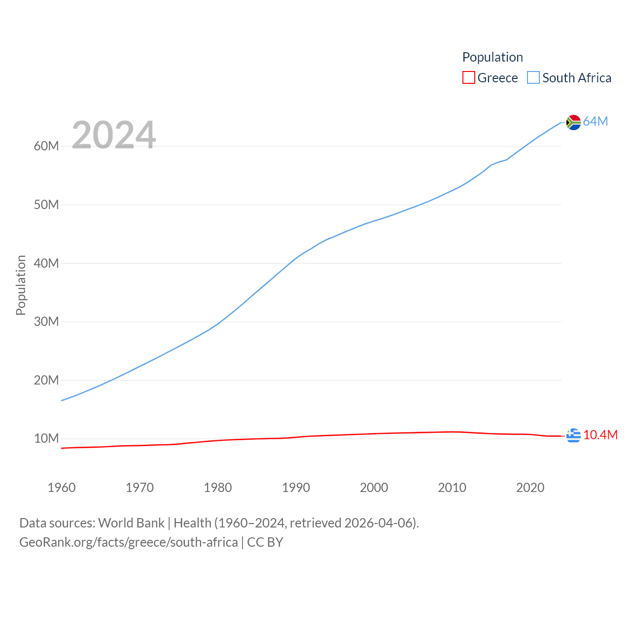 Greece has a population of 10.4M (ranked 94/197), compared with 64M in South Africa (ranked 24/197). Greece's land area is 49,769 sq mi versus 468,377 sq mi for South Africa (ranked 95th vs. 24th).