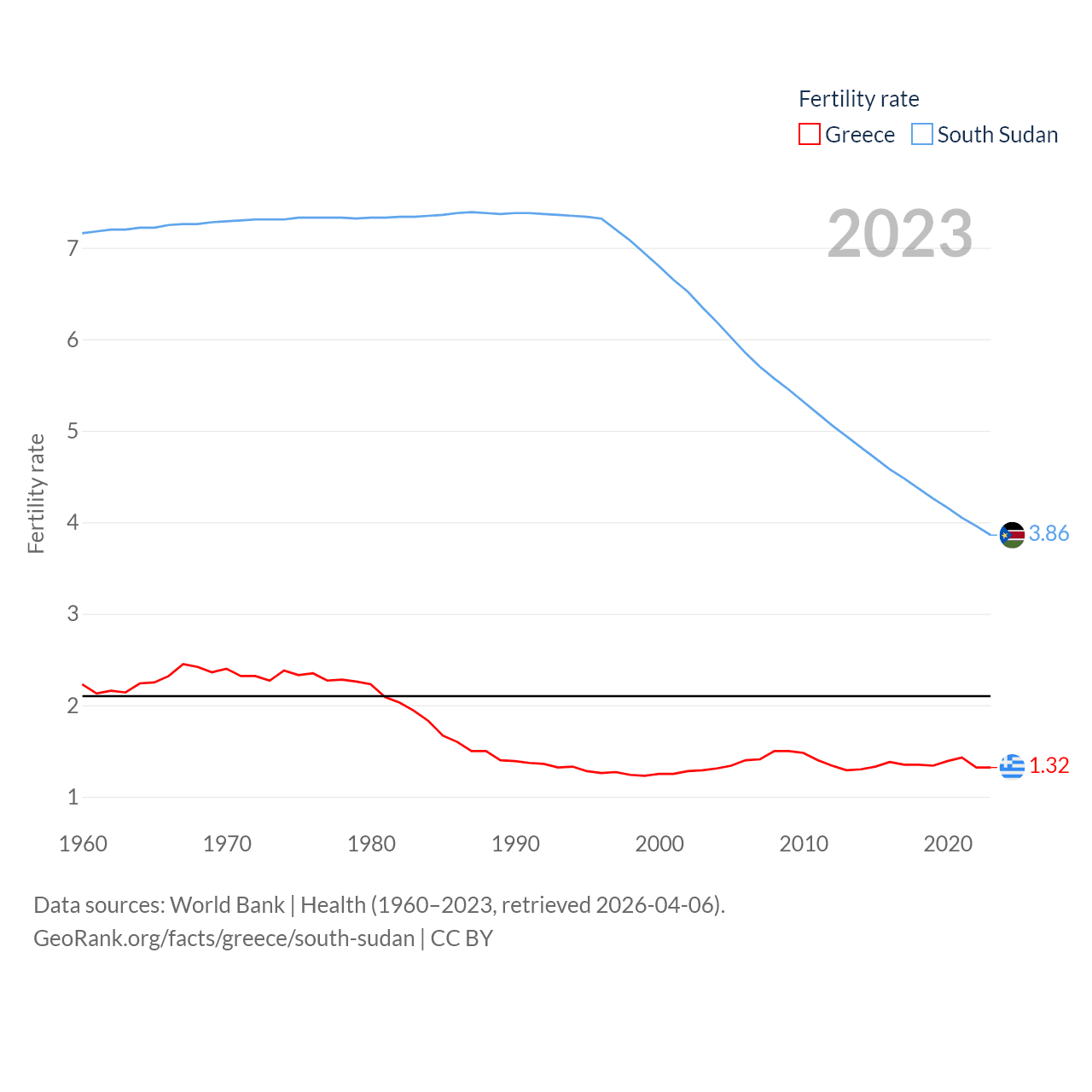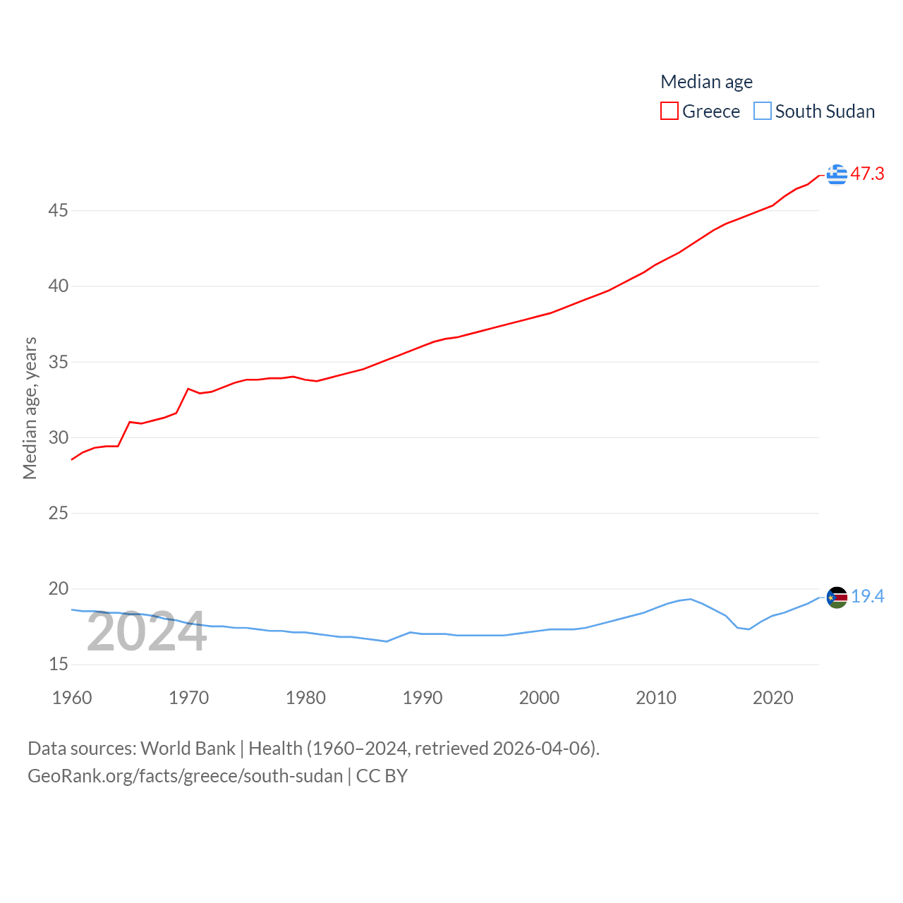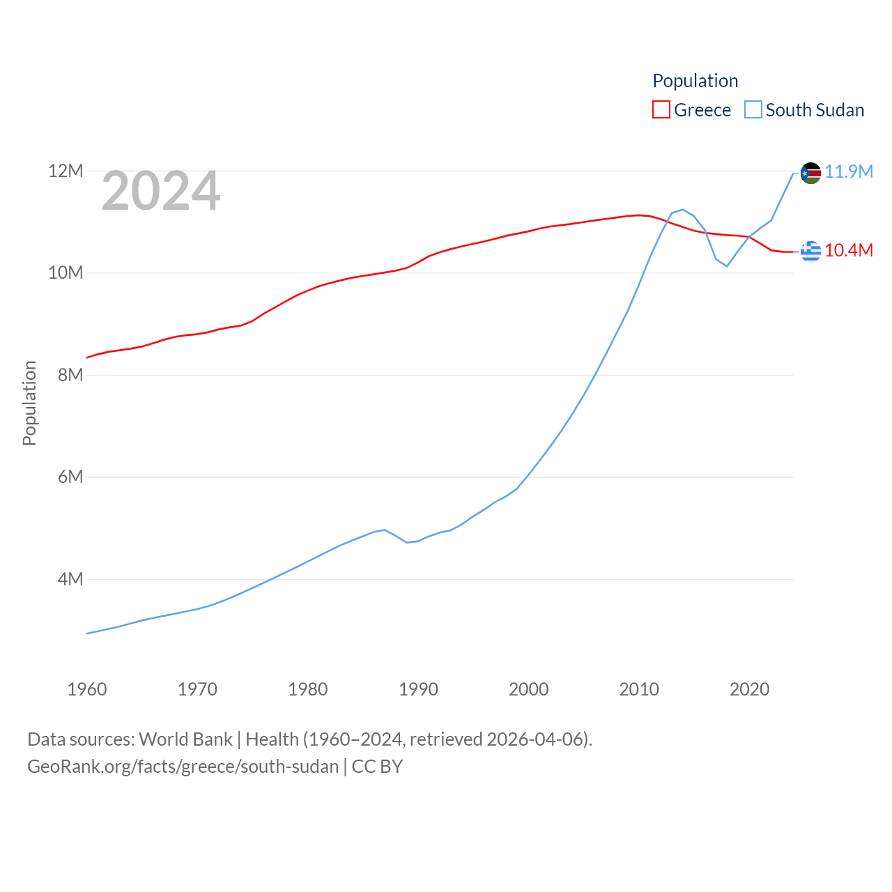 Greece has a population of 10.4M (ranked 94/197), compared with 11.9M in South Sudan (ranked 81/197). Greece's land area is 49,769 sq mi versus 243,990 sq mi for South Sudan (ranked 95th vs. 41st).