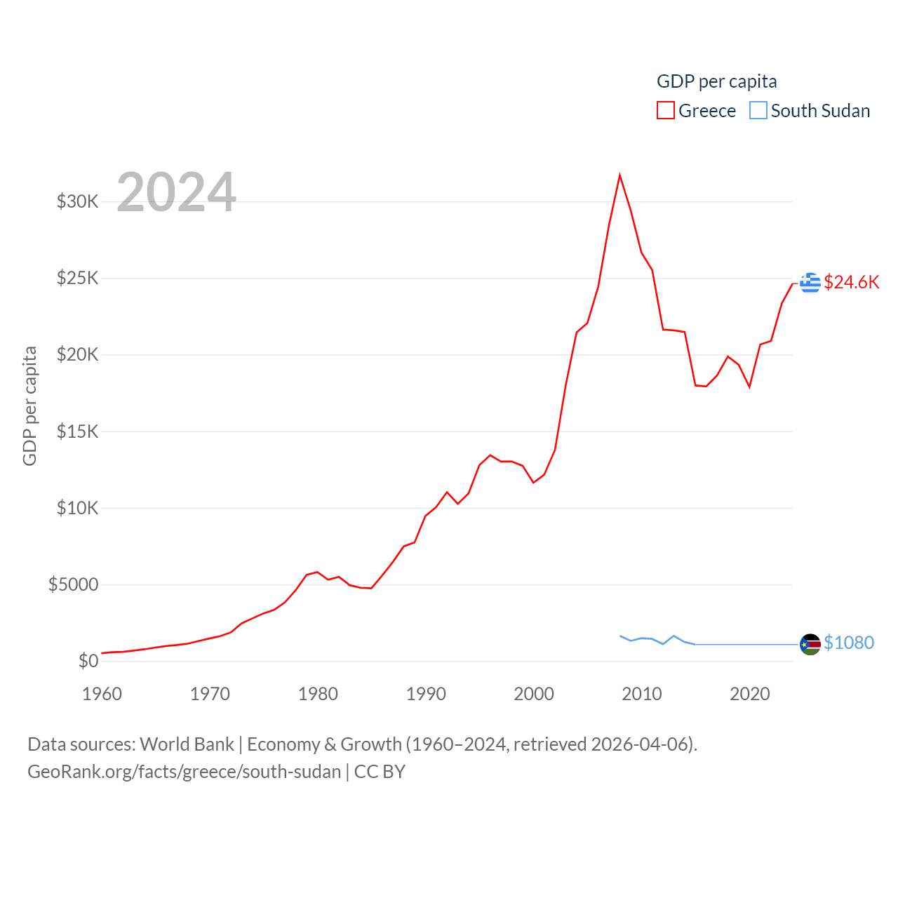 By GDP, Greece ranks 53/197 ($256B) and South Sudan ranks 149/197 ($12B). By GDP per capita, Greece ranks 49/197 ($24,626), while South Sudan ranks 175/197 ($1,080).