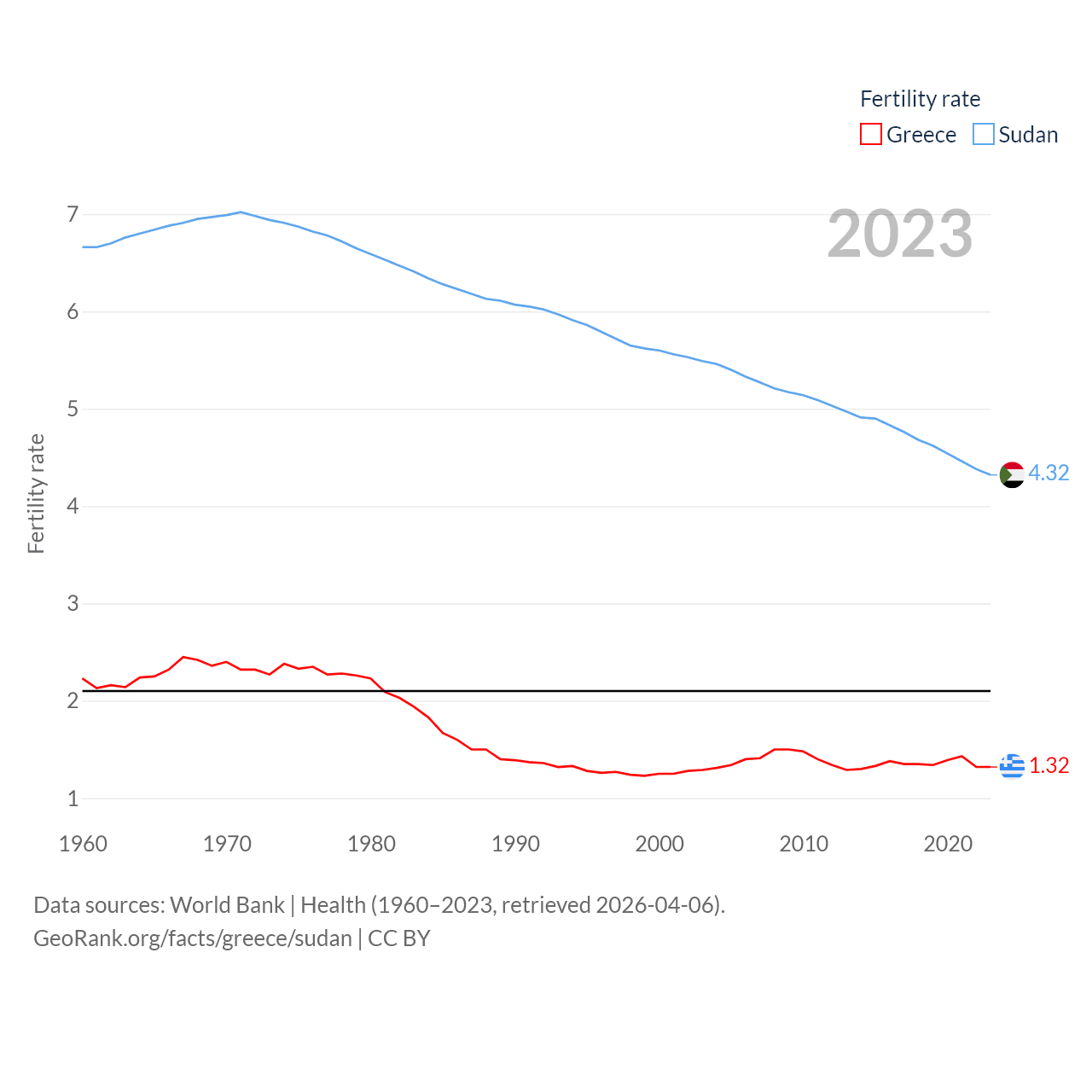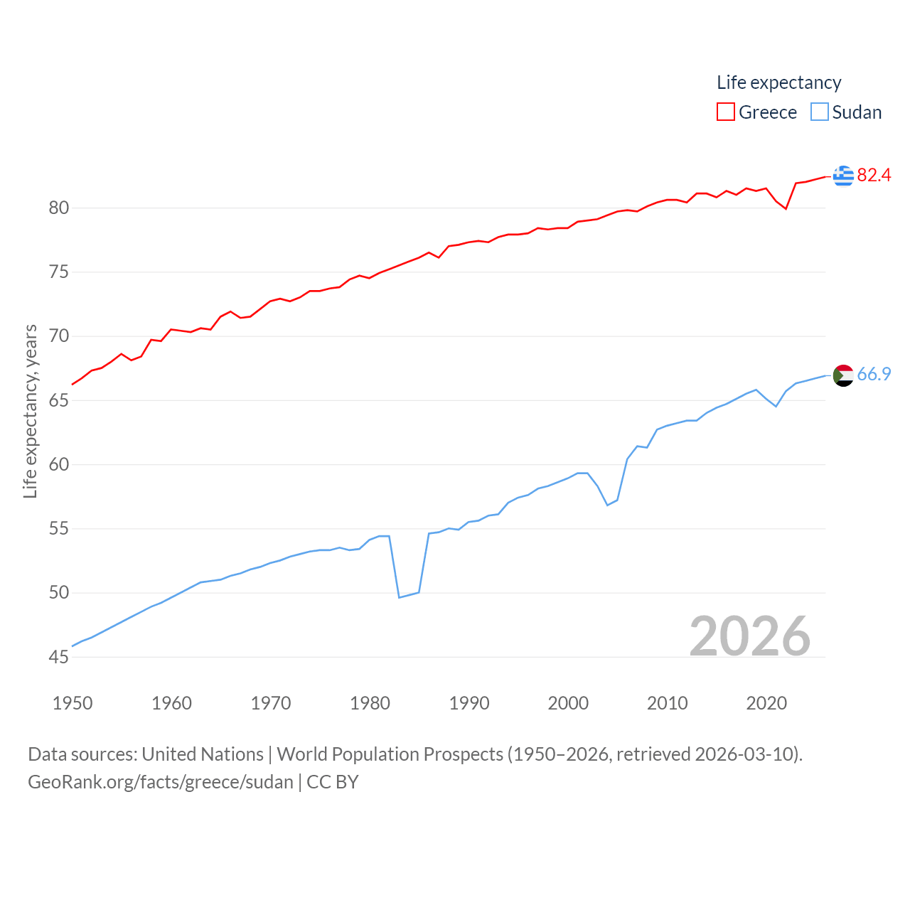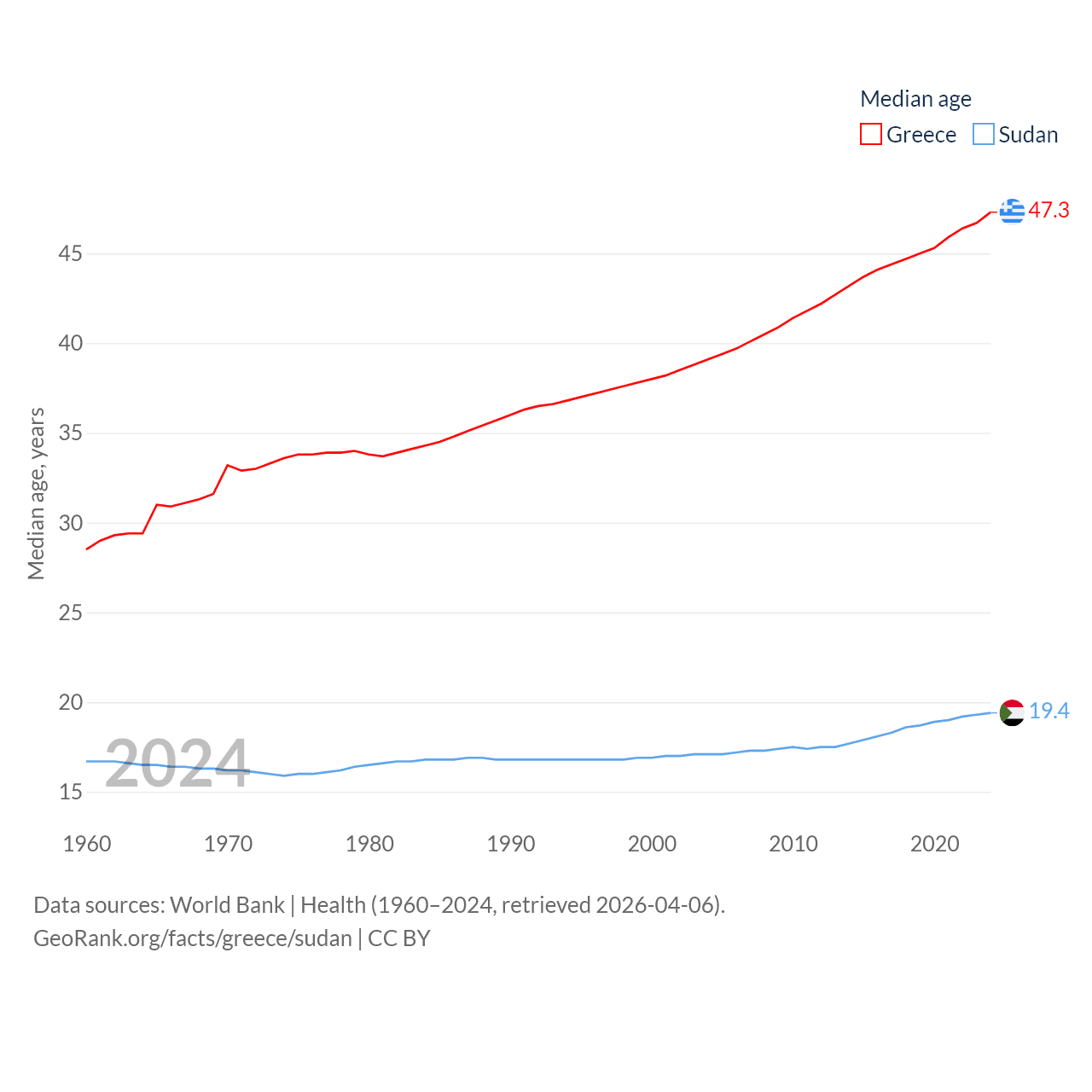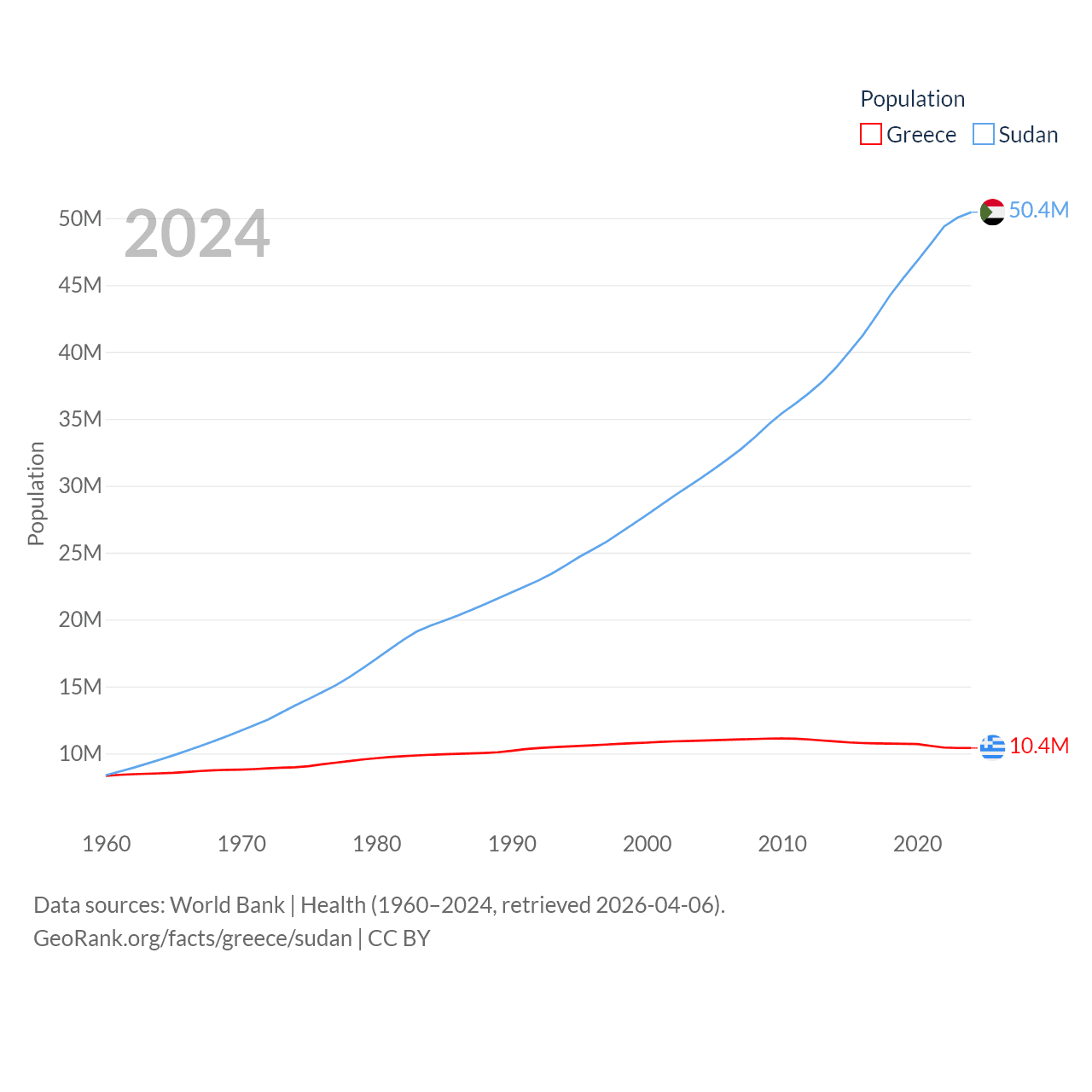 Greece has a population of 10.4M (ranked 94/197), compared with 50.4M in Sudan (ranked 30/197). Greece's land area is 49,769 sq mi versus 721,239 sq mi for Sudan (ranked 95th vs. 15th).