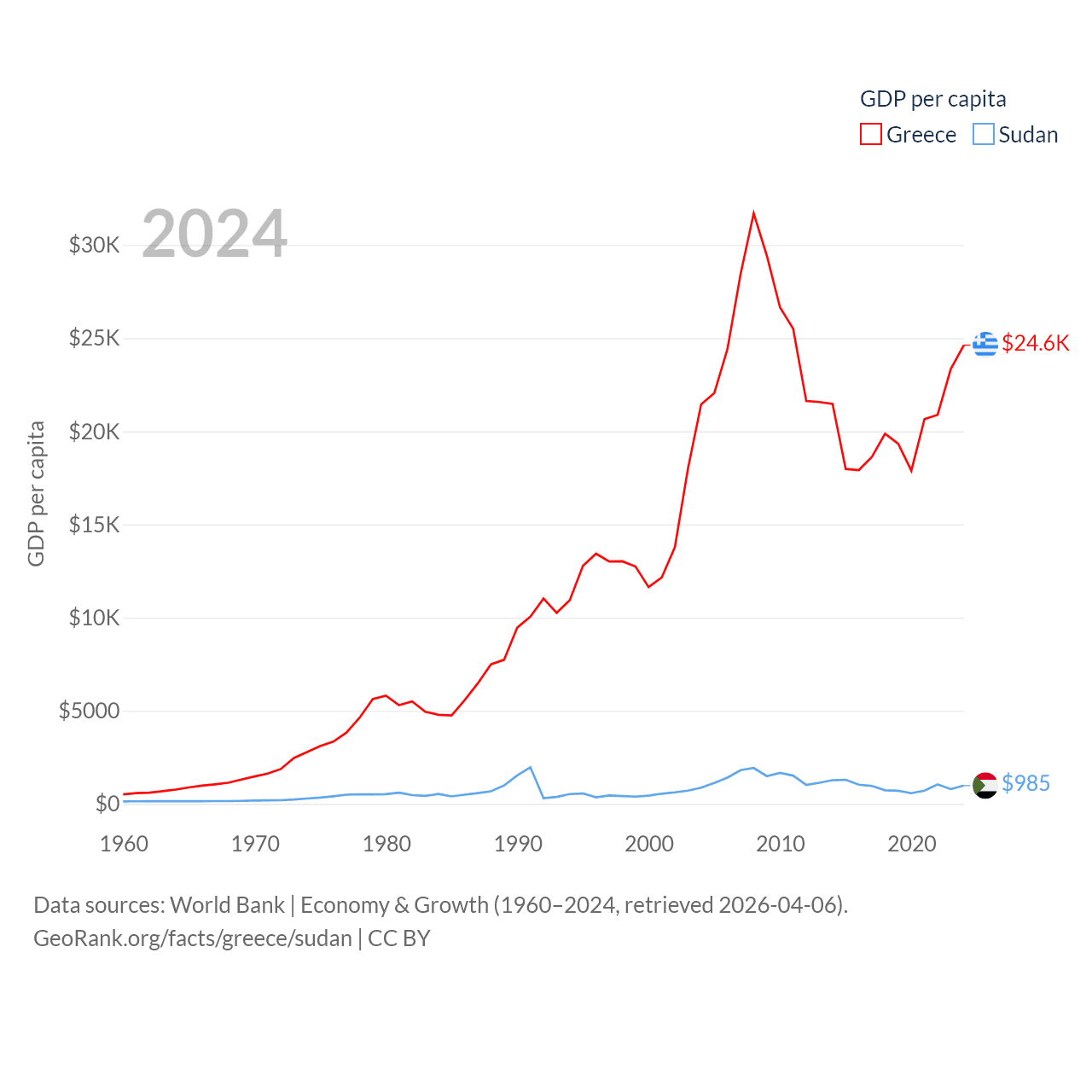 By GDP, Greece ranks 53/197 ($256B) and Sudan ranks 94/197 ($49.7B). By GDP per capita, Greece ranks 49/197 ($24,626), while Sudan ranks 179/197 ($985).