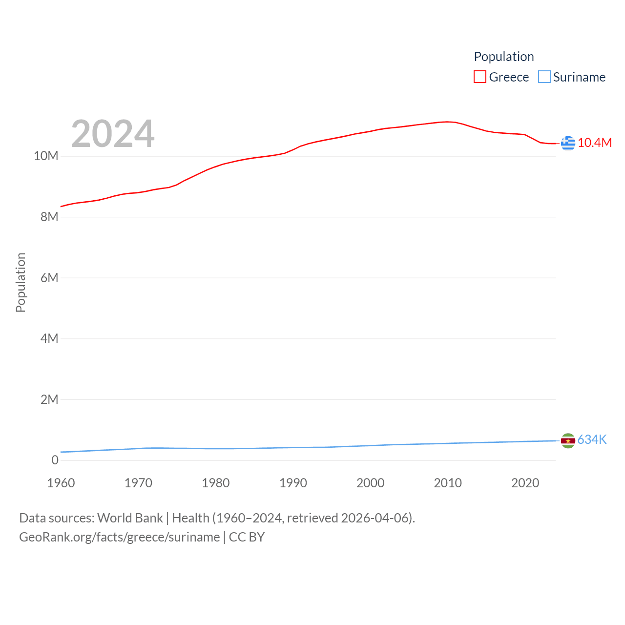 Greece has a population of 10.4M (ranked 94/197), compared with 634K in Suriname (ranked 165/197). Greece's land area is 49,769 sq mi versus 61,972 sq mi for Suriname (ranked 95th vs. 90th).