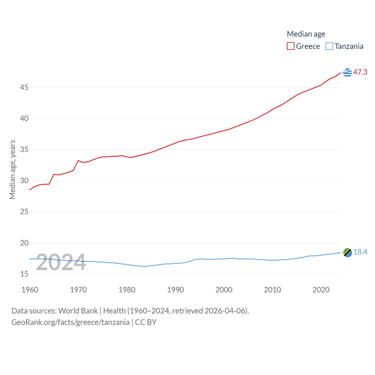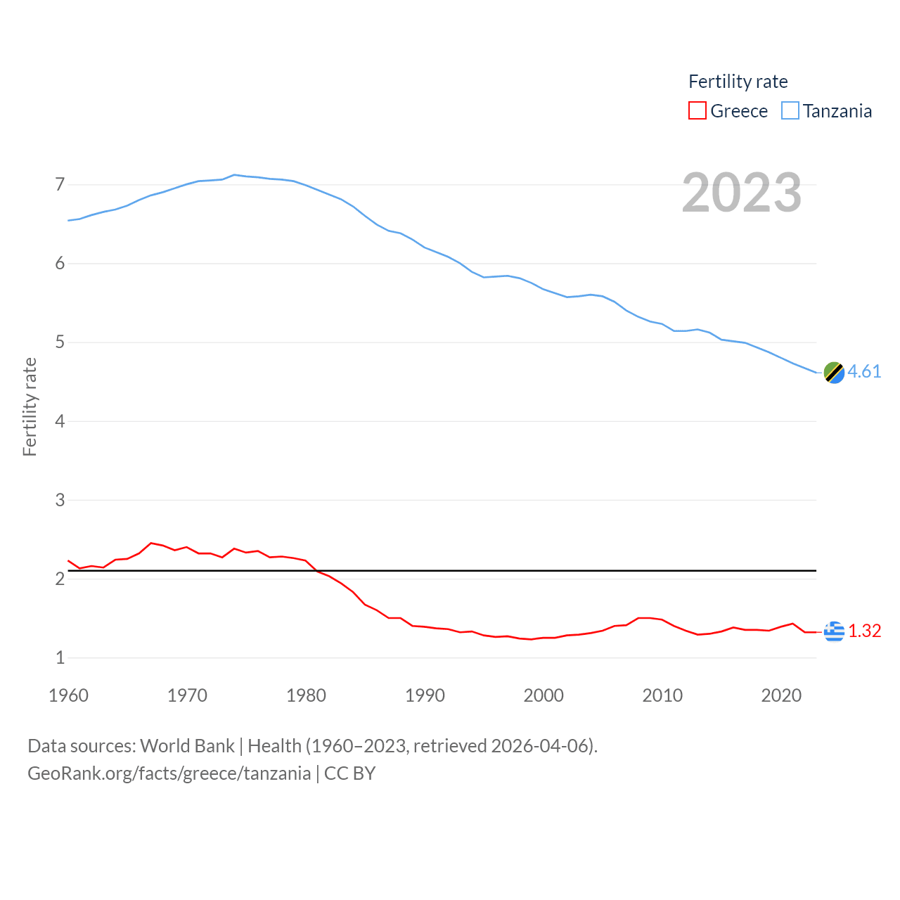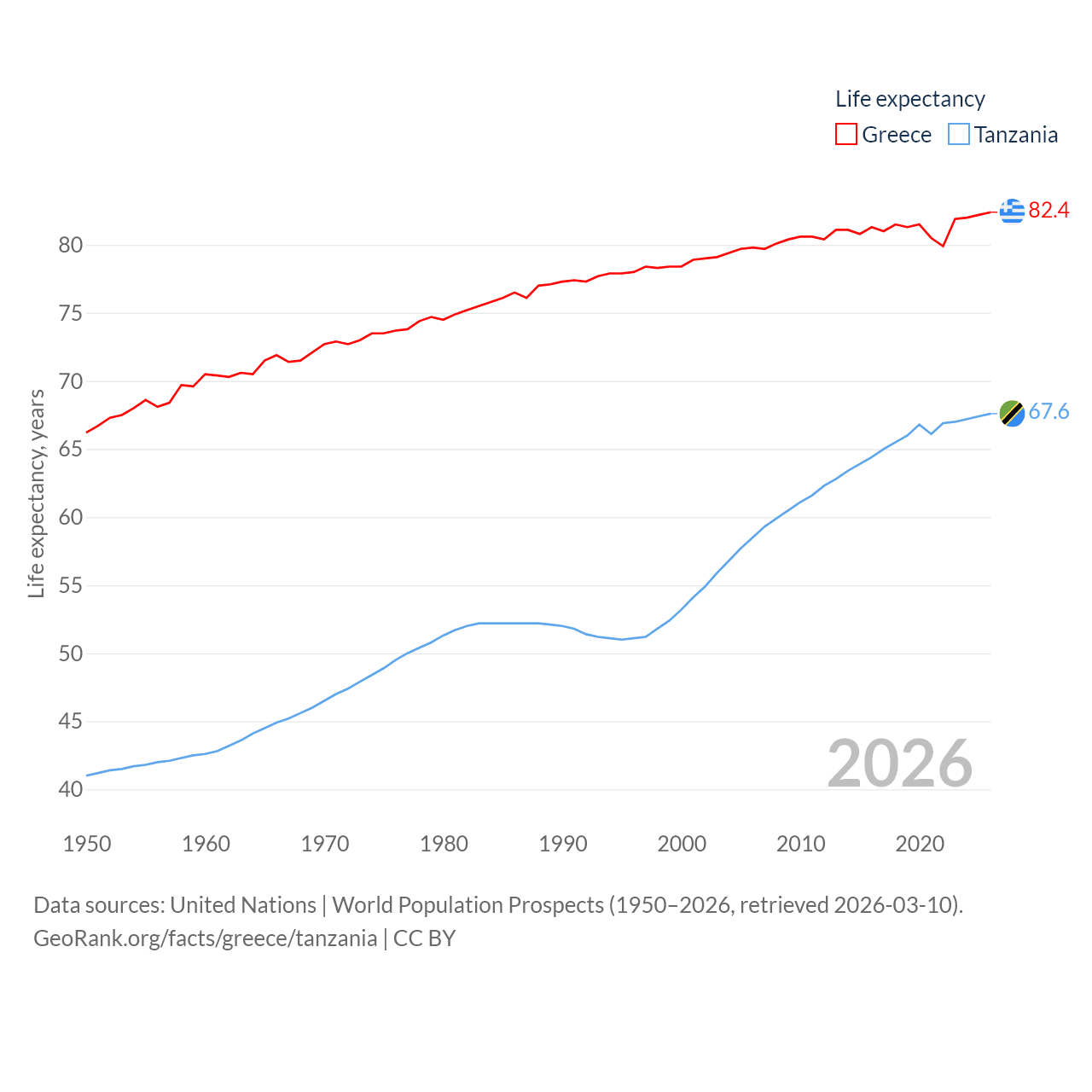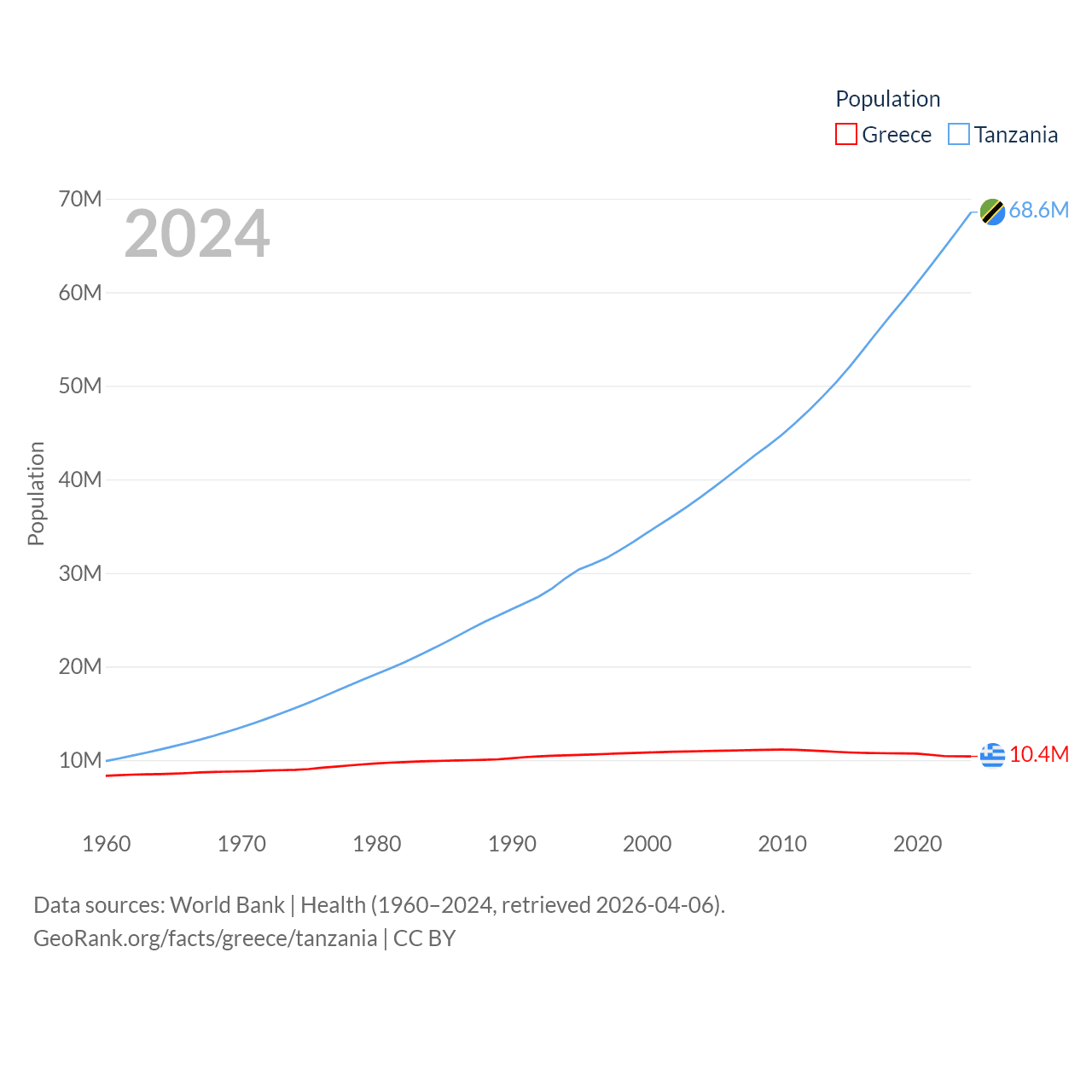 Greece has a population of 10.4M (ranked 94/197), compared with 68.6M in Tanzania (ranked 22/197). Greece's land area is 49,769 sq mi versus 342,009 sq mi for Tanzania (ranked 95th vs. 31st).