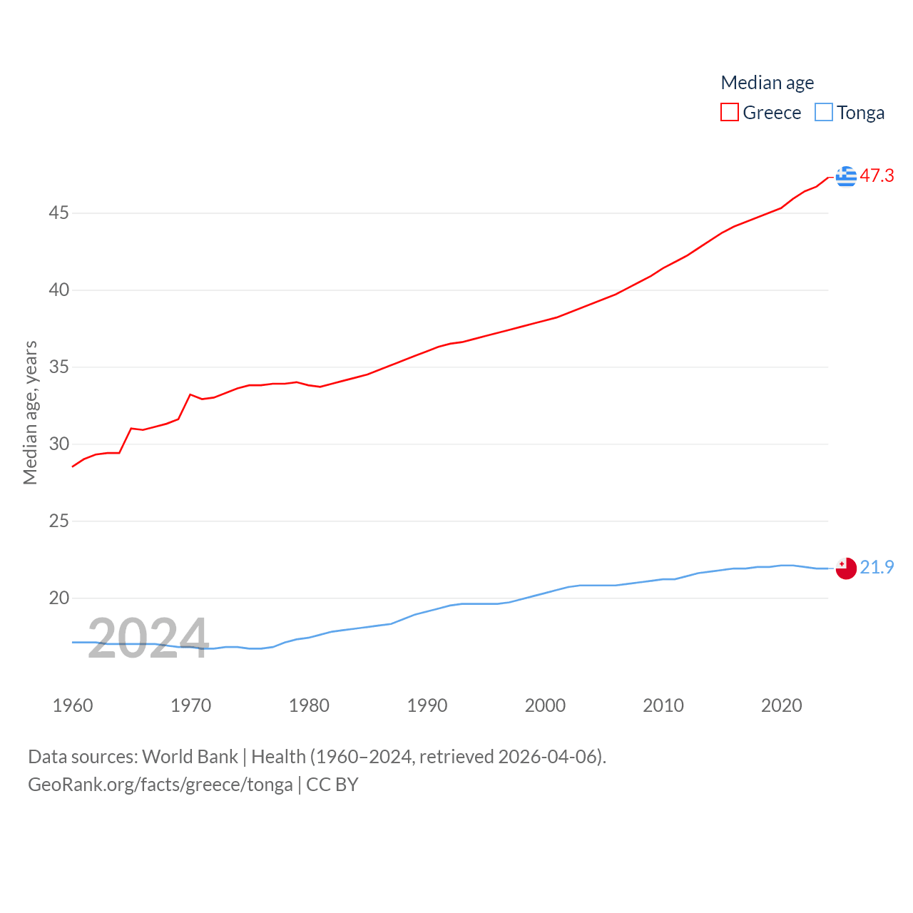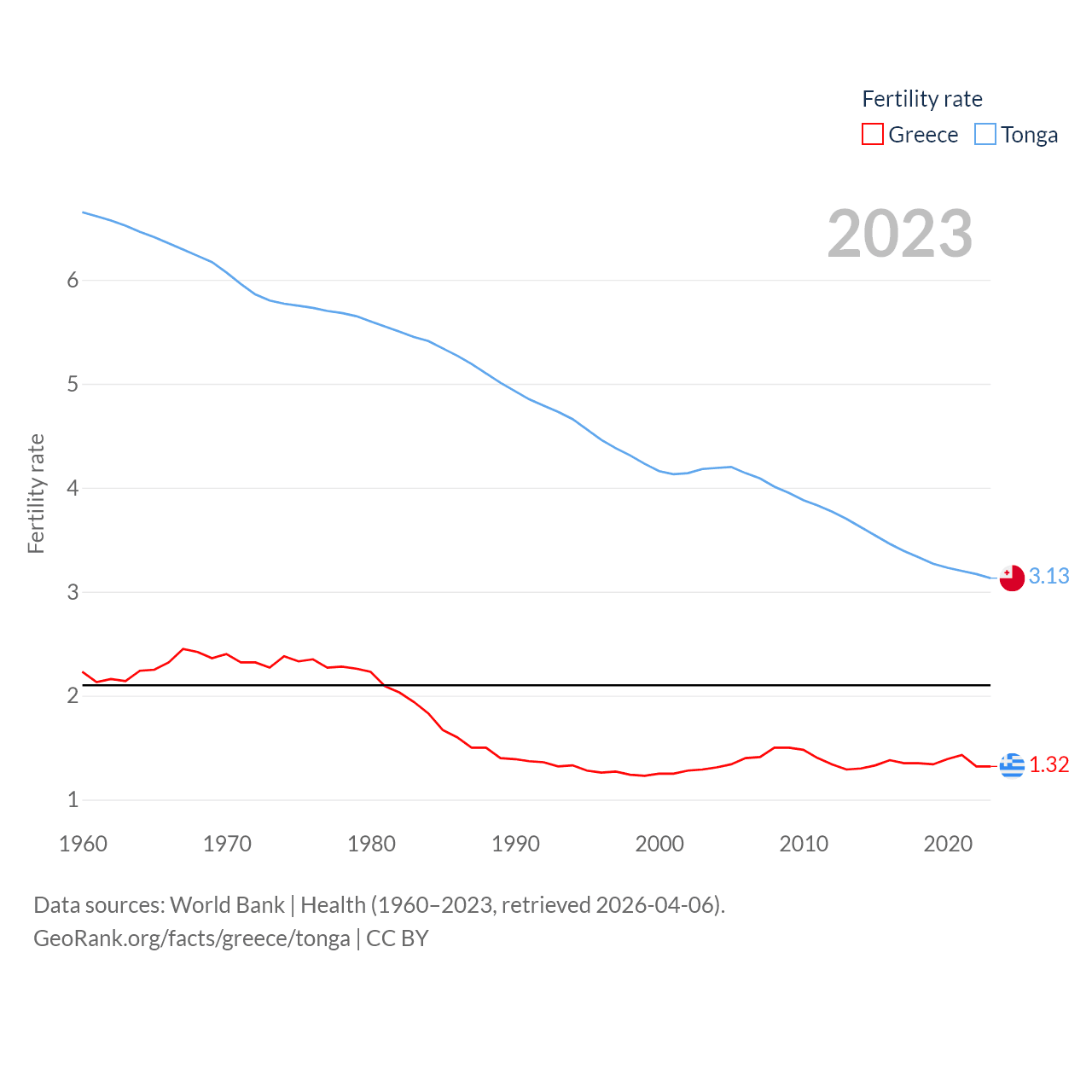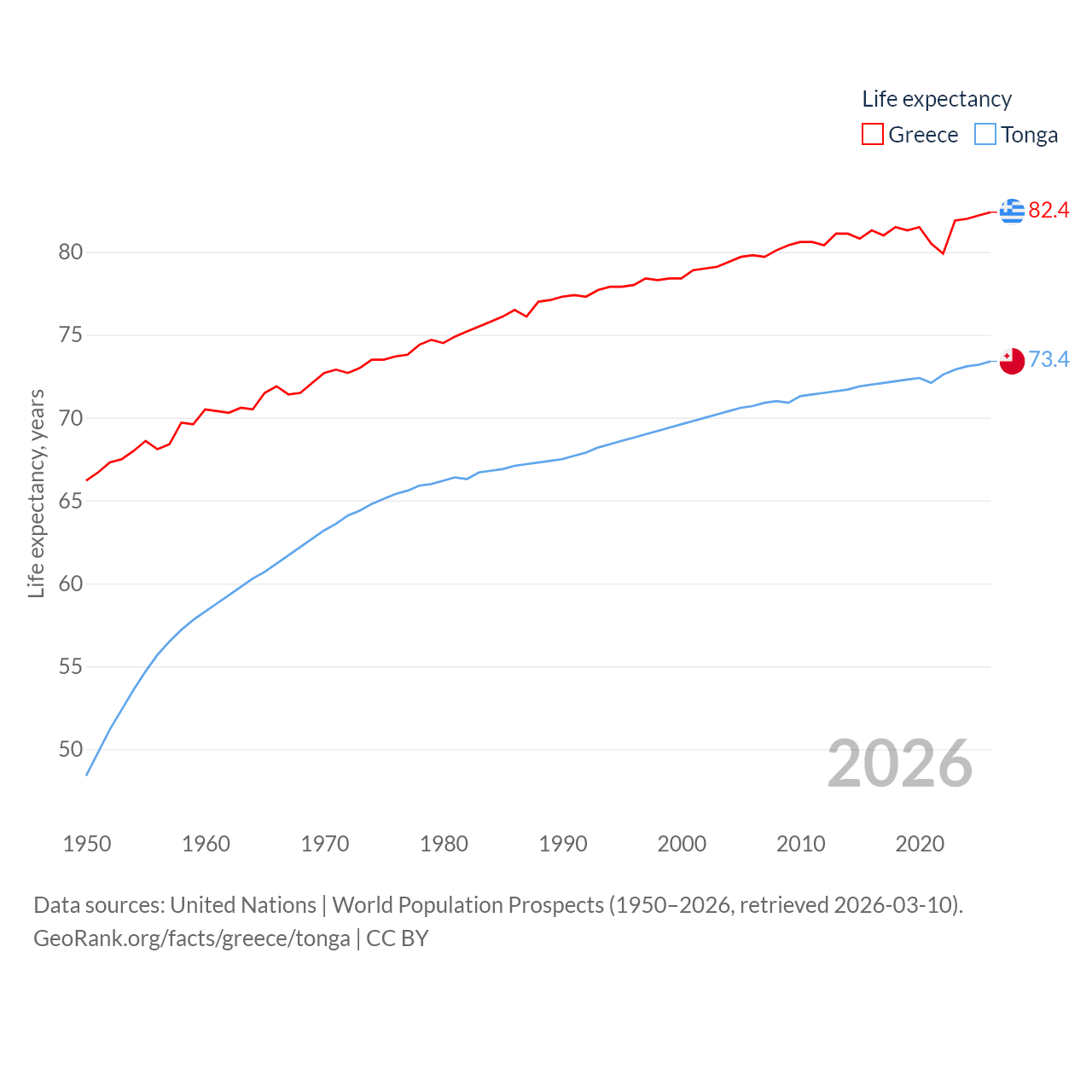 Greece has a population of 10.4M (ranked 94/197), compared with 104K in Tonga (ranked 183/197). Greece's land area is 49,769 sq mi versus 278 sq mi for Tonga (ranked 95th vs. 176th).