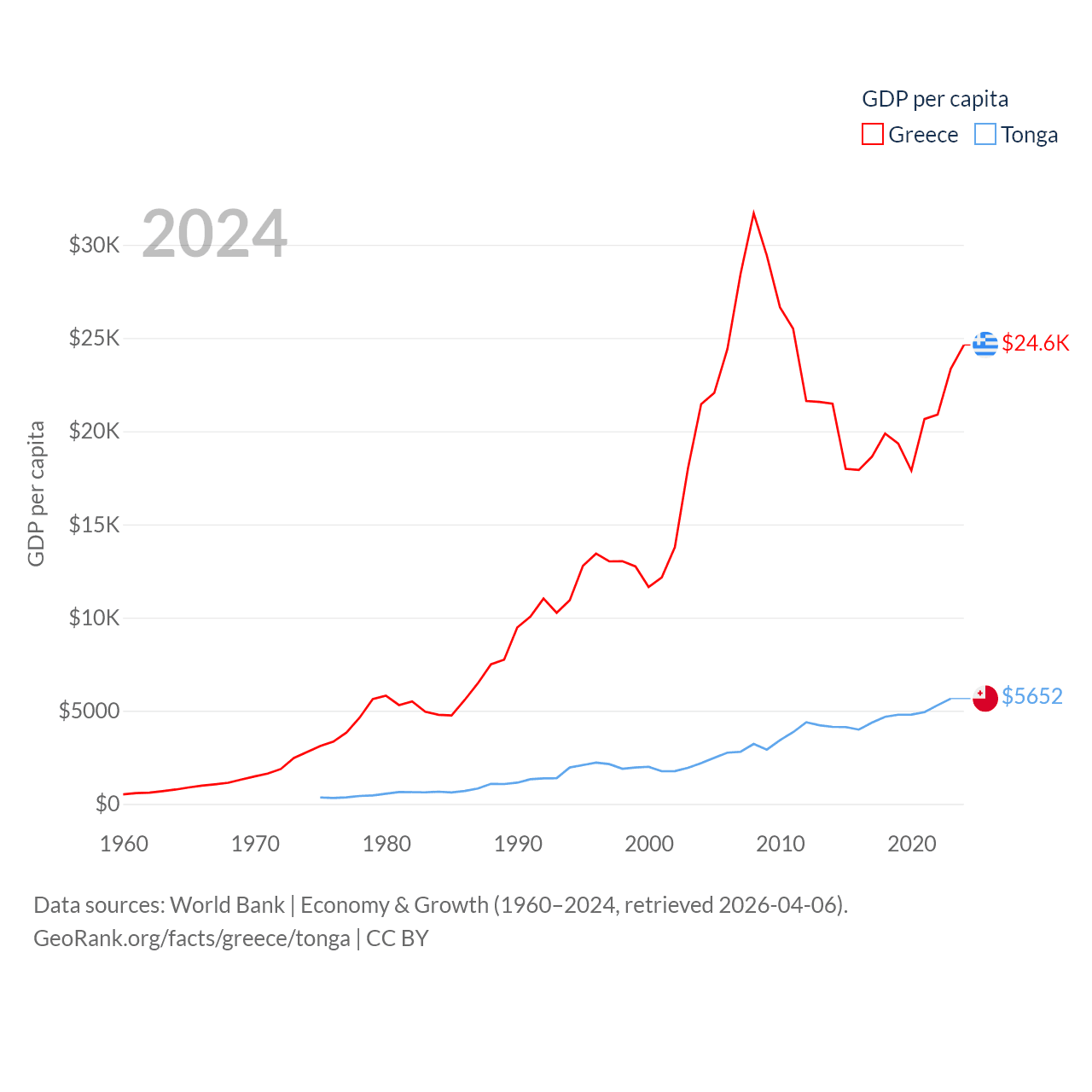 By GDP, Greece ranks 53/197 ($256B) and Tonga ranks 191/197 ($591M). By GDP per capita, Greece ranks 49/197 ($24,626), while Tonga ranks 115/197 ($5,652).