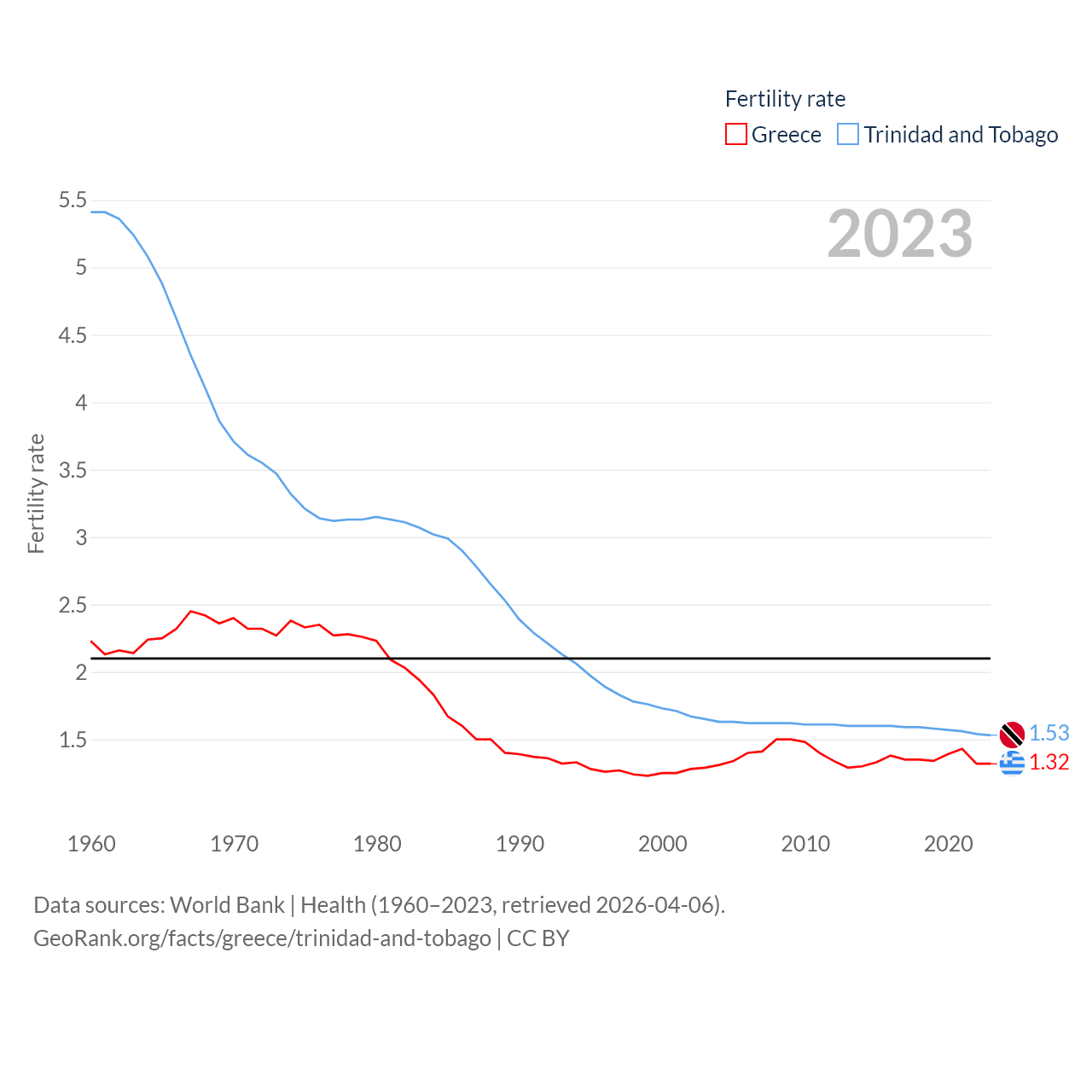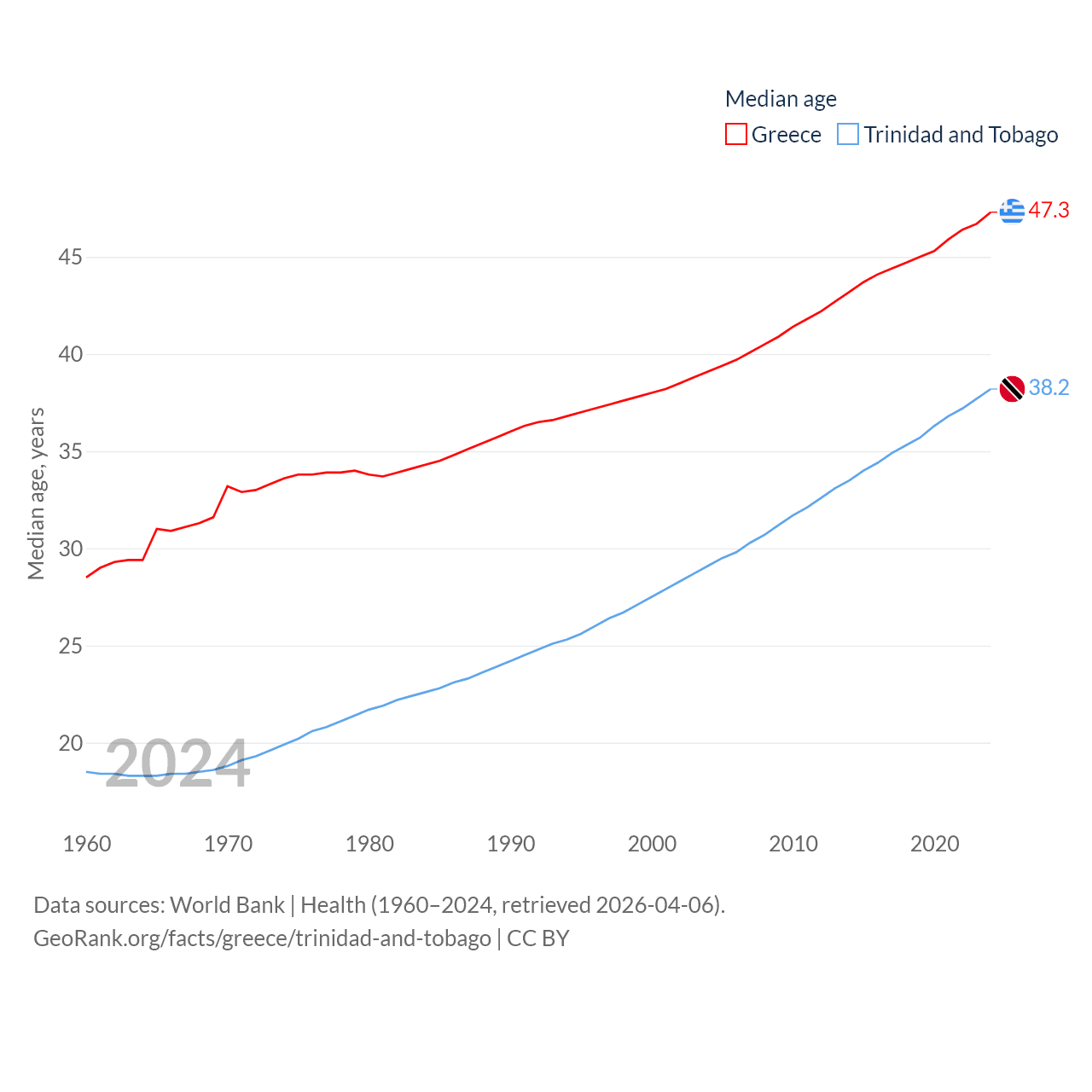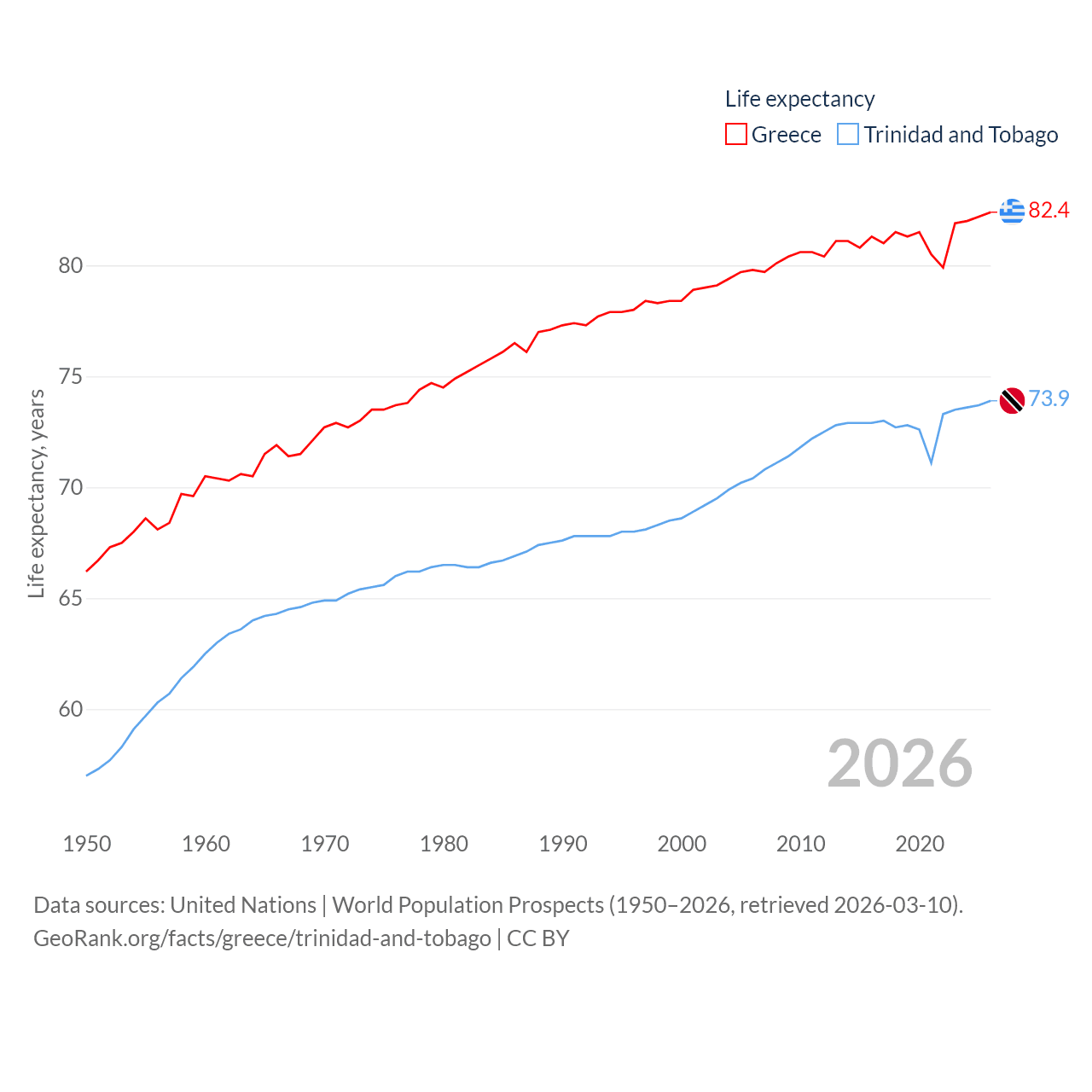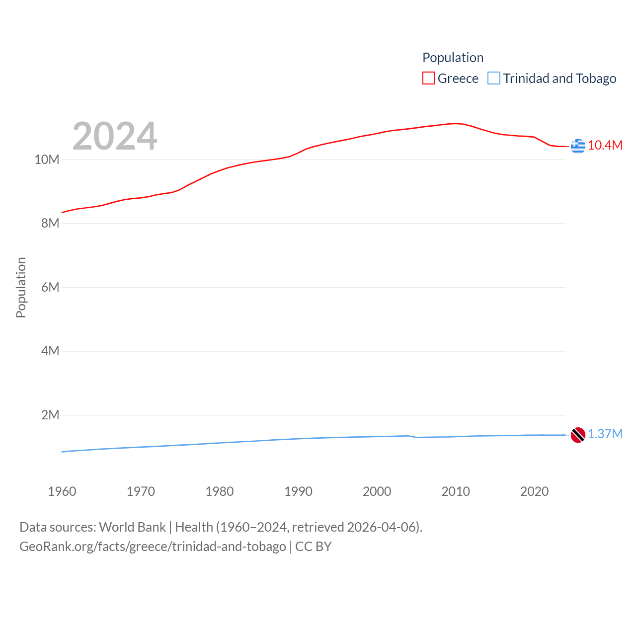 Greece has a population of 10.4M (ranked 94/197), compared with 1.37M in Trinidad and Tobago (ranked 154/197). Greece's land area is 49,769 sq mi versus 1,981 sq mi for Trinidad and Tobago (ranked 95th vs. 166th).