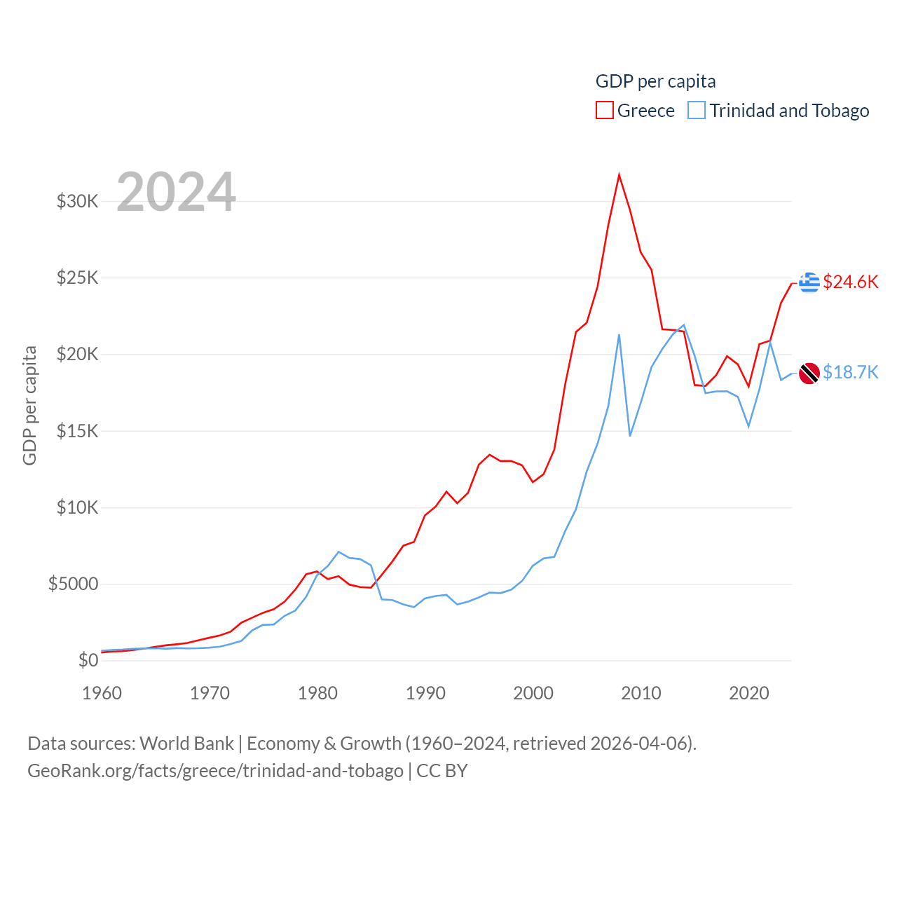 By GDP, Greece ranks 53/197 ($256B) and Trinidad and Tobago ranks 115/197 ($25.6B). By GDP per capita, Greece ranks 49/197 ($24,626), while Trinidad and Tobago ranks 61/197 ($18,733).