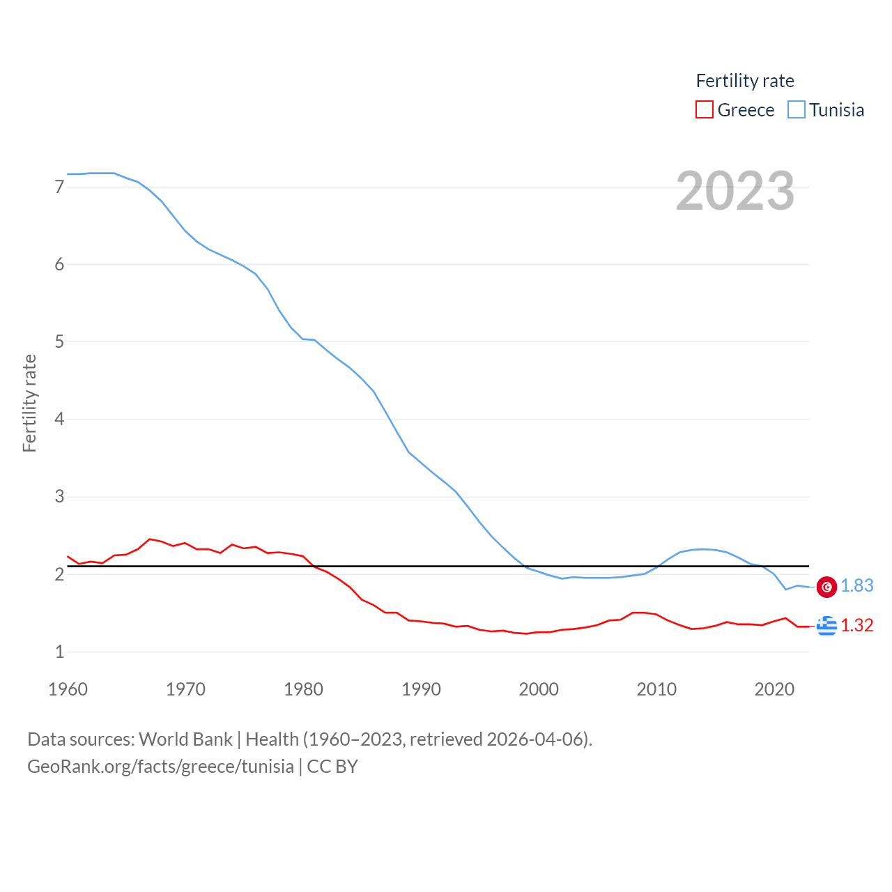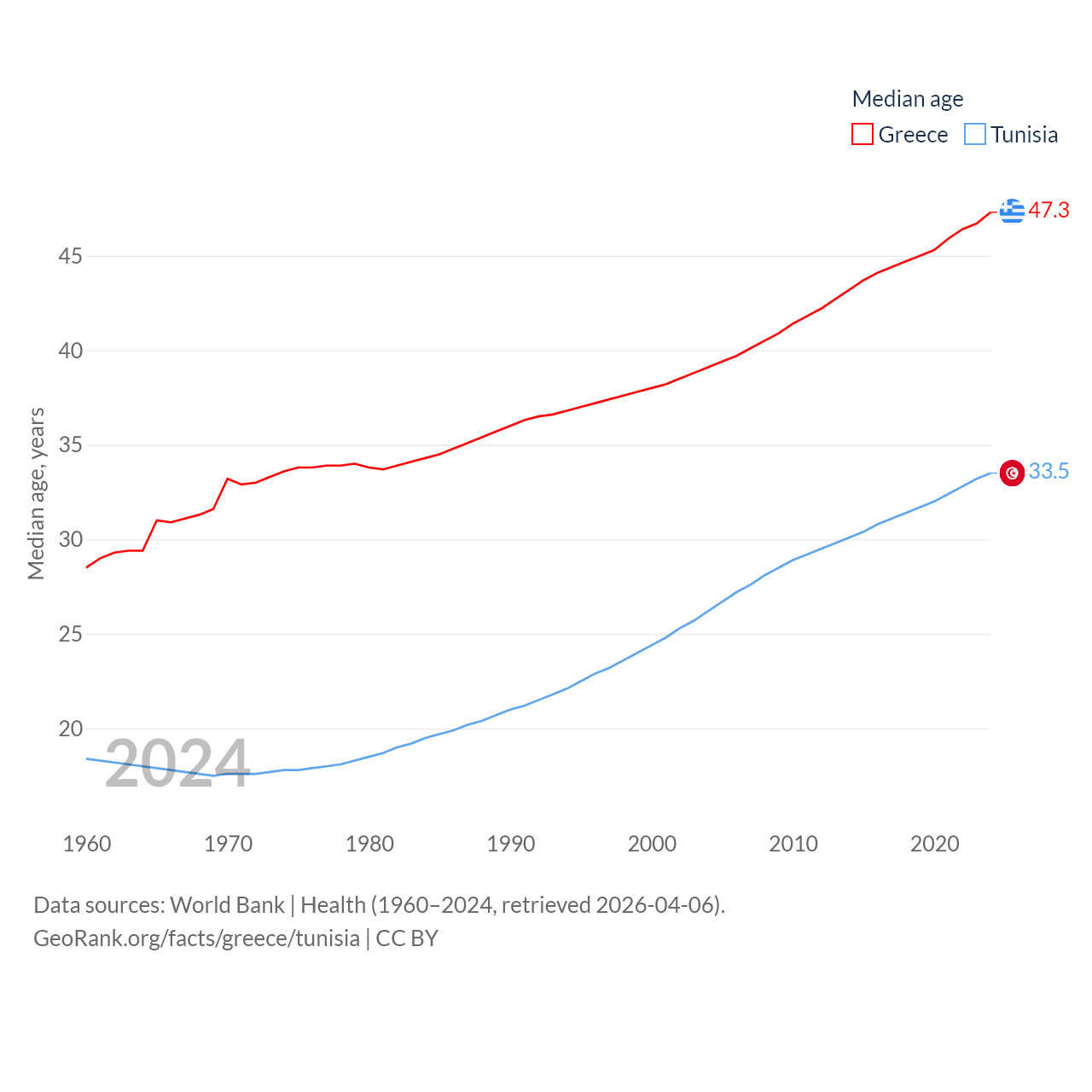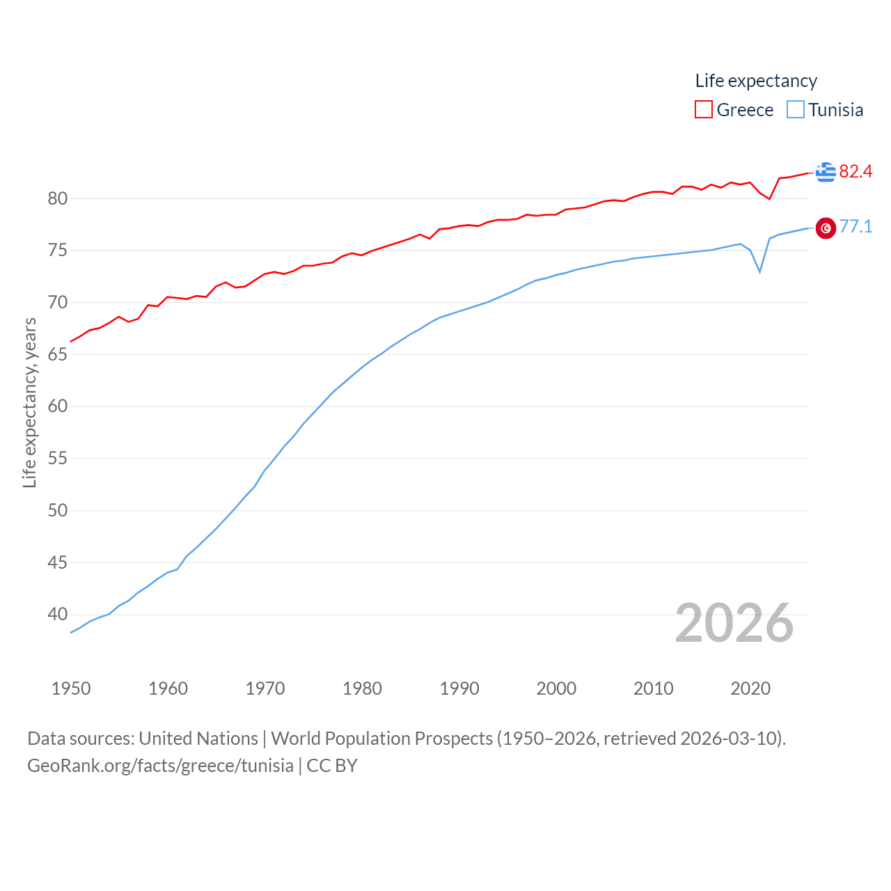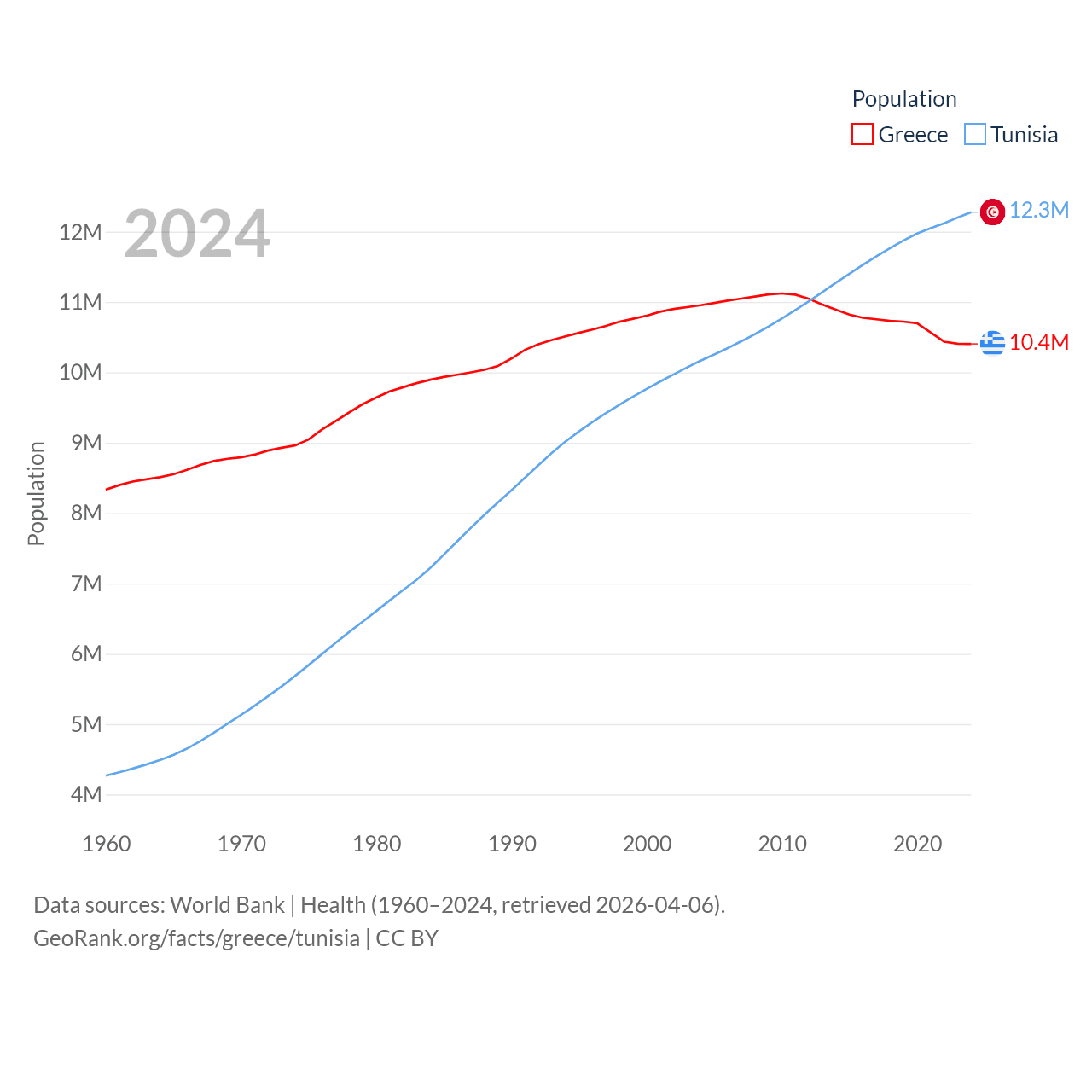Greece has a population of 10.4M (ranked 94/197), compared with 12.3M in Tunisia (ranked 80/197). Greece's land area is 49,769 sq mi versus 59,985 sq mi for Tunisia (ranked 95th vs. 91st).