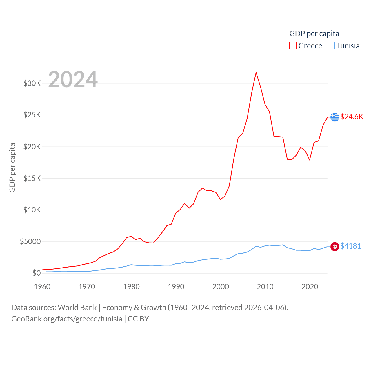By GDP, Greece ranks 53/197 ($256B) and Tunisia ranks 93/197 ($51.3B). By GDP per capita, Greece ranks 49/197 ($24,626), while Tunisia ranks 129/197 ($4,181).