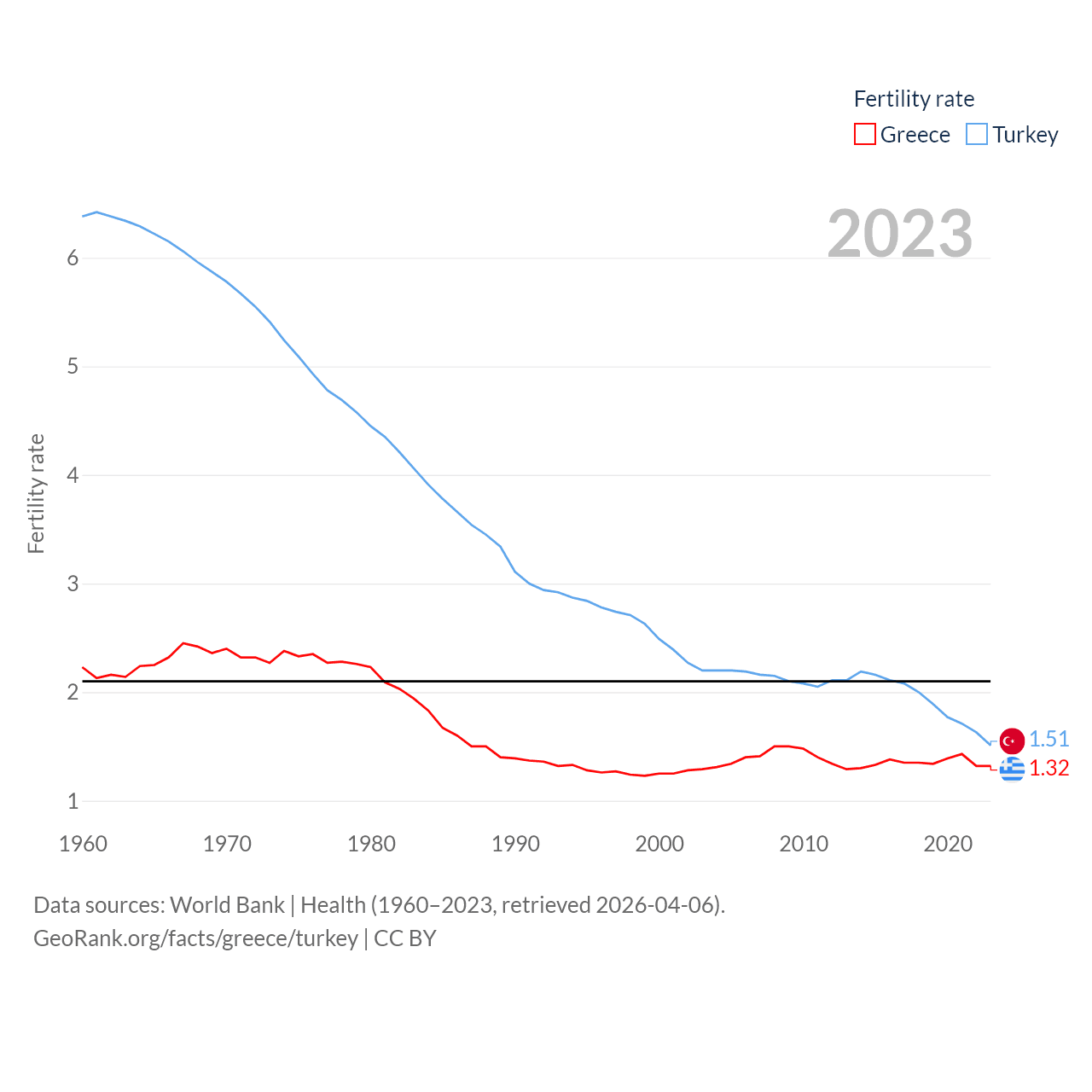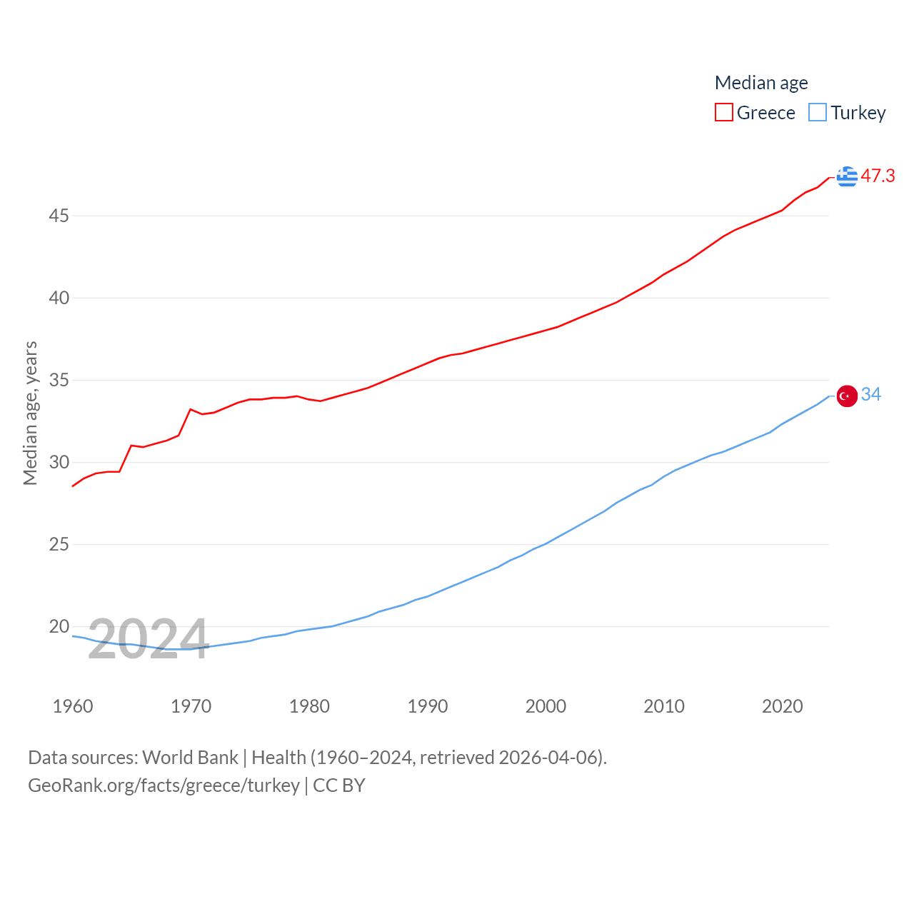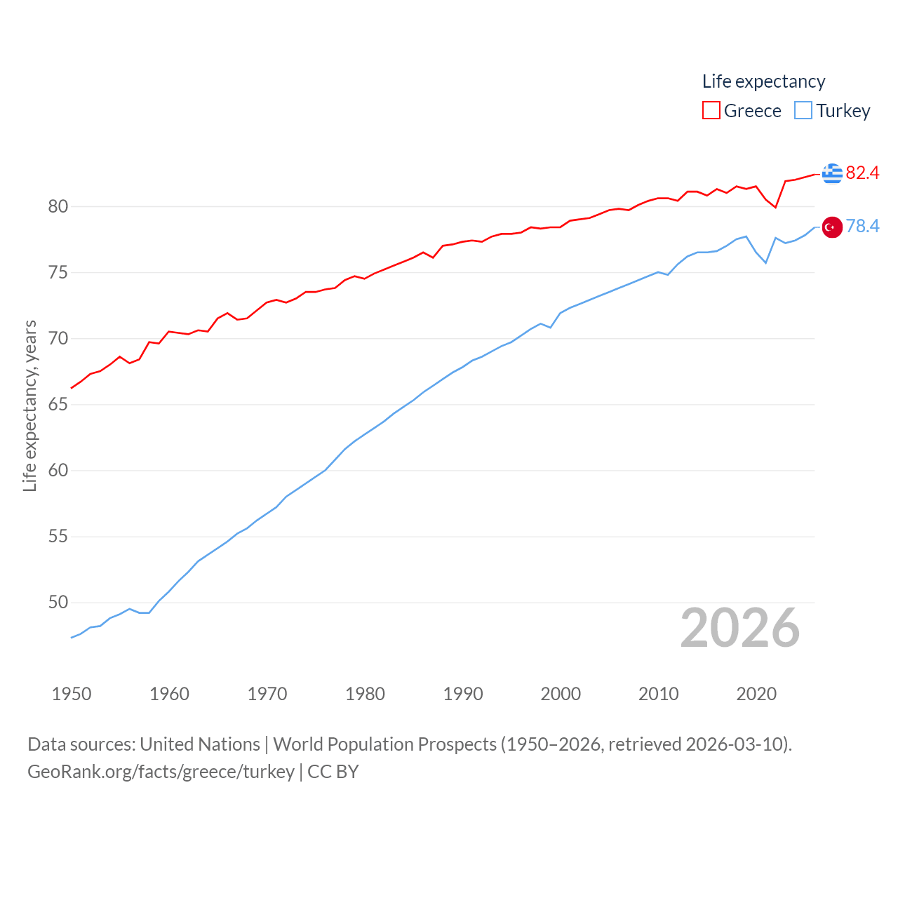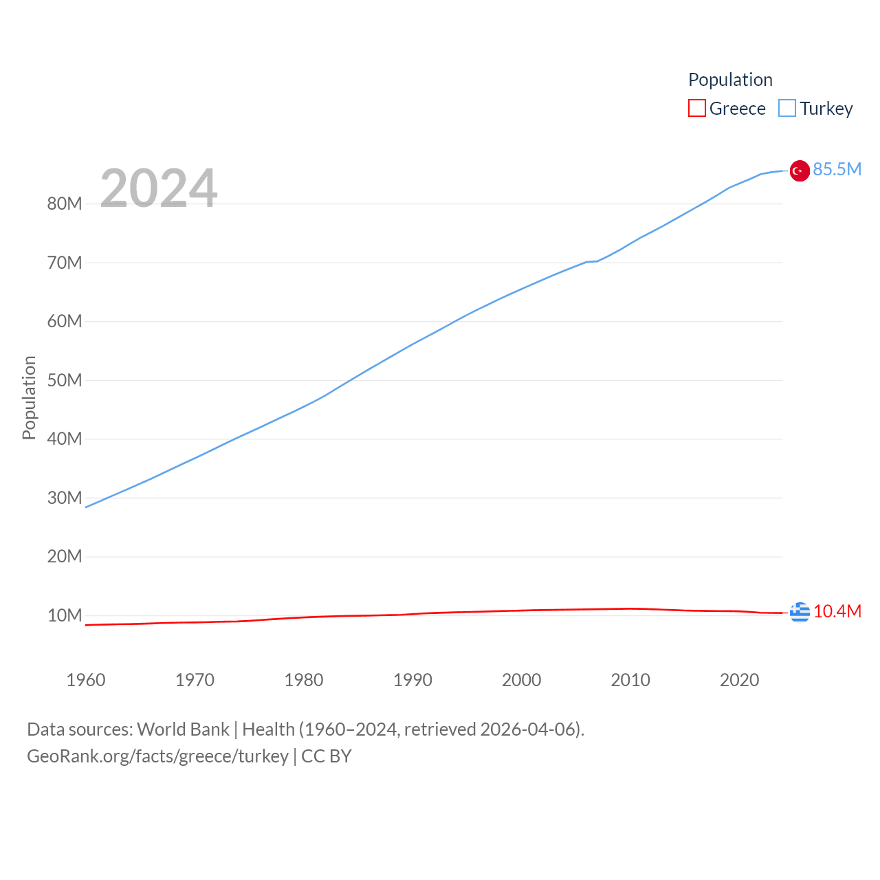 Greece has a population of 10.4M (ranked 94/197), compared with 85.5M in Turkey (ranked 18/197). Greece's land area is 49,769 sq mi versus 297,156 sq mi for Turkey (ranked 95th vs. 36th).