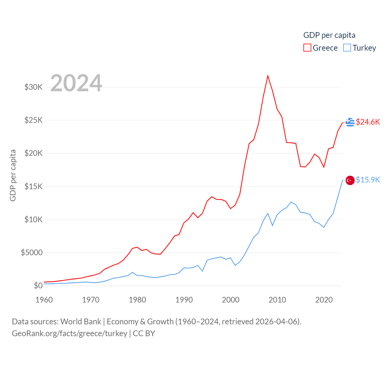 By GDP, Greece ranks 53/197 ($256B) and Turkey ranks 17/197 ($1.36T). By GDP per capita, Greece ranks 49/197 ($24,626), while Turkey ranks 66/197 ($15,893).