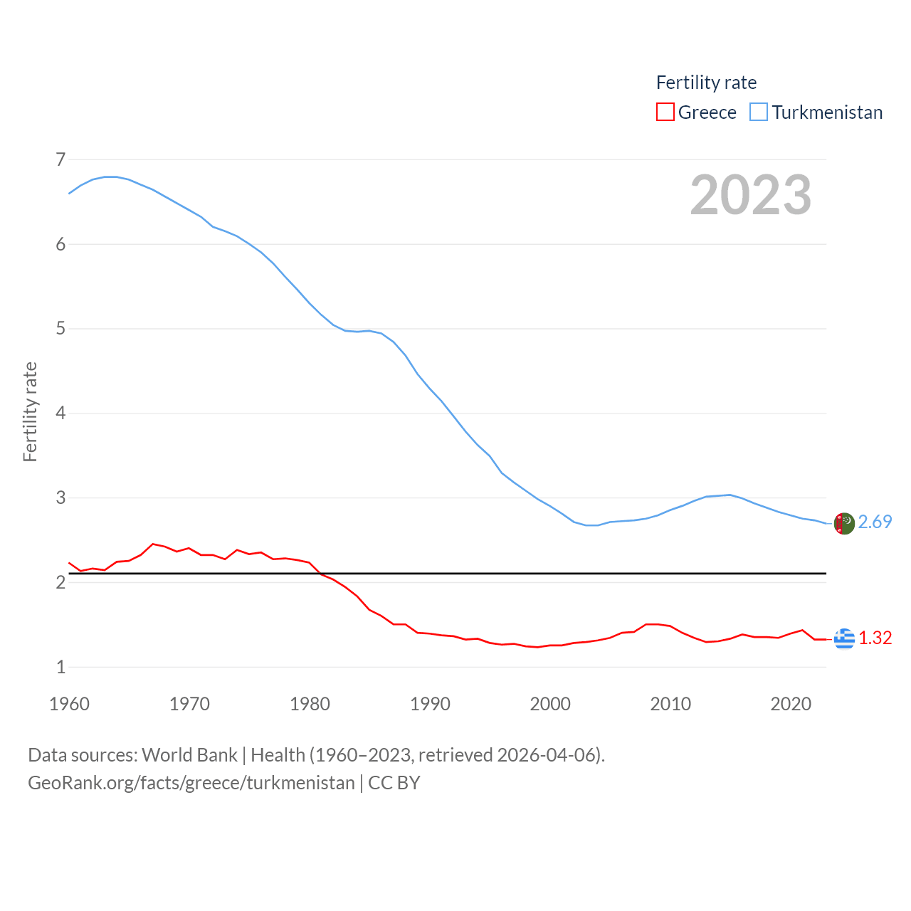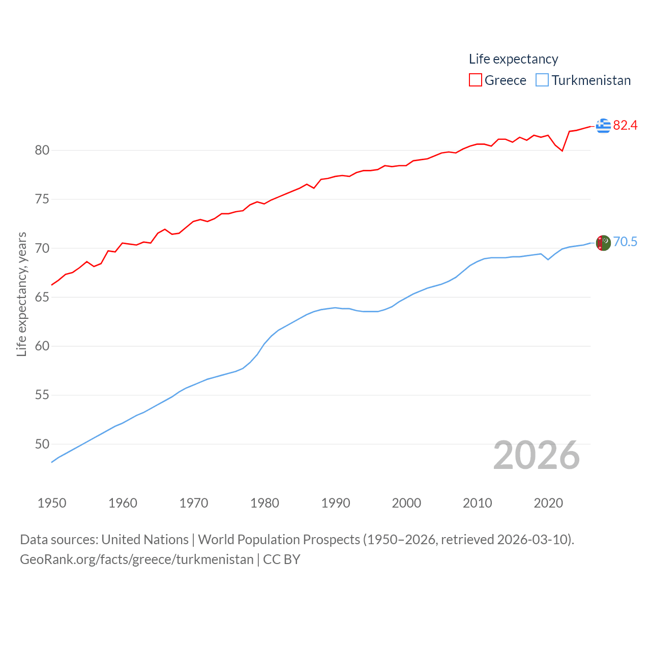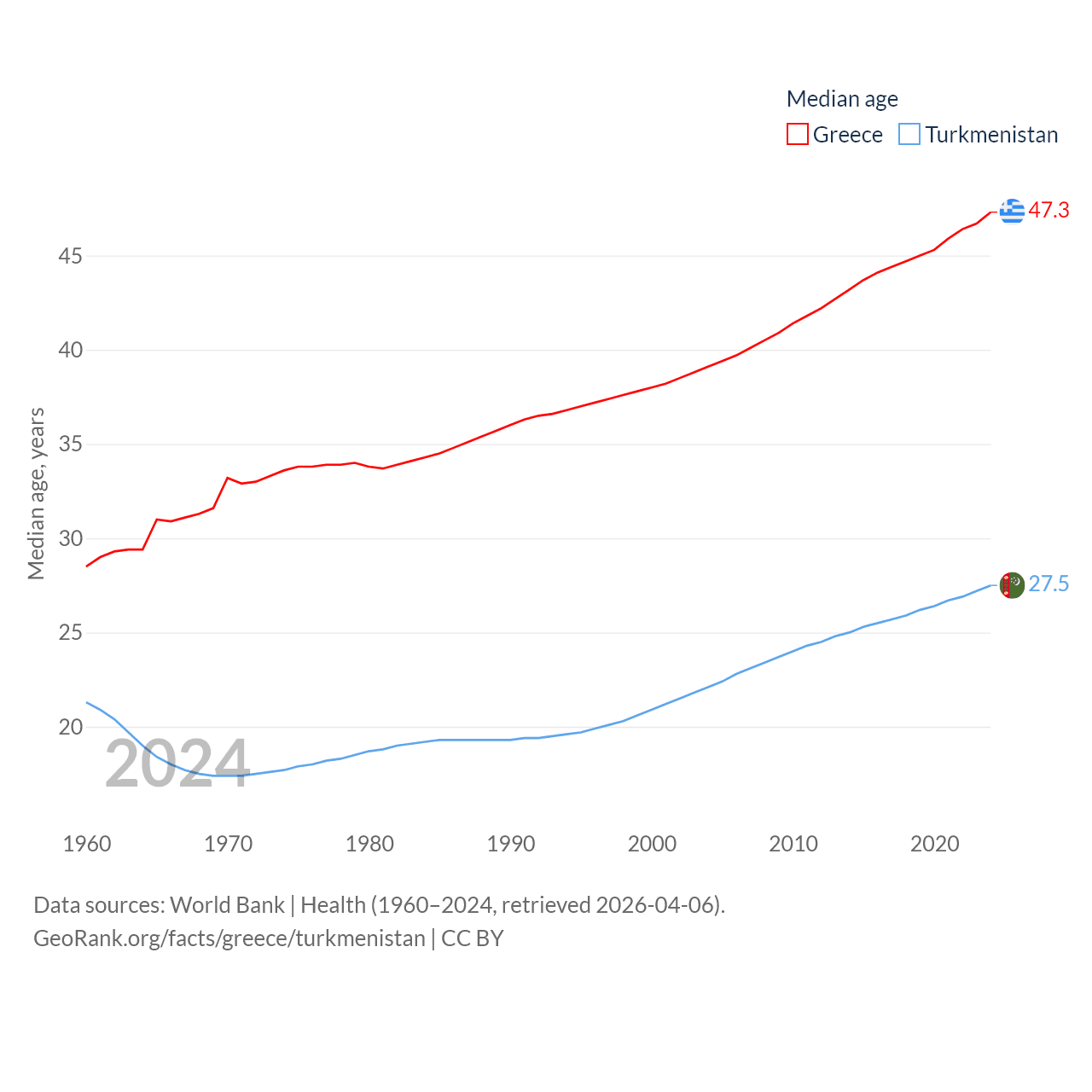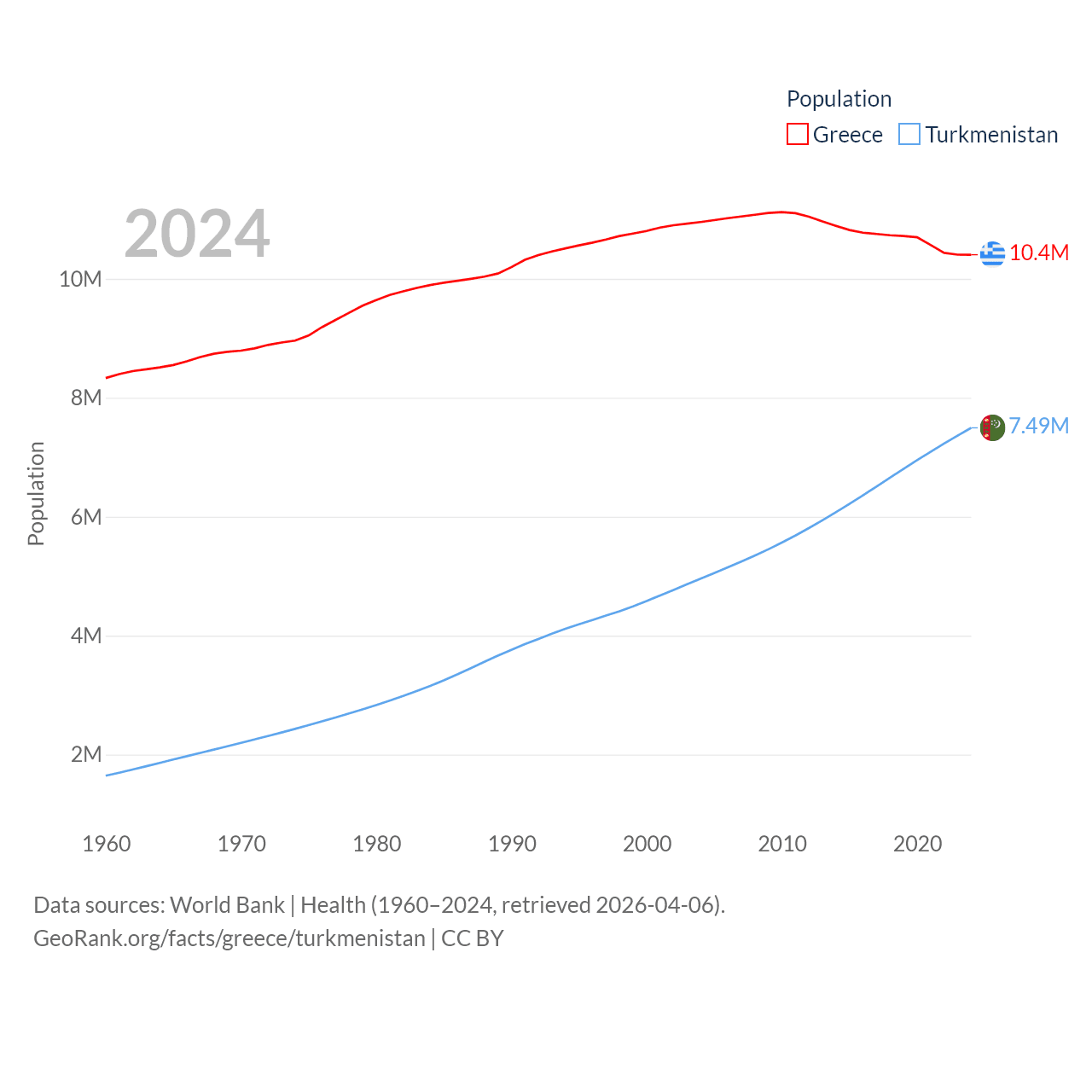 Greece has a population of 10.4M (ranked 94/197), compared with 7.49M in Turkmenistan (ranked 104/197). Greece's land area is 49,769 sq mi versus 181,441 sq mi for Turkmenistan (ranked 95th vs. 53rd).