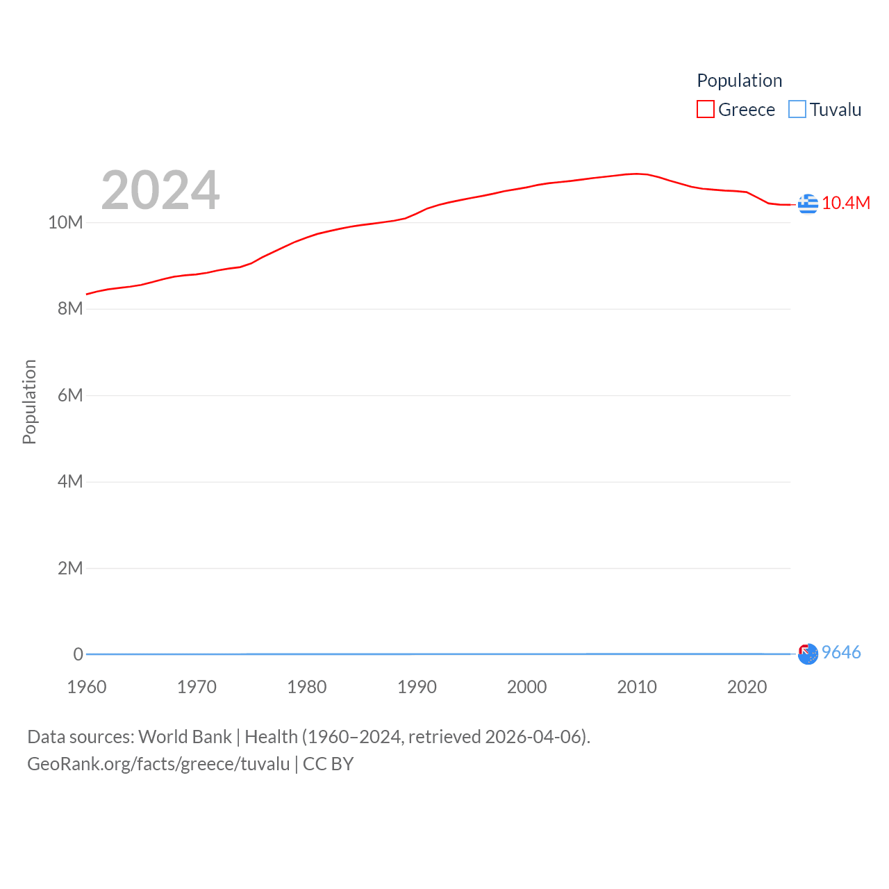 Greece has a population of 10.4M (ranked 94/197), compared with 9.65K in Tuvalu (ranked 196/197). Greece's land area is 49,769 sq mi versus 11.6 sq mi for Tuvalu (ranked 95th vs. 194th).