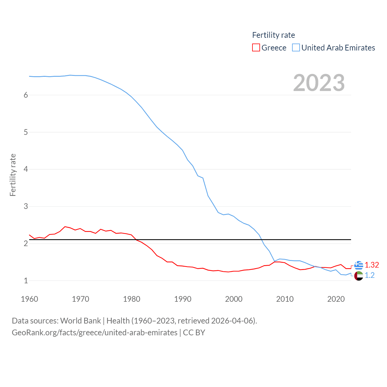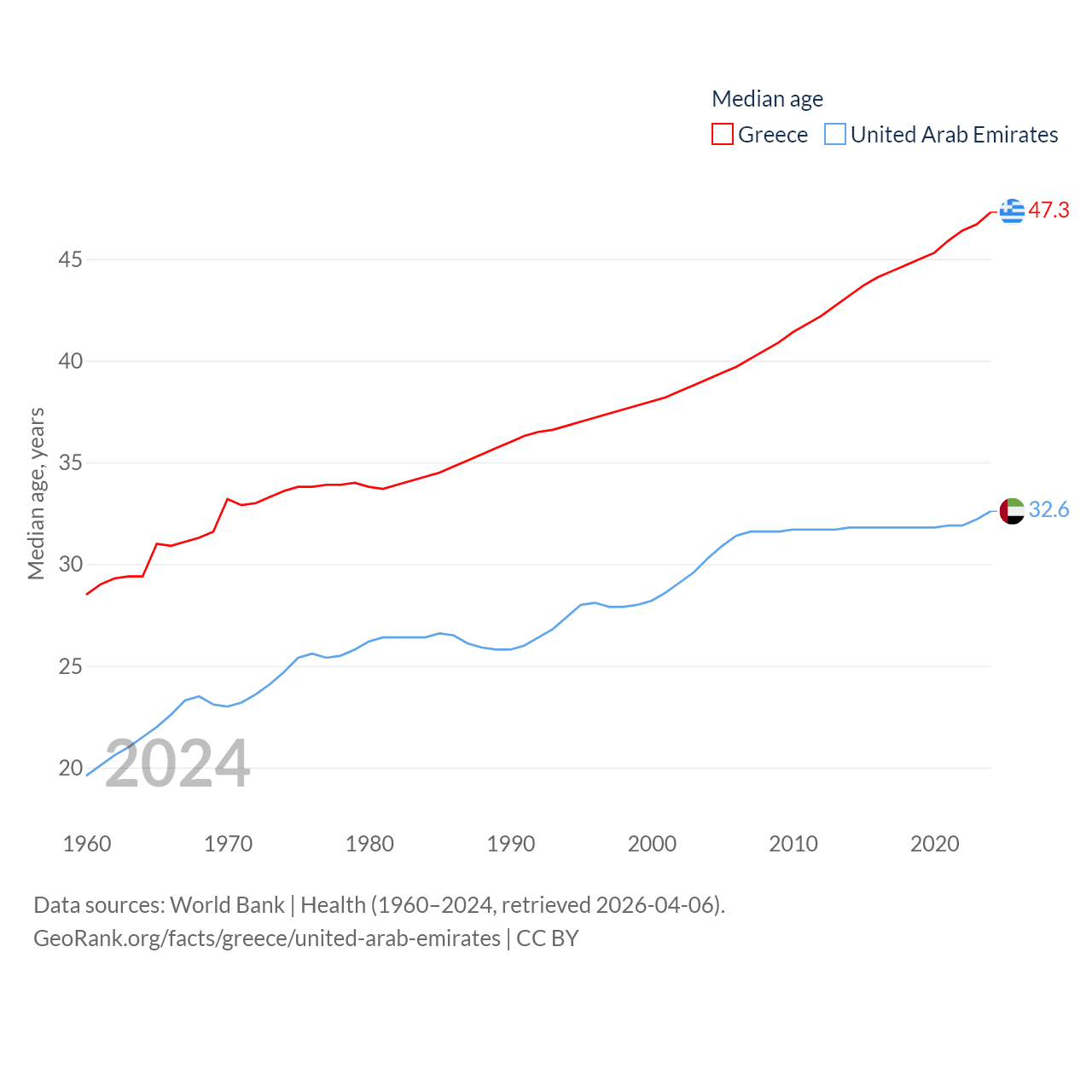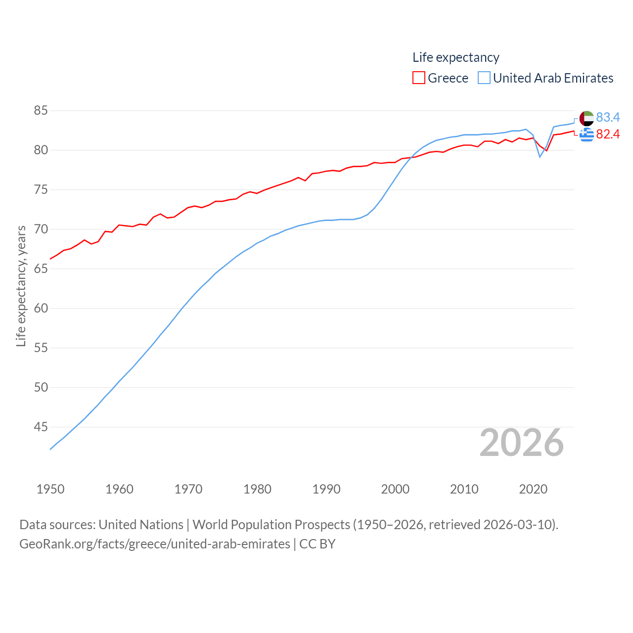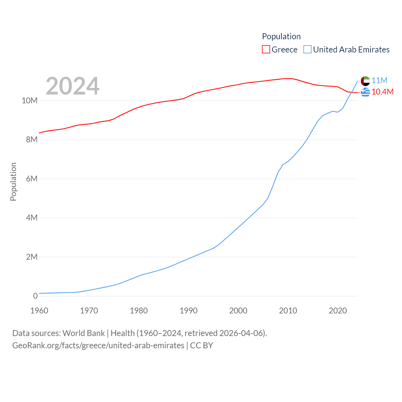 Greece has a population of 10.4M (ranked 94/197), compared with 11M in The United Arab Emirates (ranked 86/197). Greece's land area is 49,769 sq mi versus 27,421 sq mi for The United Arab Emirates (ranked 95th vs. 117th).
