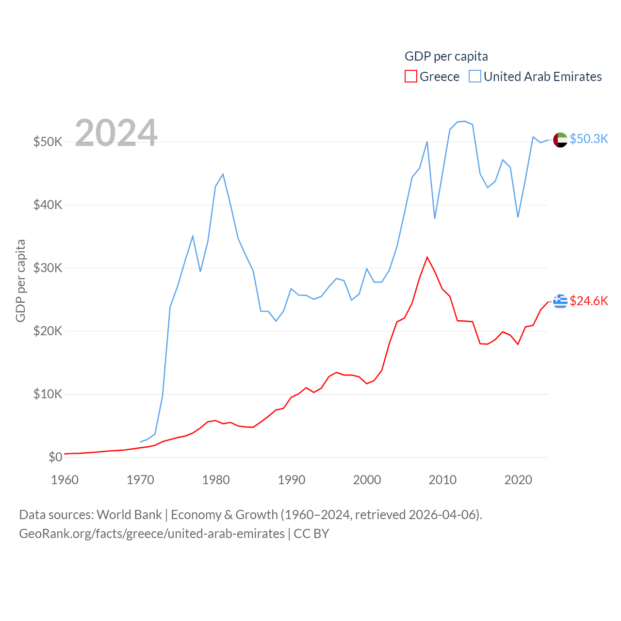 By GDP, Greece ranks 53/197 ($256B) and The United Arab Emirates ranks 27/197 ($552B). By GDP per capita, Greece ranks 49/197 ($24,626), while The United Arab Emirates ranks 24/197 ($50,274).